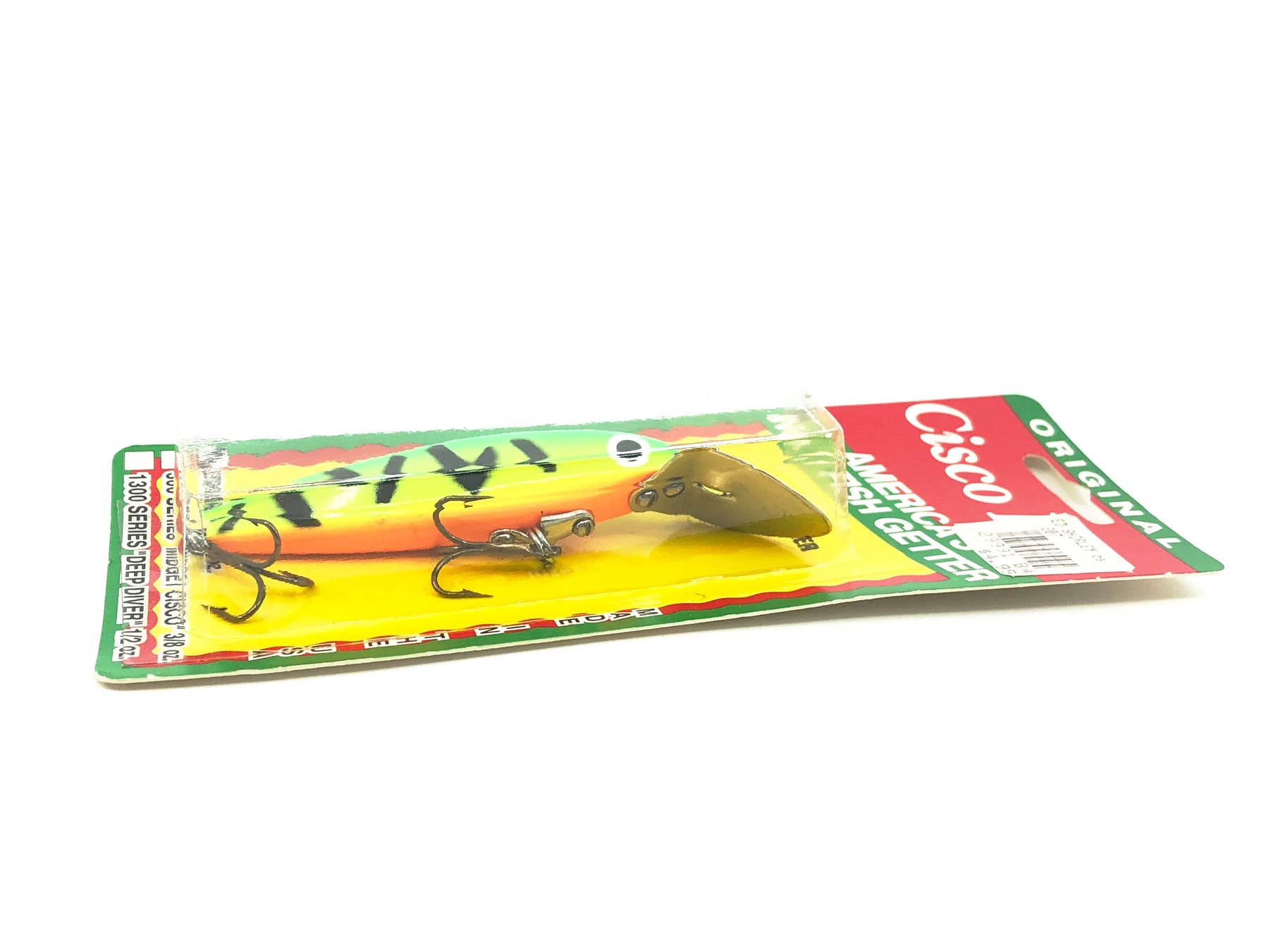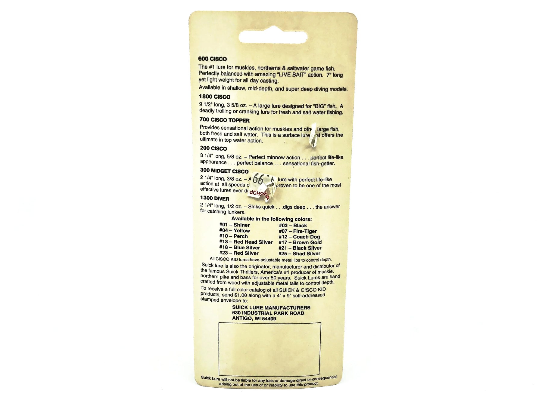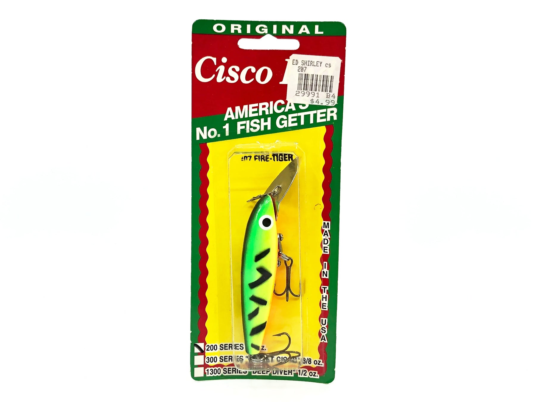 Cisco Kid 200 Series, Firetiger Color on Card. About 4 1/4" long including lip.  Great vintage Cisco Kid lure here.  Great for fishing, walleye, bass, pike!  Great for collecting. This is a newer vintage Cisco Kid but still hard to find! Lure is new on card and the card is in good condition. See photos.  Fish or collect!