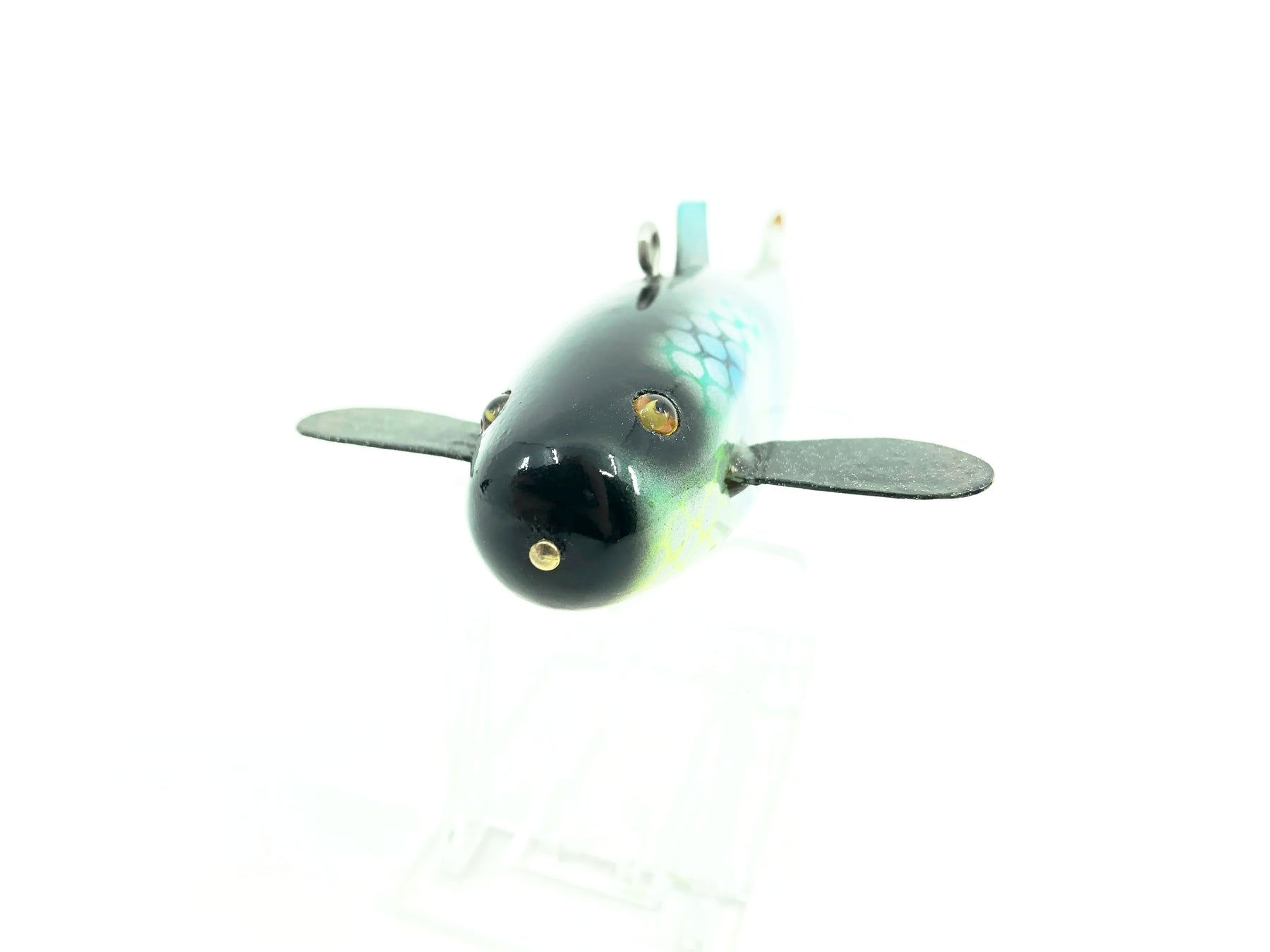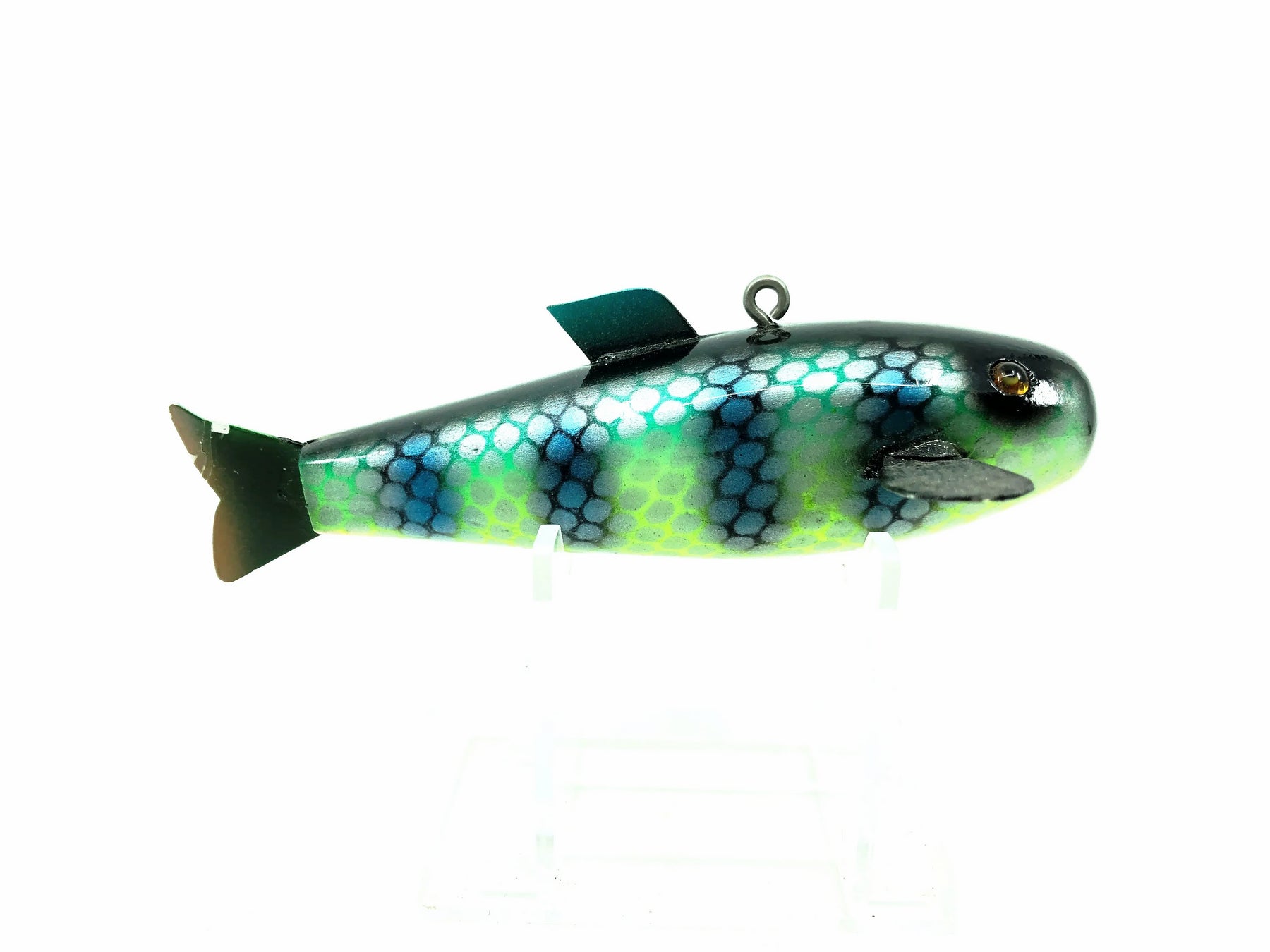 Contemporary Creek Chub Type Spearing Decoy, Electric Perch Color. Great lure here from an unknown maker. Lure is about 4 1/2" long. This decoy has some minor wear and missing paint on the back fin. Great folk art type decoy for your collection! Wooden with glass eyes. See photos. A cool piece despite some minor wear.