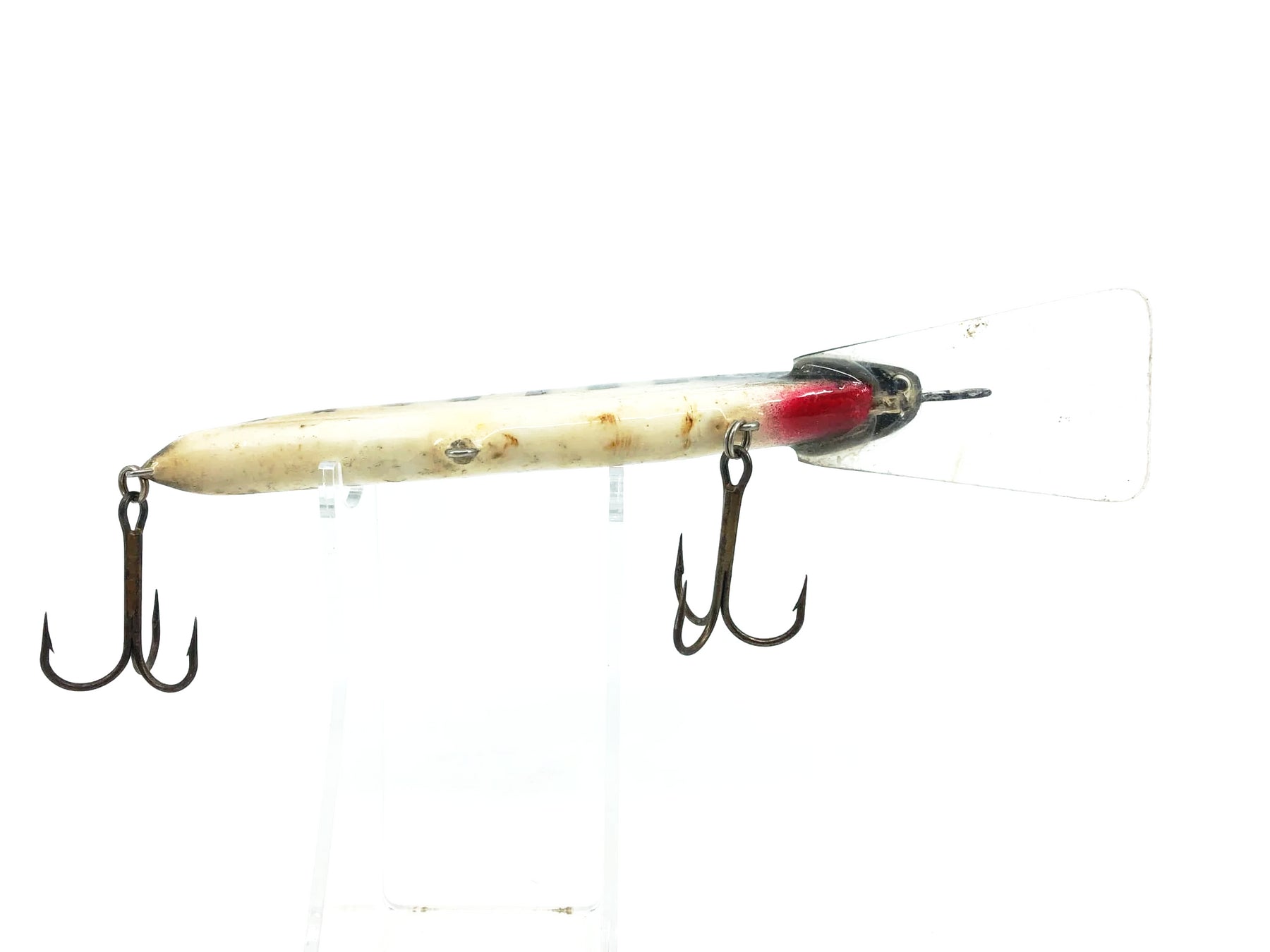 Crane 606 Musky Bait, Black Scale Perch/White Belly Color.  About 6" long body not including the lip.  Bait is used with some minor wear and missing middle hook but overall good condition. See photos.  Great classic bait here.