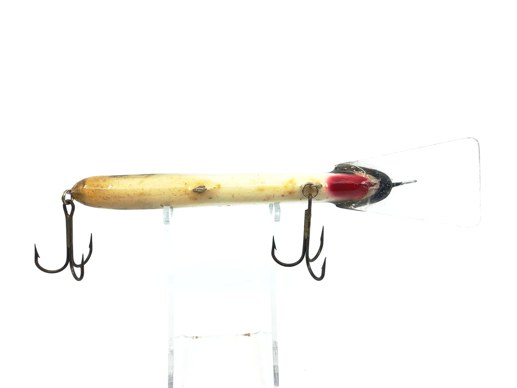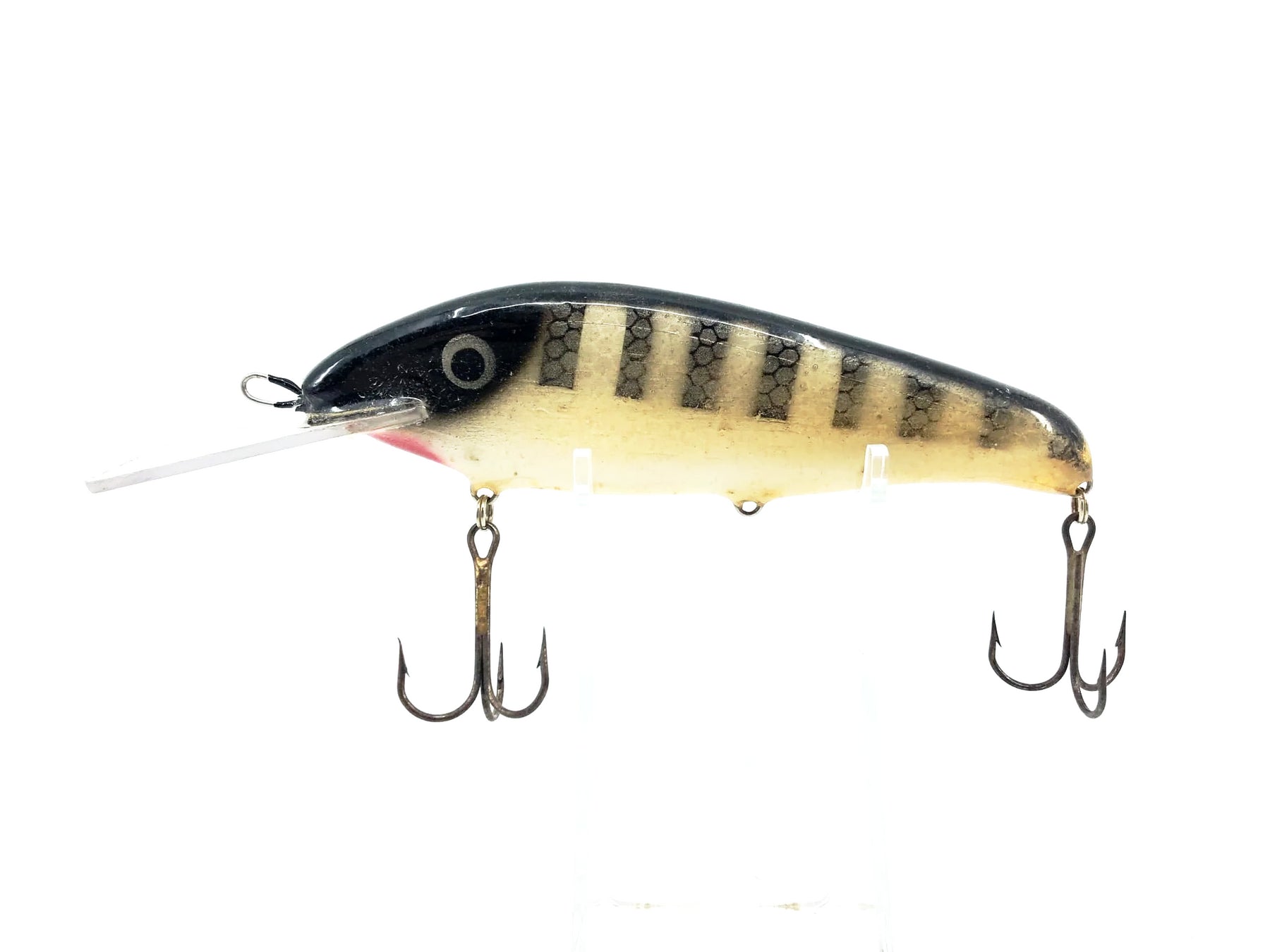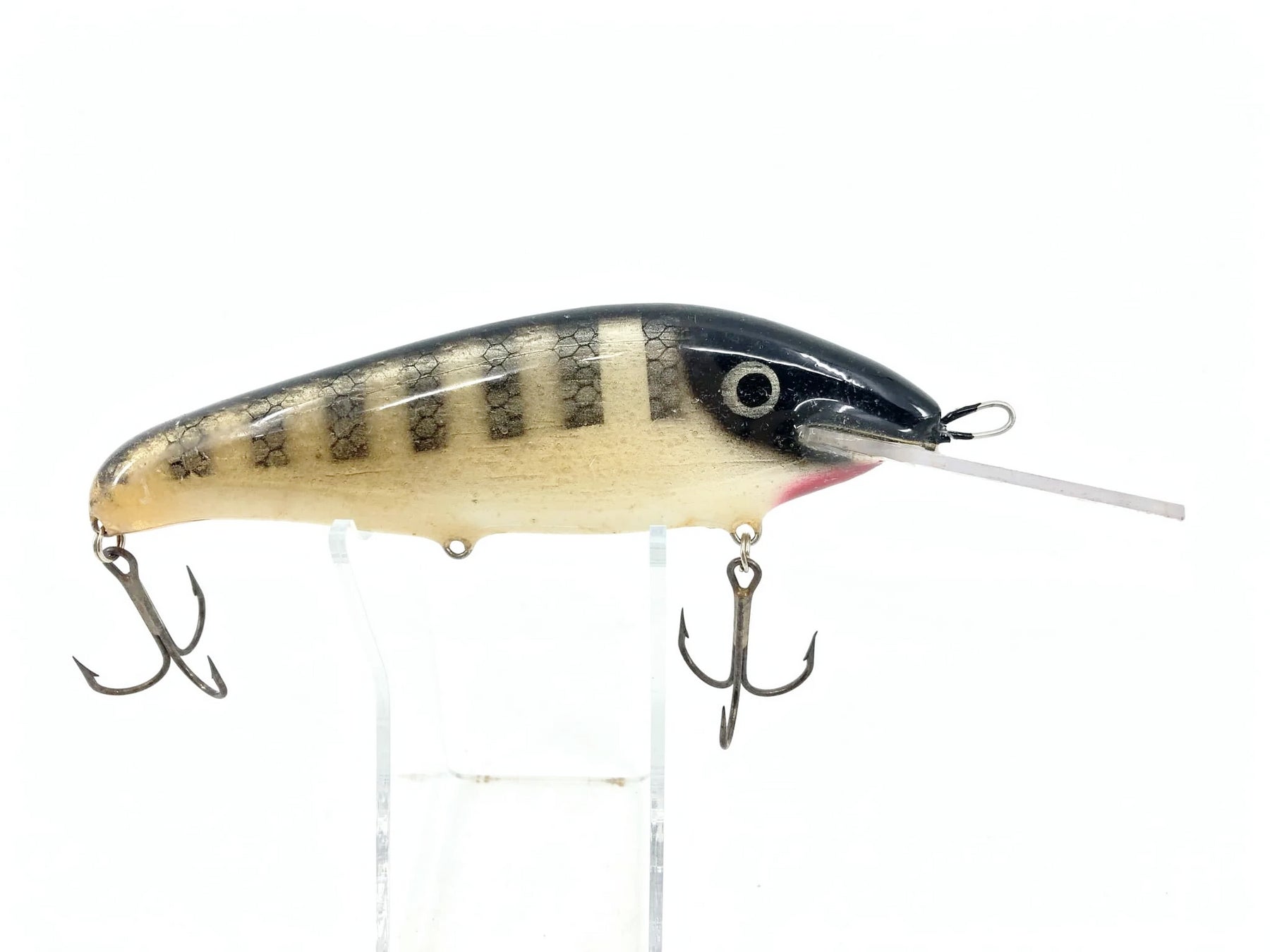 Crane 606 Musky Bait, Black Scale Perch/White Belly Color. About 6" long body not including the lip. Bait is used with some minor wear and missing middle hook but overall good condition. See photos. Great classic bait here.