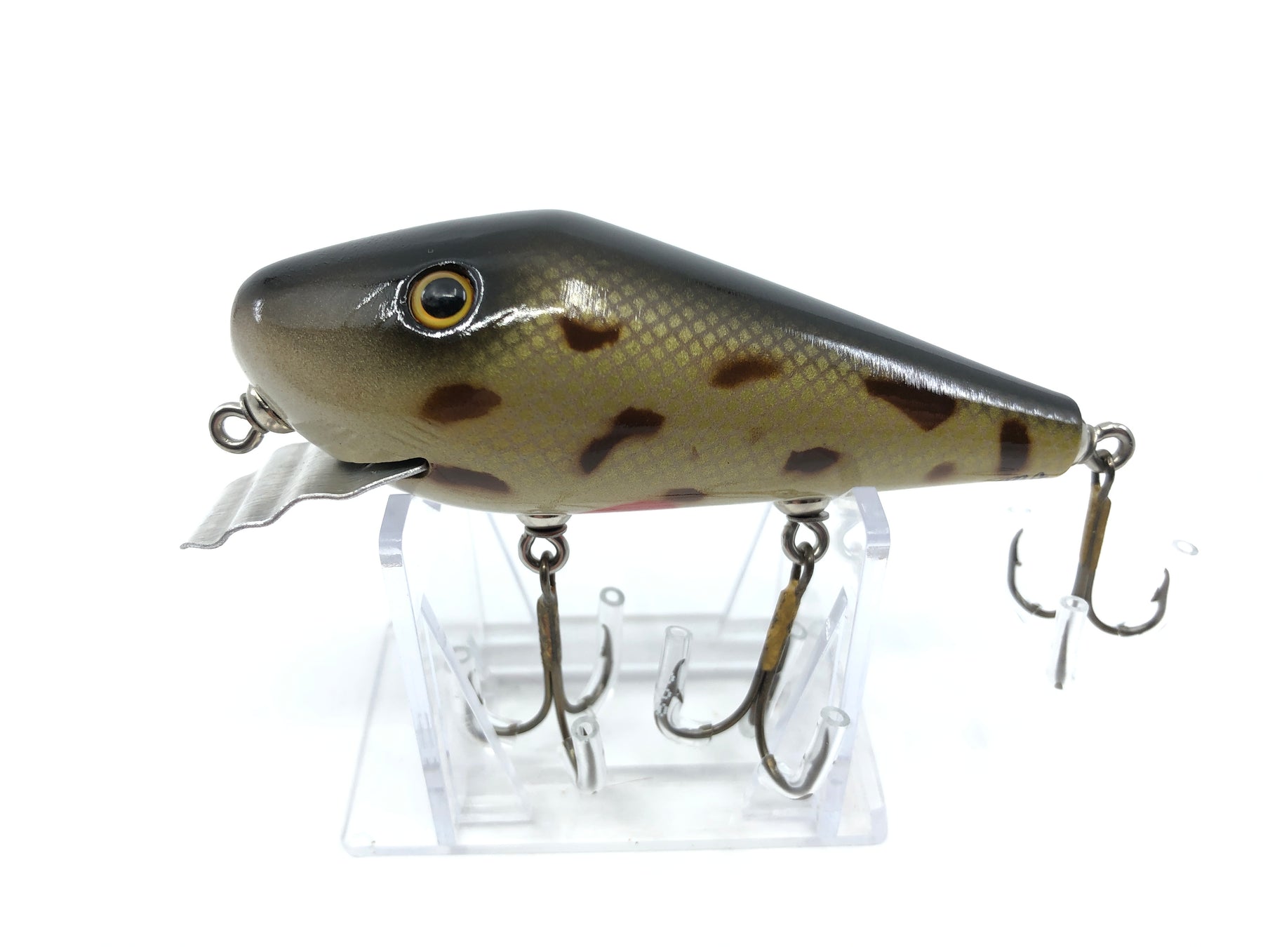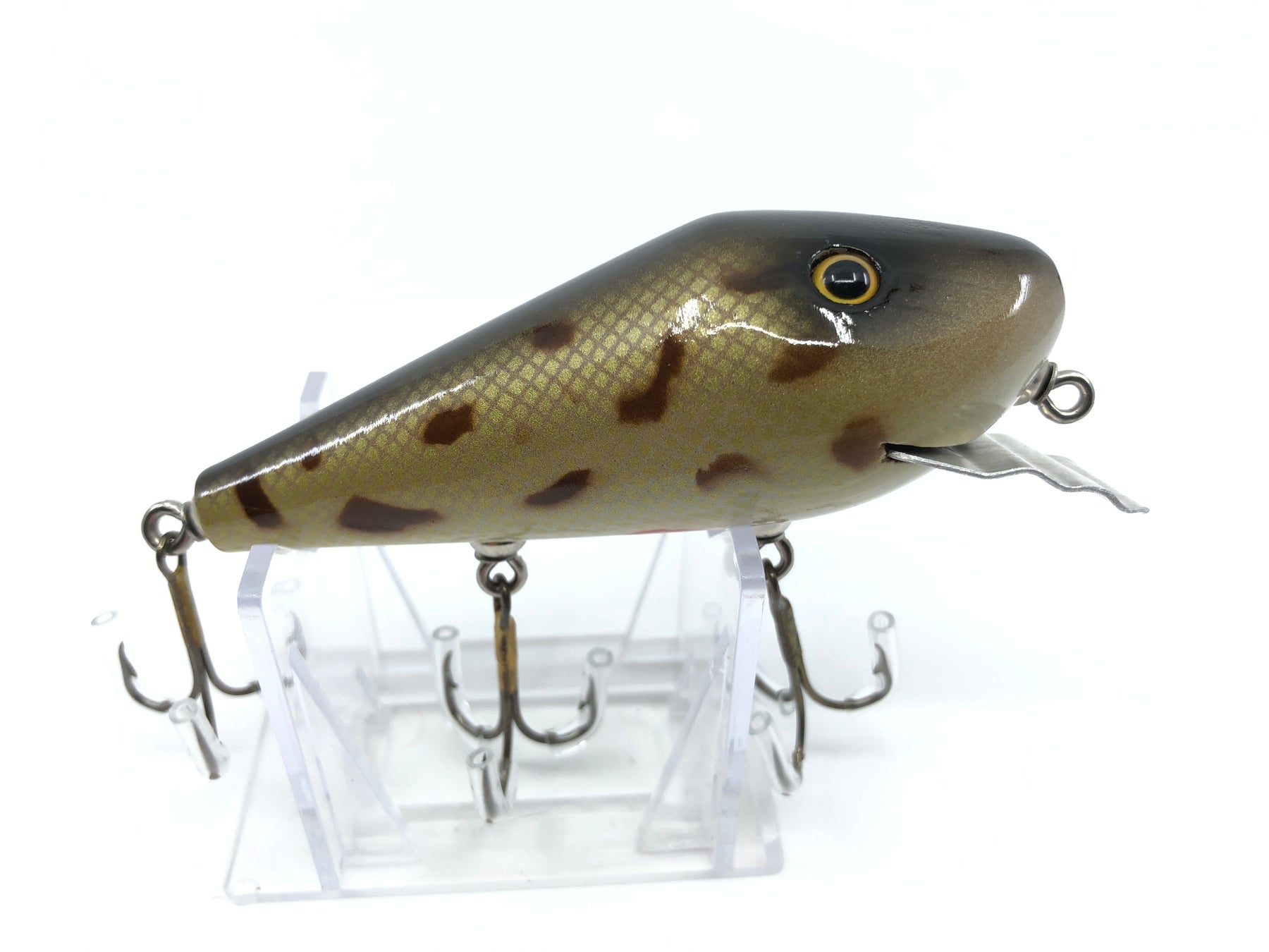 Chautauqua Special Order Wooden Chubby Sucker in Spotted Hogsucker Color. About 3 1/2" wood body. Hard carved, hand painted work of art here. Fish or collect. From the master at Chautauqua comes their take on the famous sucker bait. Take a look at the photos and don't hesitate as this one won't last long. This is absolutely a thing of beauty.
