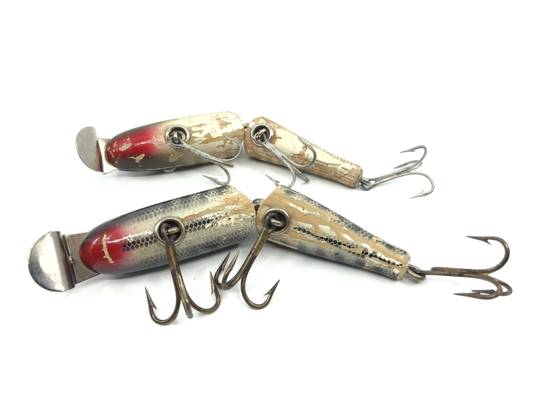Creek Chub Wooden Jointed Pikies Lot of Two 2600 One Black Scale. About 4 1/2" long. Used with wear as shown, see photos. These guys are warriors but they catch fish. One is a black scale Creek Chub. The other I am not sure who made. Take them back out fishing, fix up, or add to a cool display. The Creek Chub Jointed Pikie was one of the best lures ever made. Slays Bass, Pike, Musky.