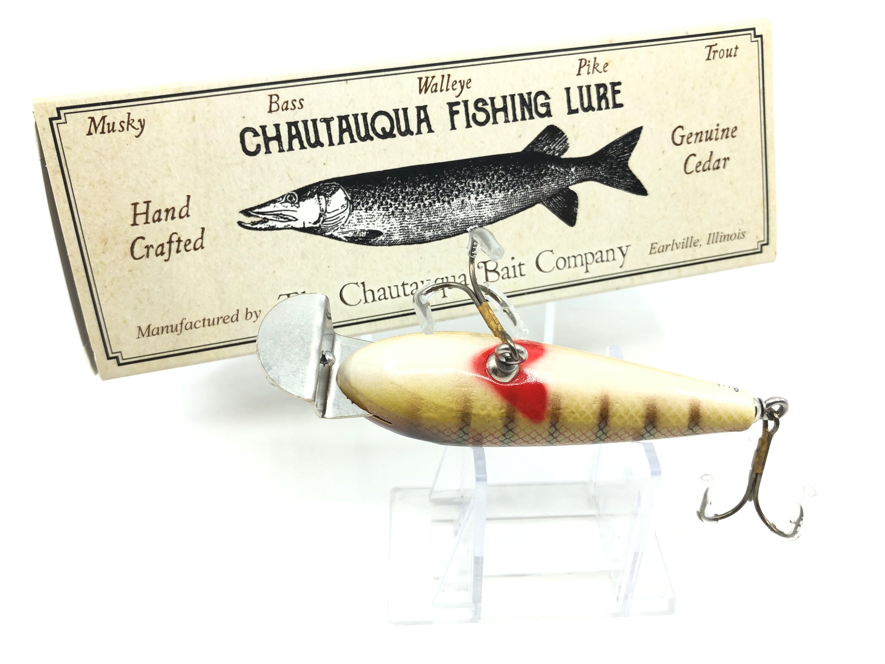 Chautauqua Wooden Wiggler Red Perch Color Custom Lure. The latest creation from the artist at Chautauqua, the Wiggler. Each lure is hand made, crafted and tank tested. Slight variations on each lure. Measure roughly about 3 1/2" long. Each lure hand painted with gill marks applied. Artist initials on each lure. Truly a work of art but equally fine to fish. Like stepping back in time to what fishing lures used to be. These are not expected to last long so grab them while you can.