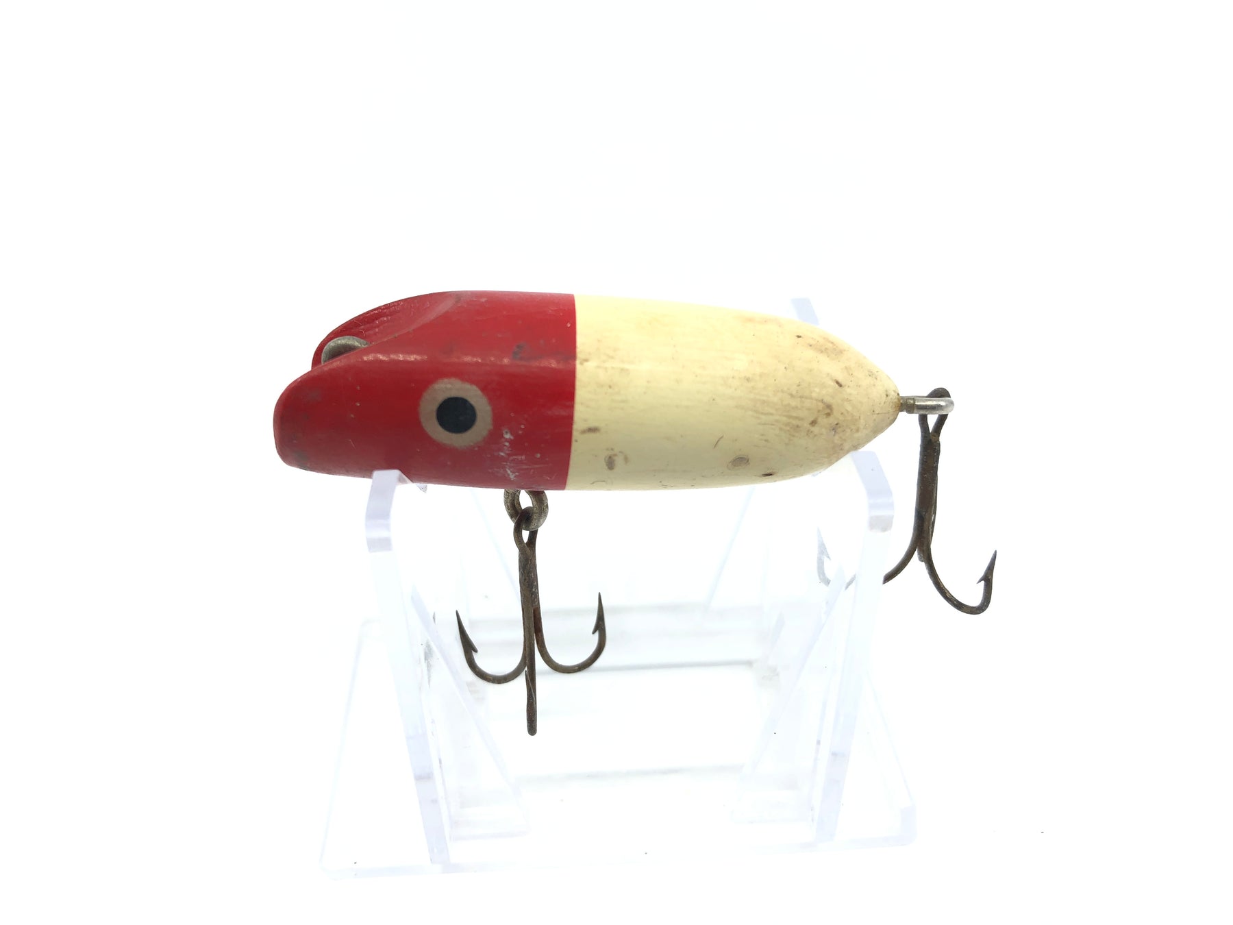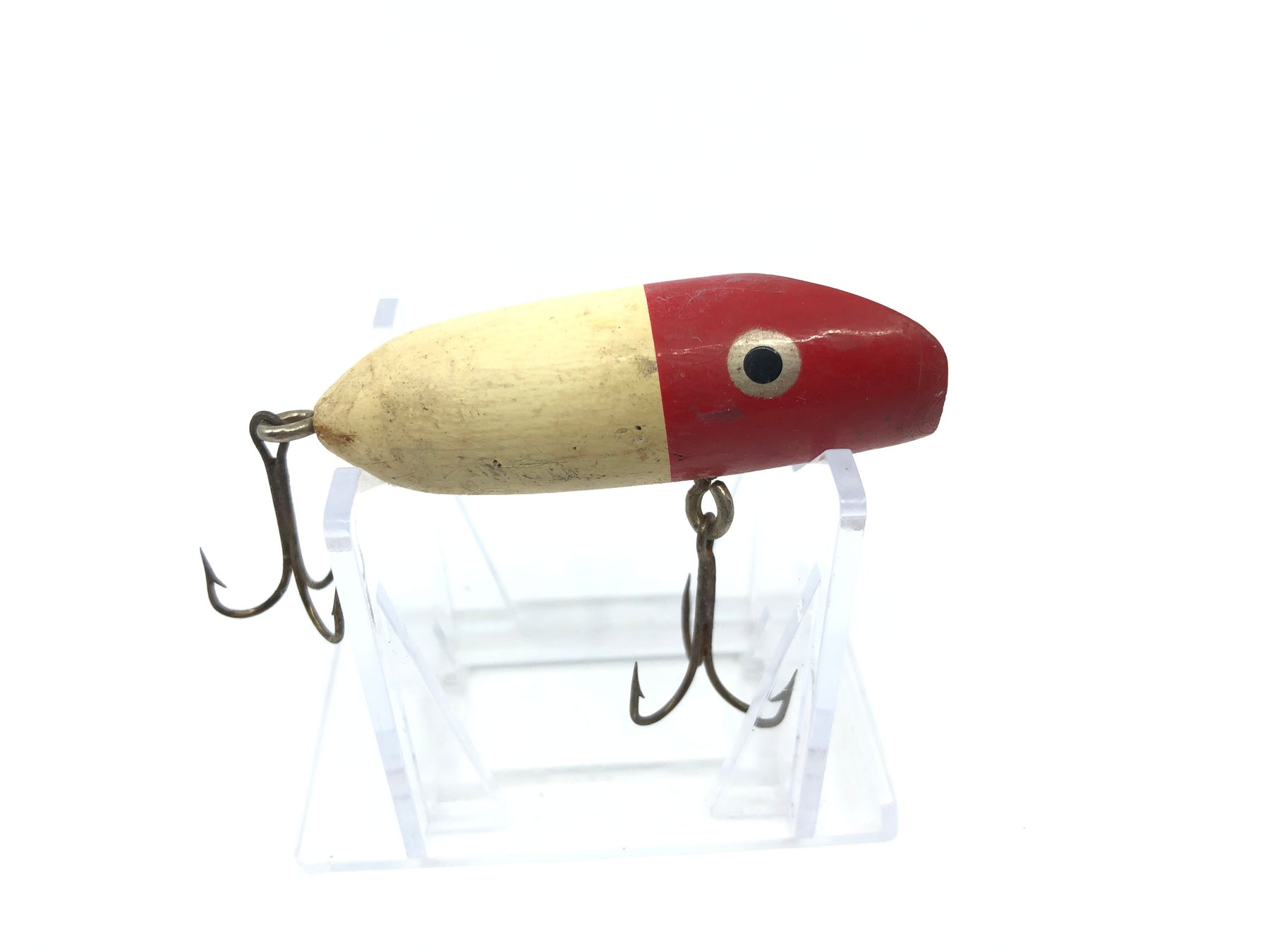 Wooden Small Bass Oreno Type Lure Red and White. About 2 1/4" long. Used with some wear, will probably clean up a little. Still overall ok condition. Will fish or display fine. See photos. Unsure of maker but cool little vintage bait.