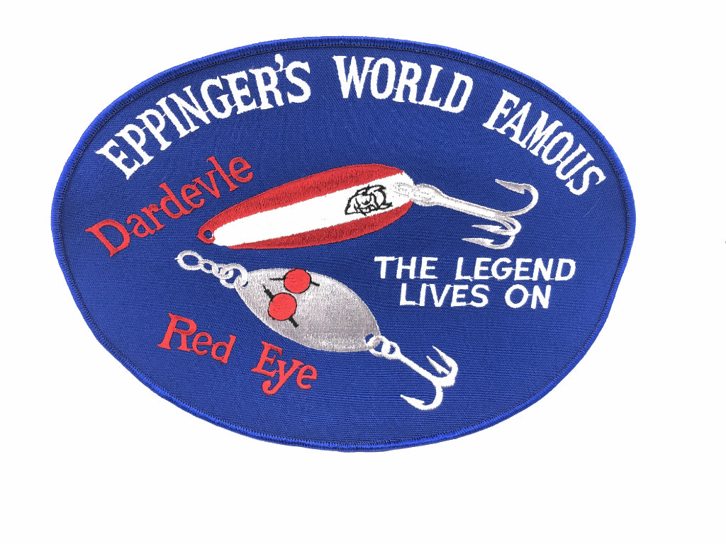Eppinger World Famous Dardevle Red Eye Patch Huge Size.  About 10 1/2" x 7 1/2".  Unused and in great overall condition.  See photos.  These look awesome with your fishing lure display or put on your fishing gear.  Add to your collection today!  Tougher patch to find.