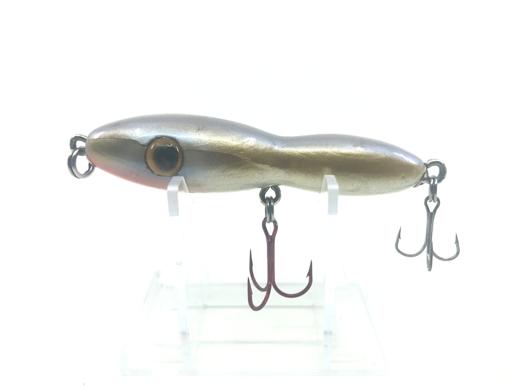 Funky Wooden Minnow Silver and Orange. Lure is about 3 3/4" long. Great color and some paint cracks, but in overall good condition. Great for fishing or collection.