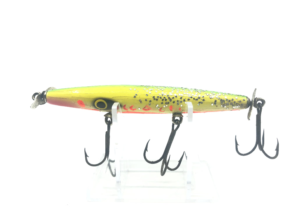 Wooden Bass Baffler Lure Sparkly Green Yellow and Orange Color. About 4 3/4" long. Used but in good condition with some paint cracks and fisherman overpaint on the belly, see photos. Great to fish or collect.