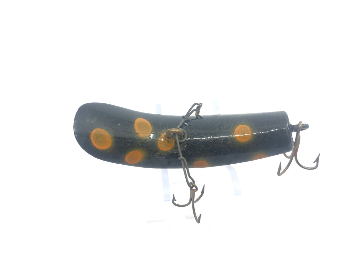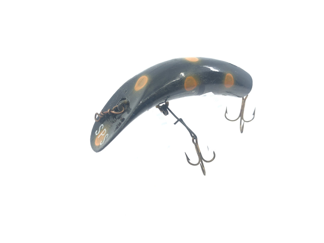 Wooden Helin Flatfish SPS Black With Orange Spots. This lure is about 2 3/4" long. In great shape. For fishing or collection.  Tough to find these SPS lures.