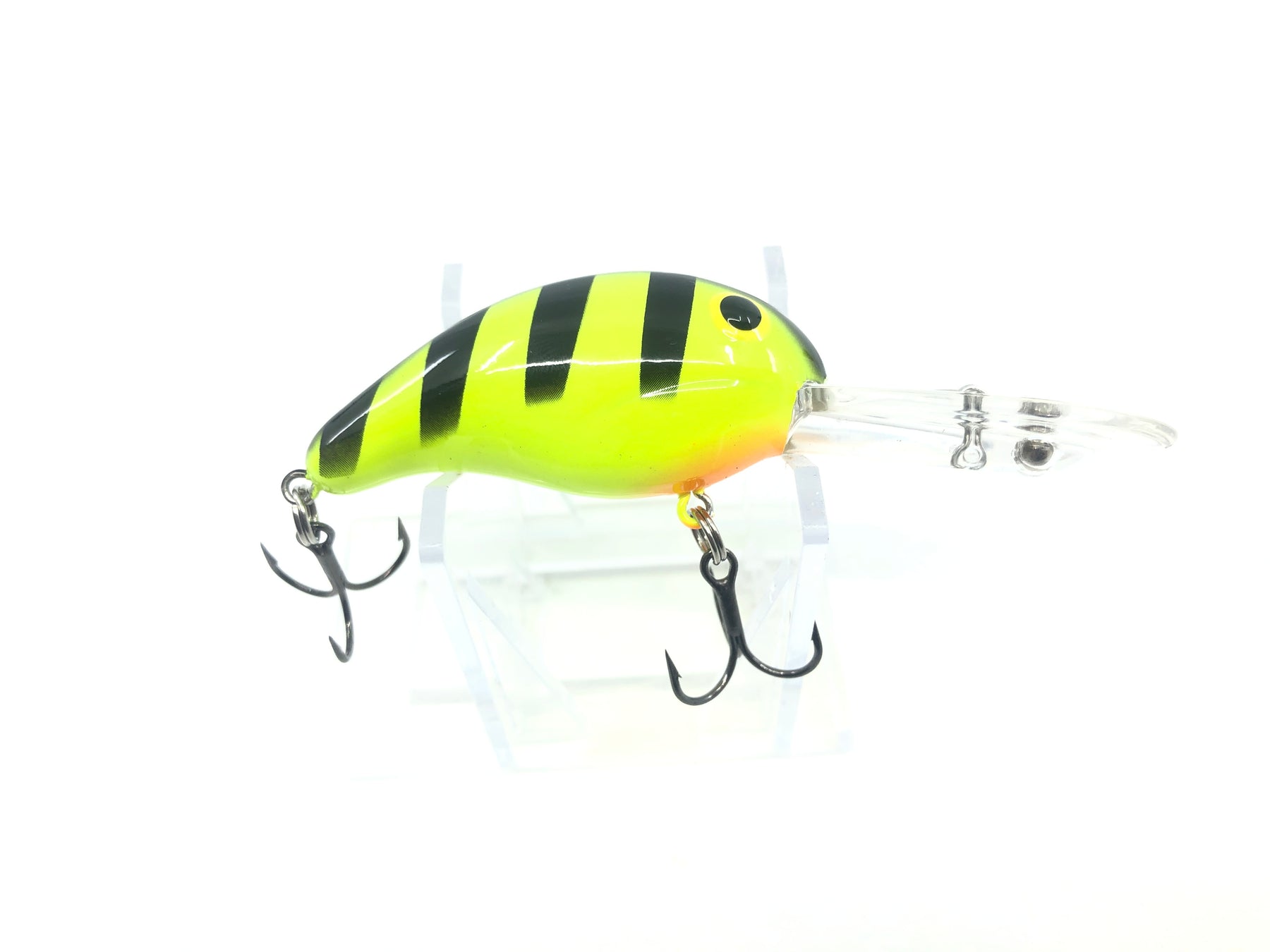 Bandit Series 300 Color 06 Chartreuse Black Stripes. At about 3 1/2" long overall, 2" body, this lure is in great condition with very little wear or signs of use. This lure would look great in your collection or tackle box. See photos.