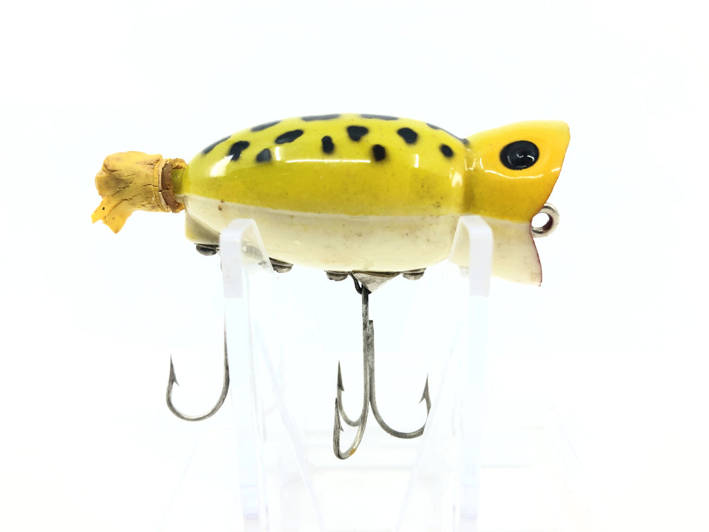 Arbogast Hula Popper Frog. At about 2 1/4" long this popper is in amazing condition. If it wasn't for the miss tail this lure might be in new like condition. One very notable quality of this lure is the location and condition of the Hula Popper label. This lure would be perfect for your display.