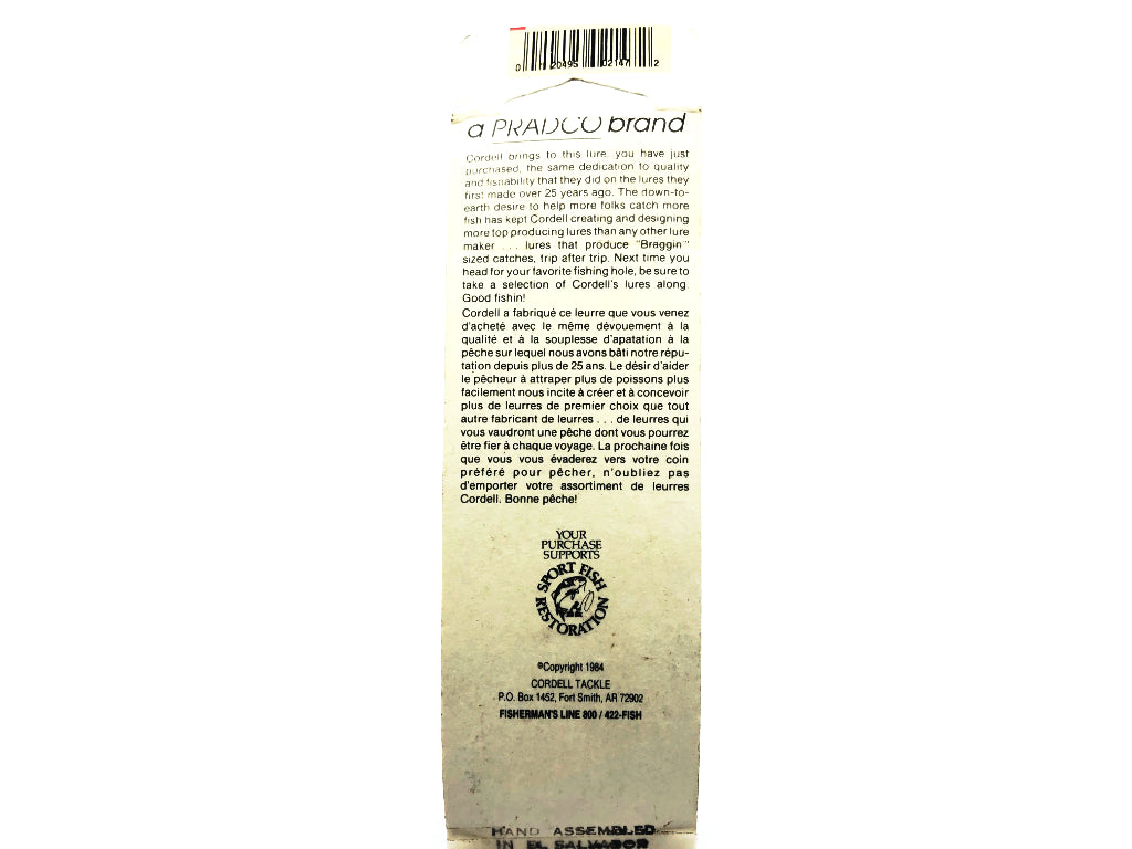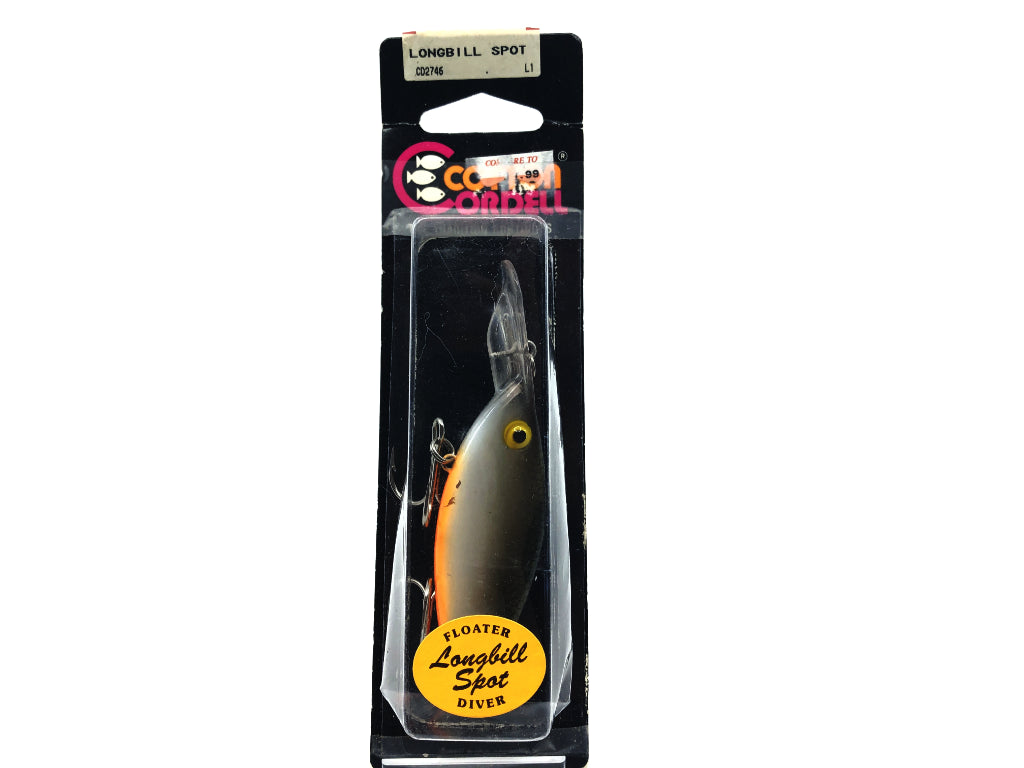 Cotton Cordell Longbill Spot Color 46 Arkansas Shiner on Card. At about 4 1/2" long including the lip. The lure is in new condition but the bubble on the card is taped on. This lure is from around 1984. See photos.