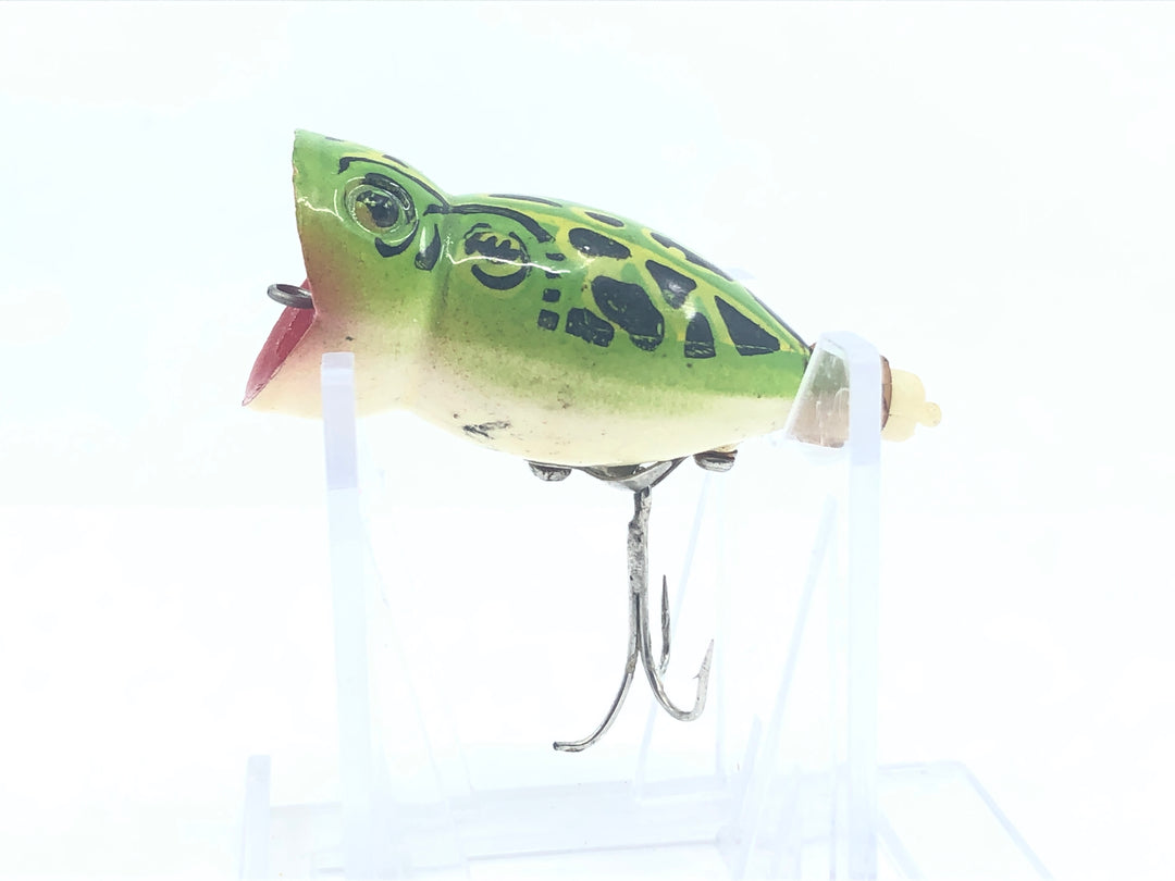 Arbogast Hula Popper Frog. At about 2" long this classic top water bait has a prestine paint job with no faded and very little wear. However, the tail is missing. See photos.