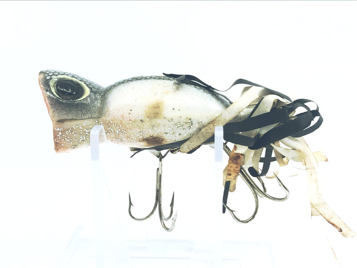 Arbogast Hula Popper Black and Sparkles. At about 2 1/2" long this larger hula popper is in good condition with very little wear but some stains. This iconic lure would look perfect in your collection or your tackle box. See photos.