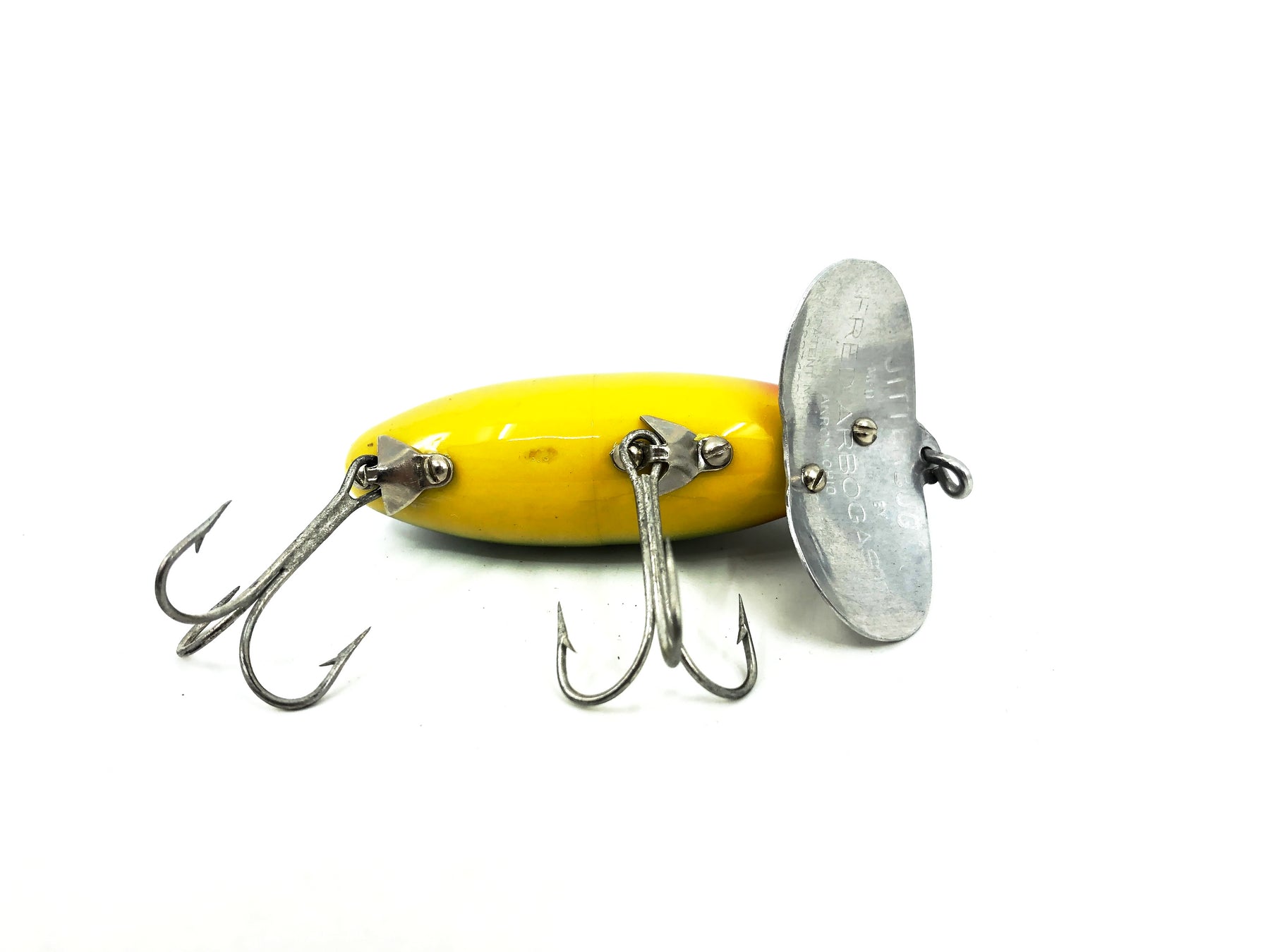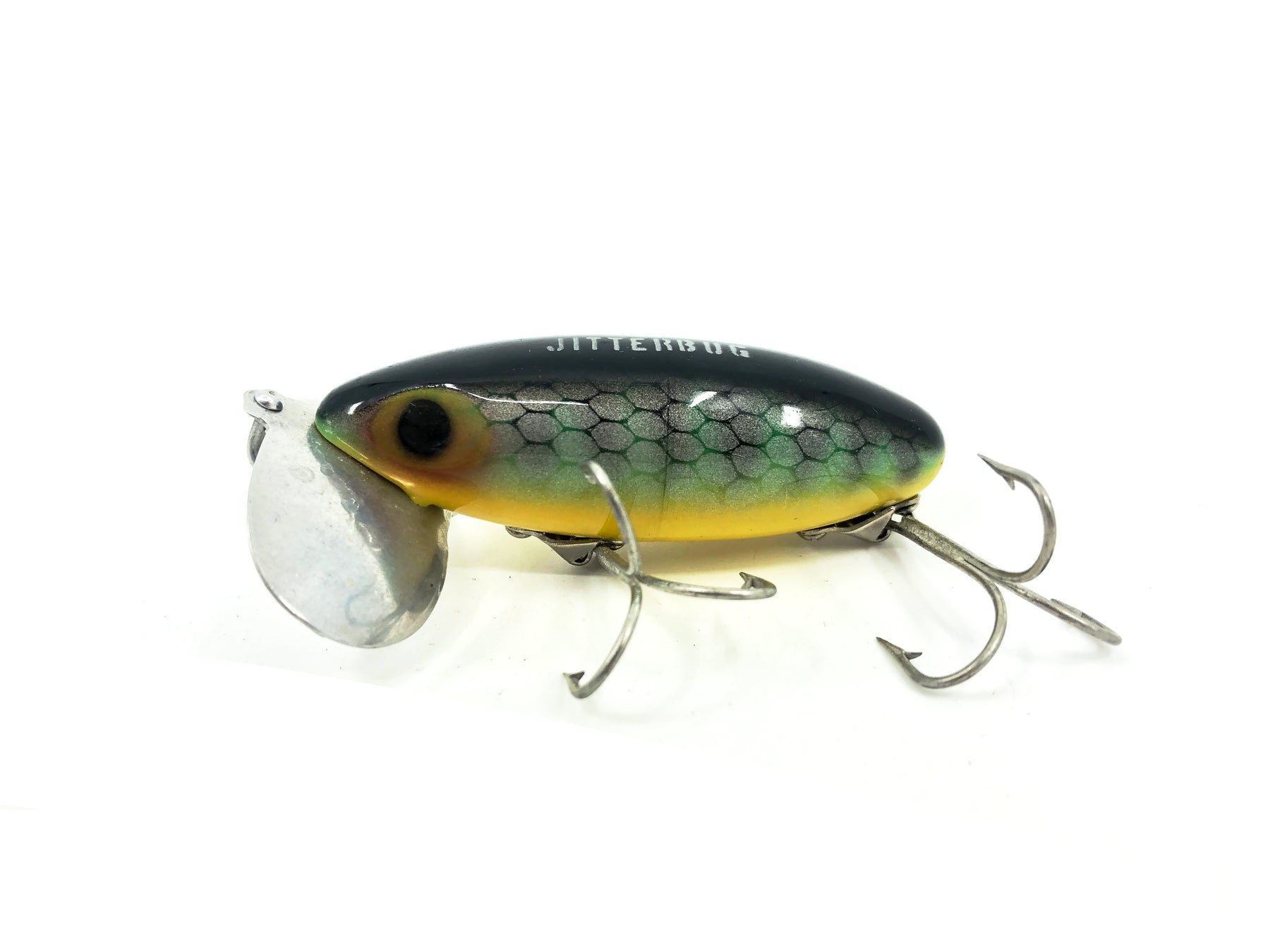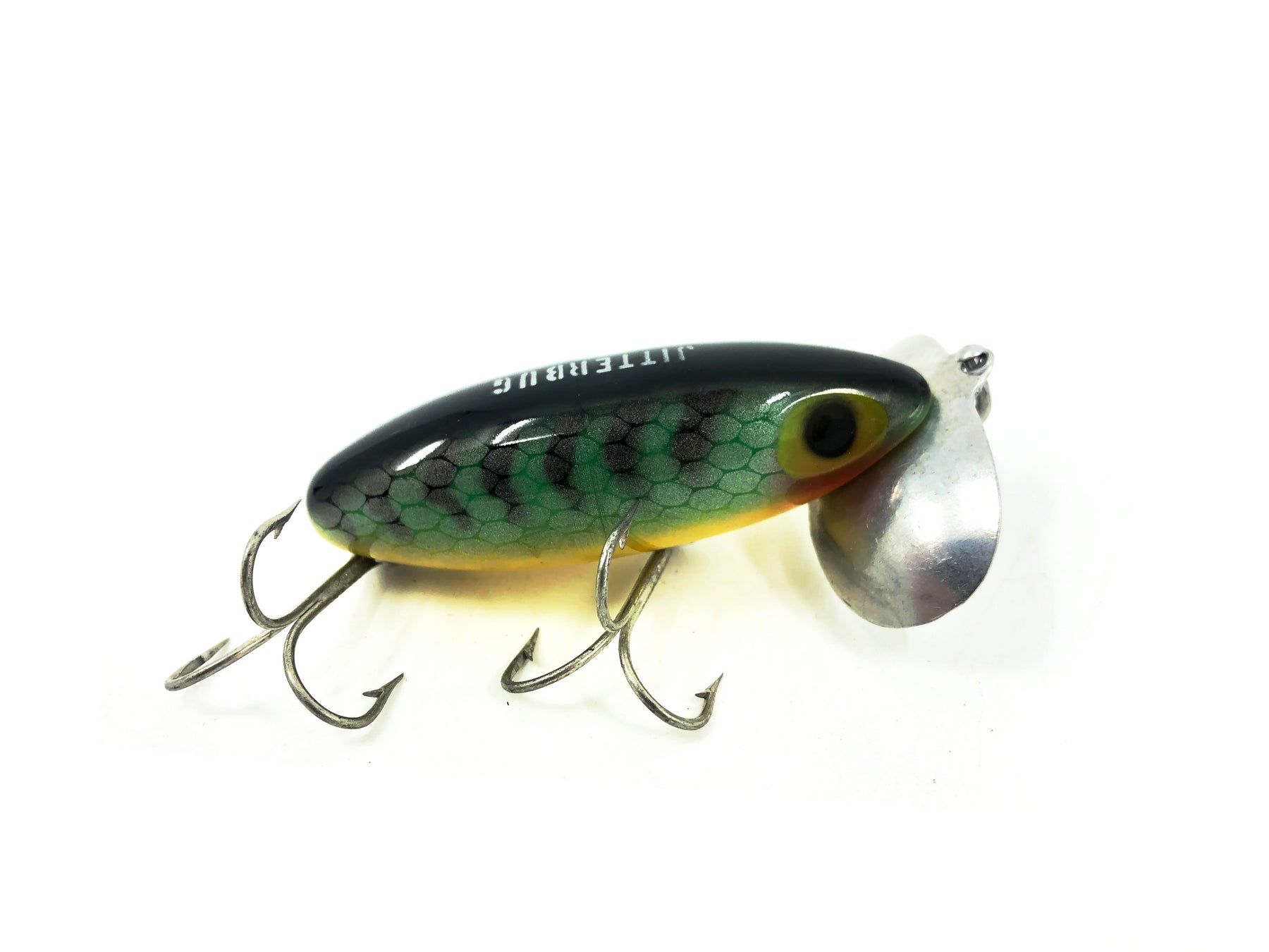 Jitterbug, World's best surface bait! Jitterbugs wobble. . . the double-lobed "lip" creates a loud paddling noise . . . takes bass day or night. Retrieve continuously or by hesitation.