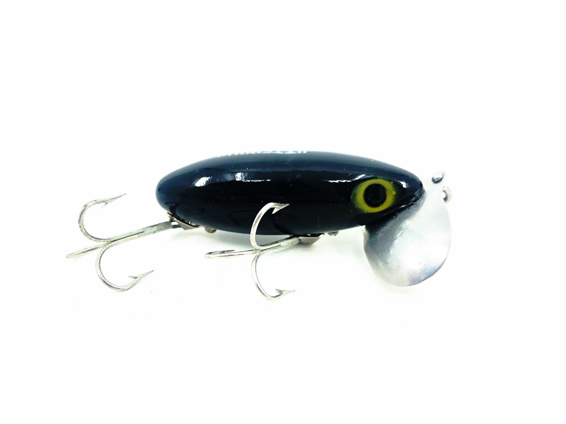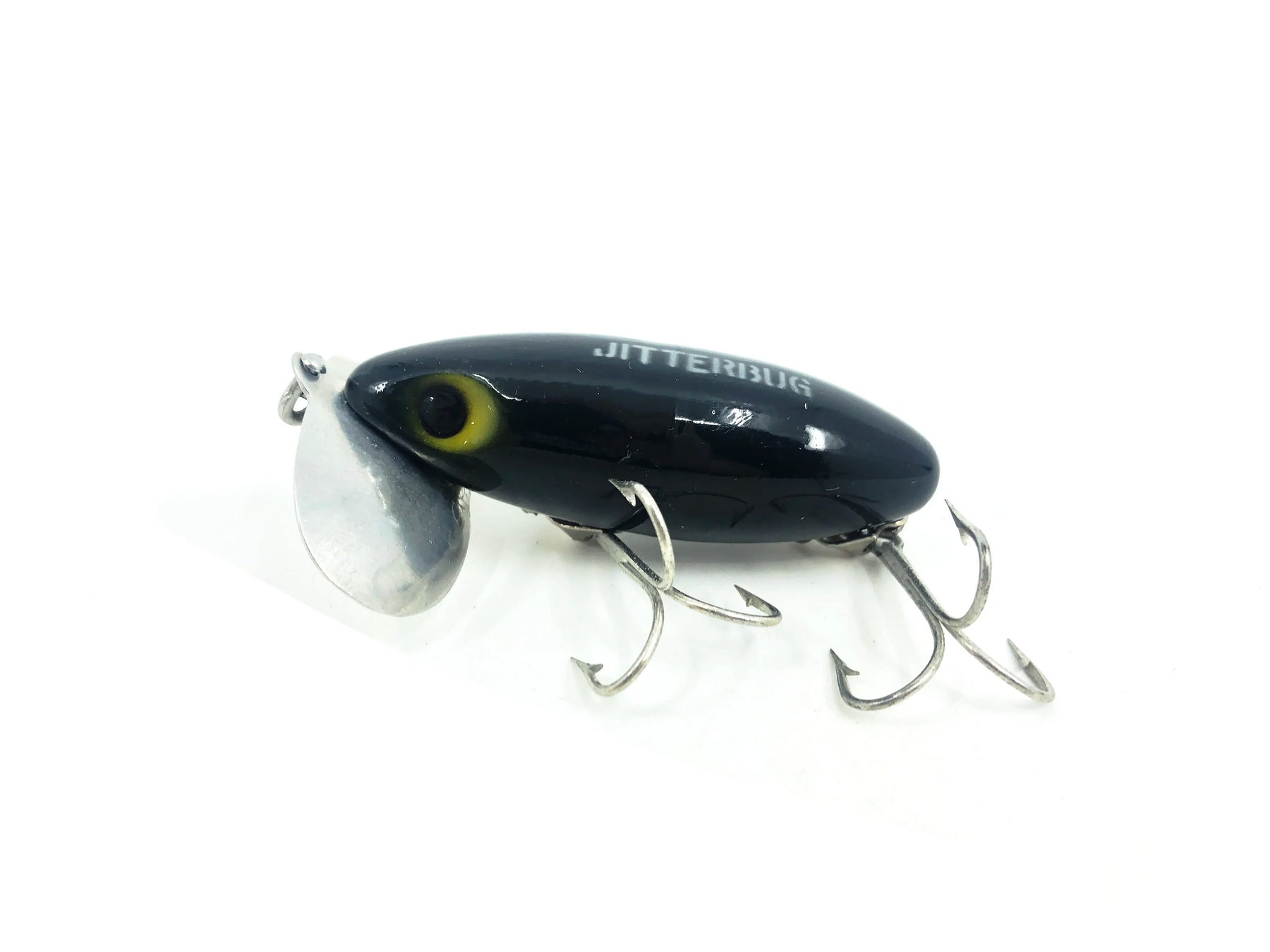 Arbogast Jitterbug 1/2oz, Black Color. Newer pradco model Jitterbug. Body is about 2 5/8" long. Used with only some minor wear but overall still in good condition. Fish or collect, see photos.
