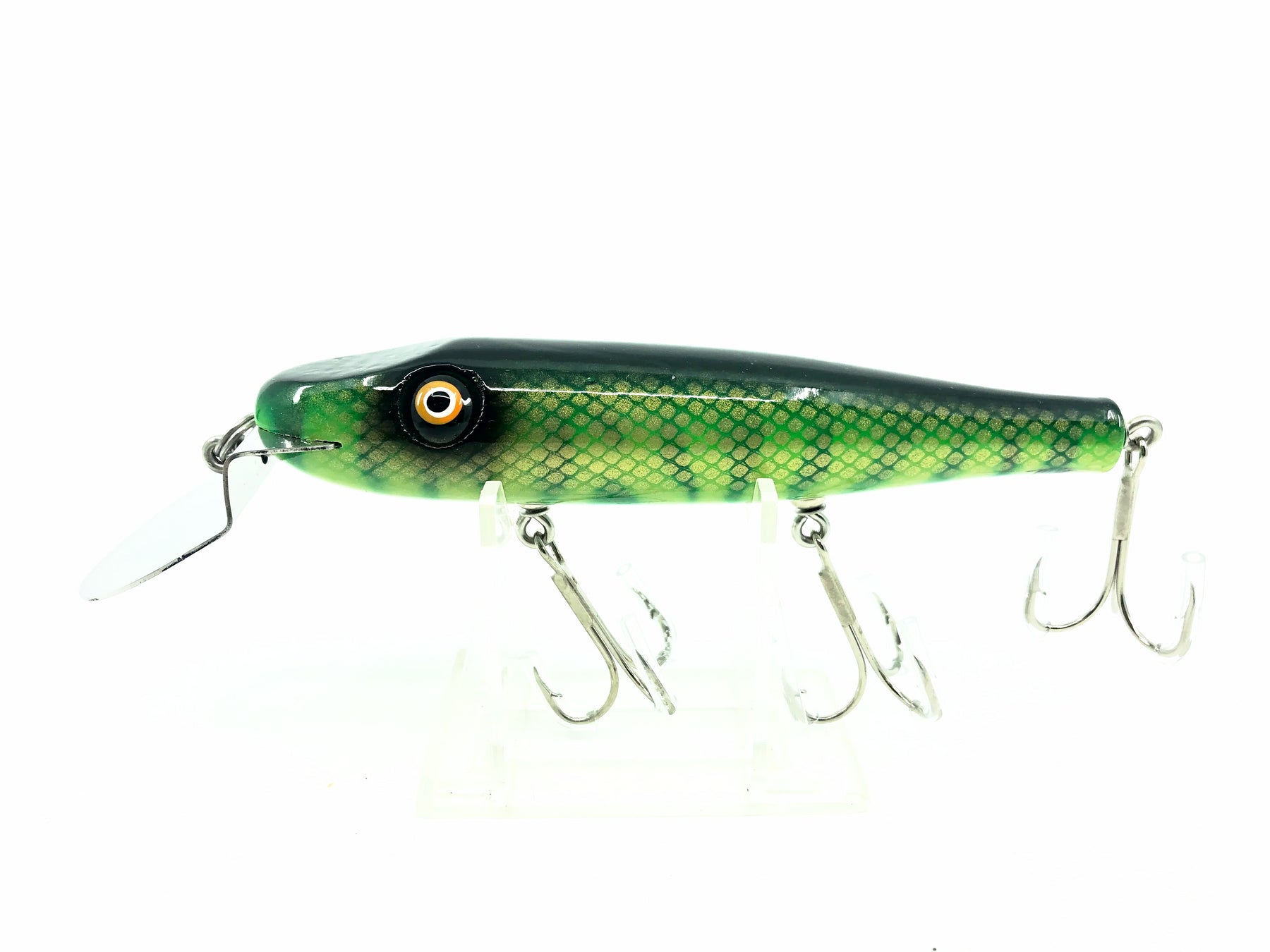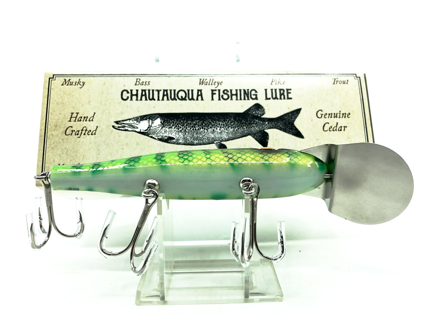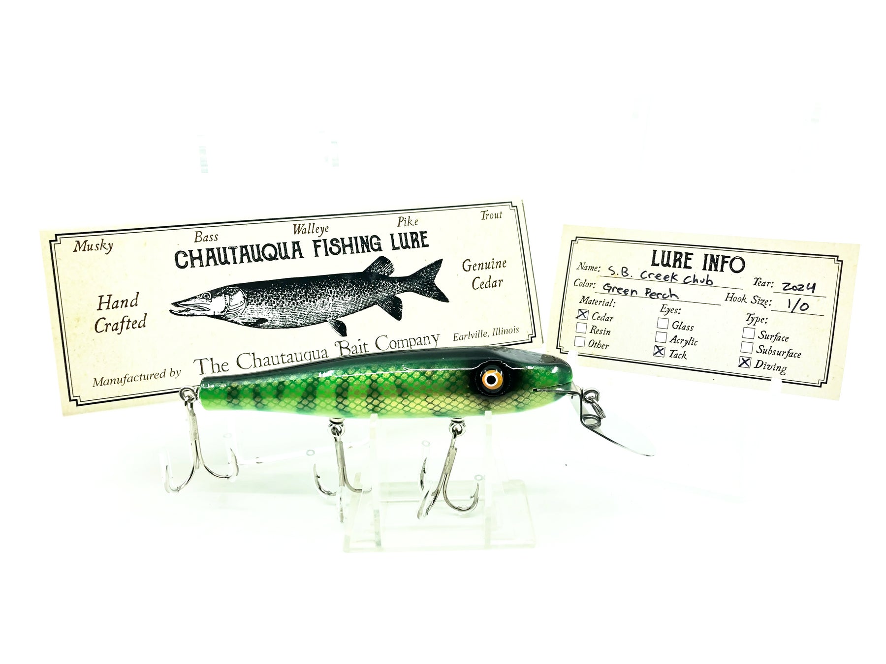 Chautauqua Solid Body Creek Chub, Green Perch Color. At about 5" long. This classic lure has earned the trust and favor of many seasoned fishermen. A multi-species bait with a high frequency shake that will tempt musky, pike, walleye, and bass. Features an adjustable, stainless steel diving lip. Dives deep—up to 6ft when casting.