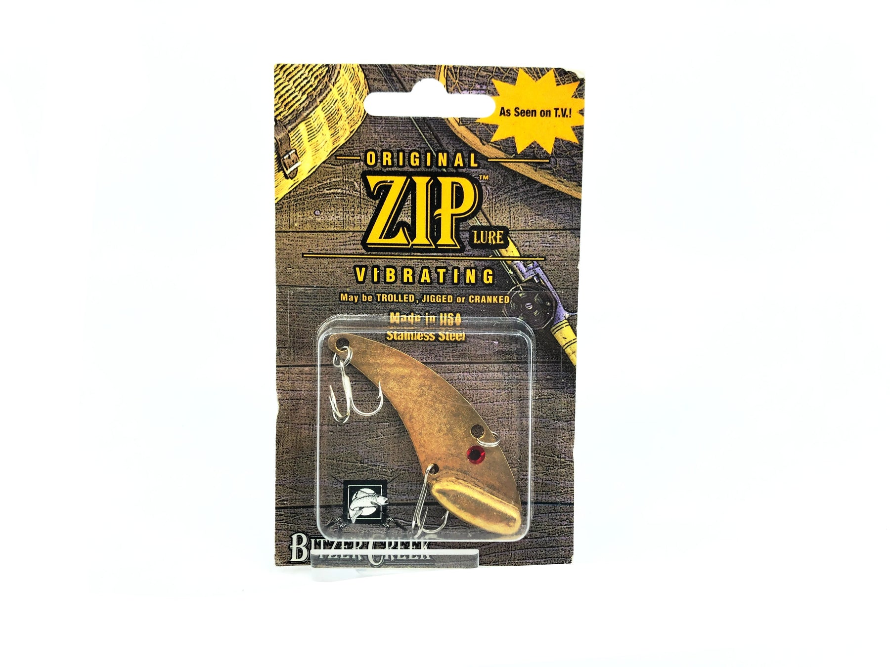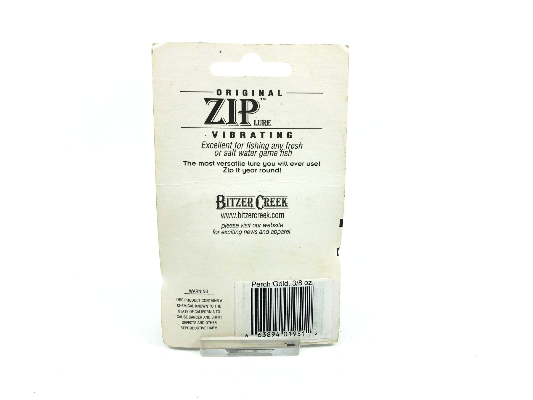 Bitzer Creek Original Zip Lure 3/8oz, Perch Gold on Card. Great vibrating blade bait. Lure is about 2 3/8" long. New on card and card is in good condition. Great deal here for anyone looking for this discontinued lure. See photos!