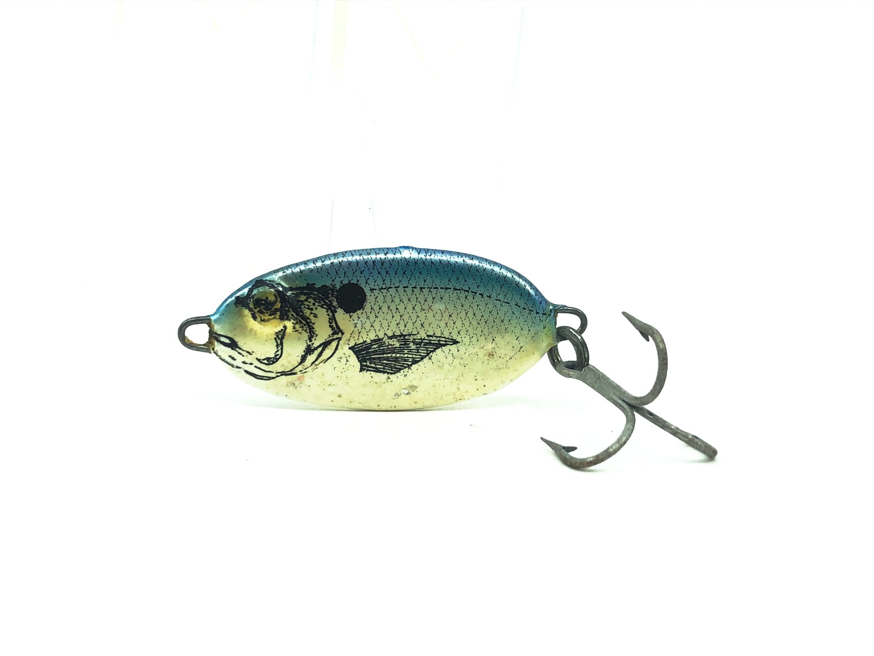 Bomber Slab Spoon 88XPL, Pearl Blue Back Color. Lure body is about 1 3/4" long. This metal bait is used with some minor wear but in overall good condition. Fish or collect a classic bait. See photos.