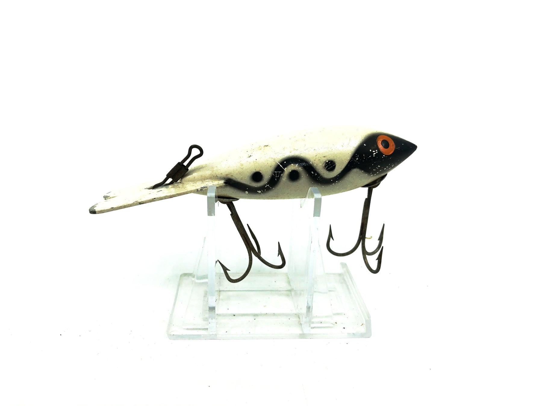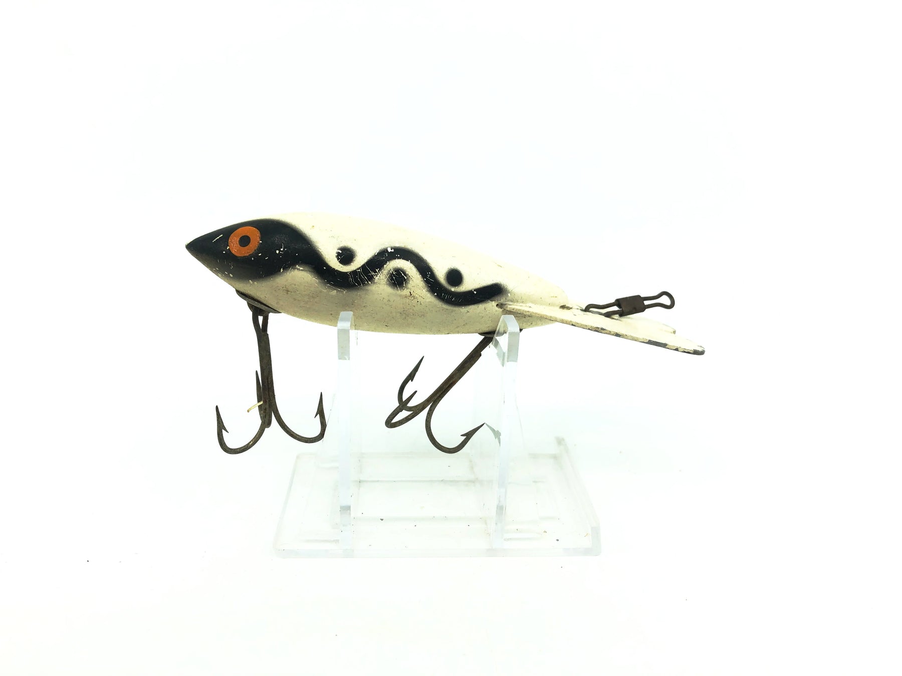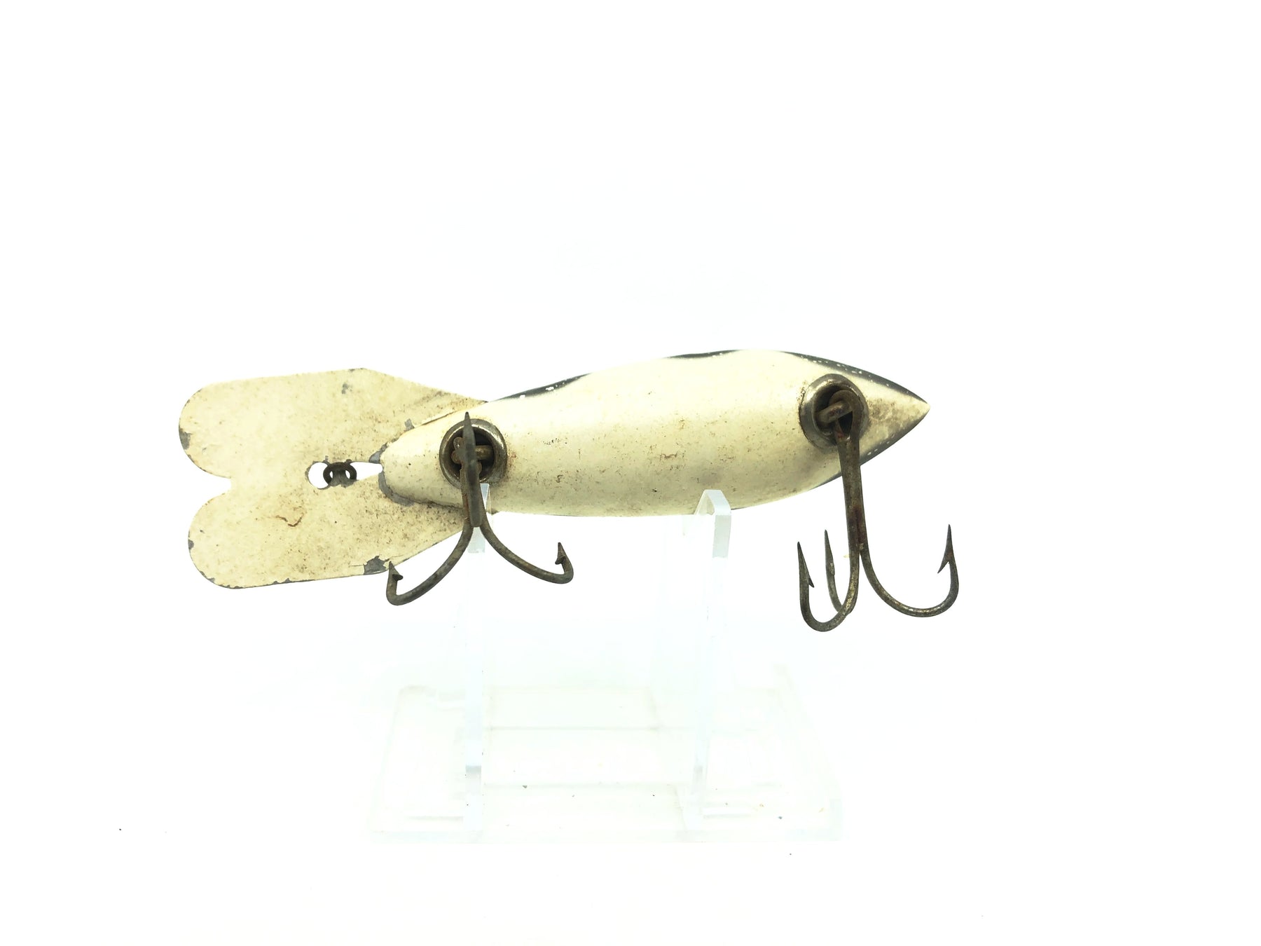Bomber 600 Series, #08 White/Black Shadow Stripe Color. About 4" long.  Lure is used with some wear and marks but overall in good condition, see photos.  Classic lure that isn't made anymore.  Fish or collect. Plastic version, has rattles.