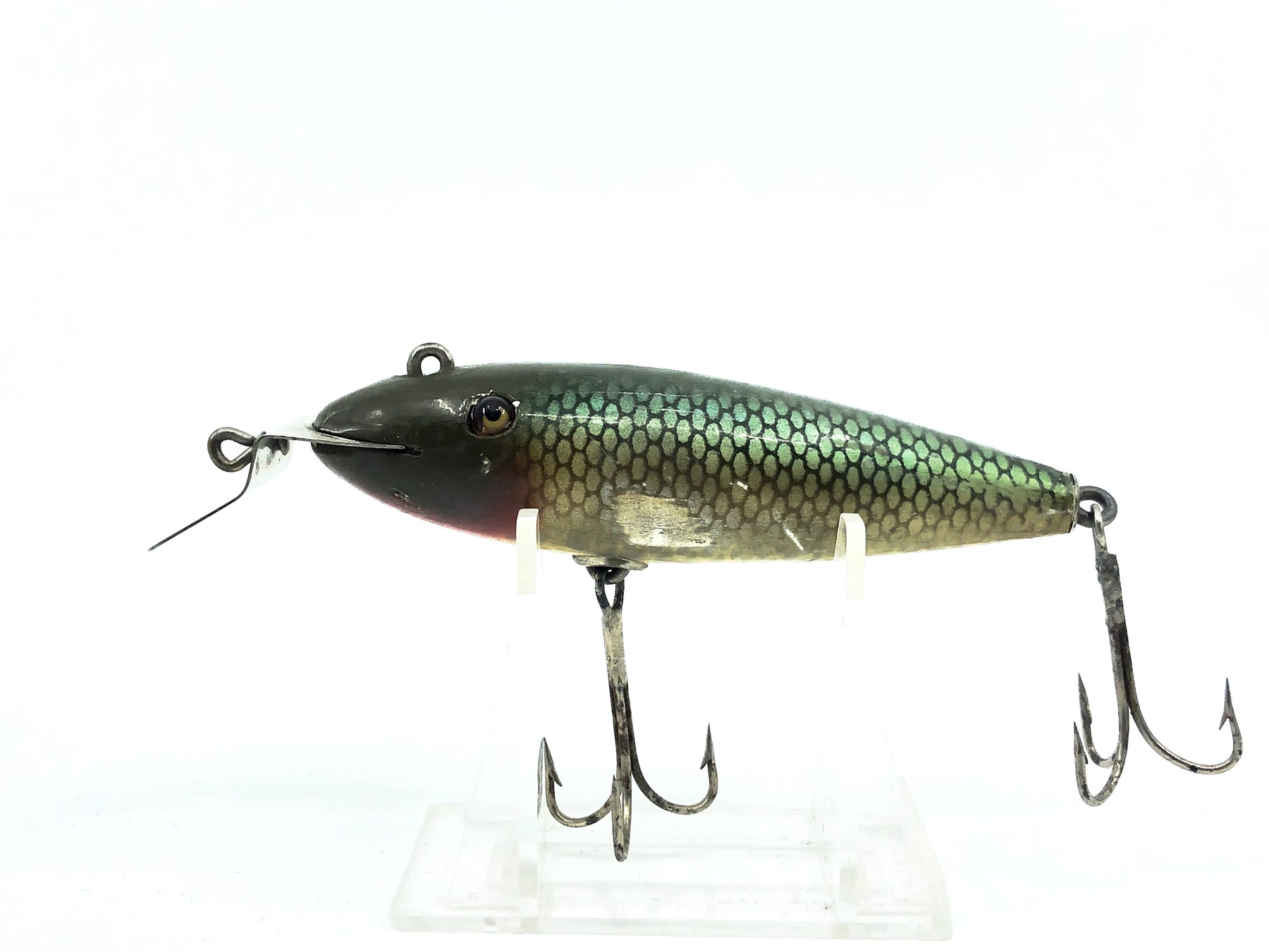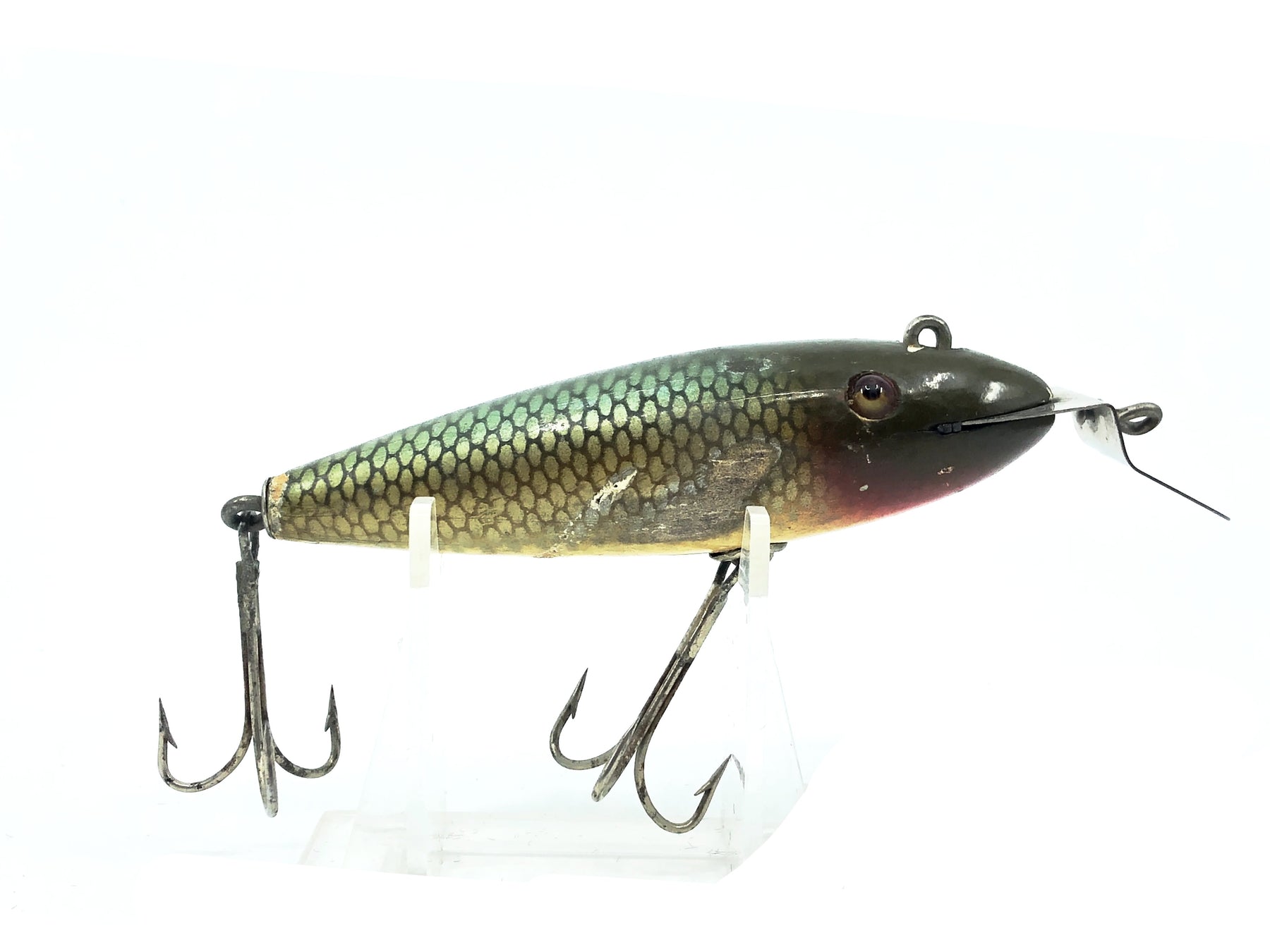 Creek Chub #100 Wiggler, Chub Scale Color-DLT. Earlier Wiggler with a double line tie. About 3 3/4" long excluding the lip.  Wooden lure, glass eyes.  The Creek Chub Wiggler was made from 1916 - 1964 and was one of the more famous Creek Chub lures.  This vintage is used with some wear and marks but still in overall good condition, see photos.  Collect or fish this great vintage lure.