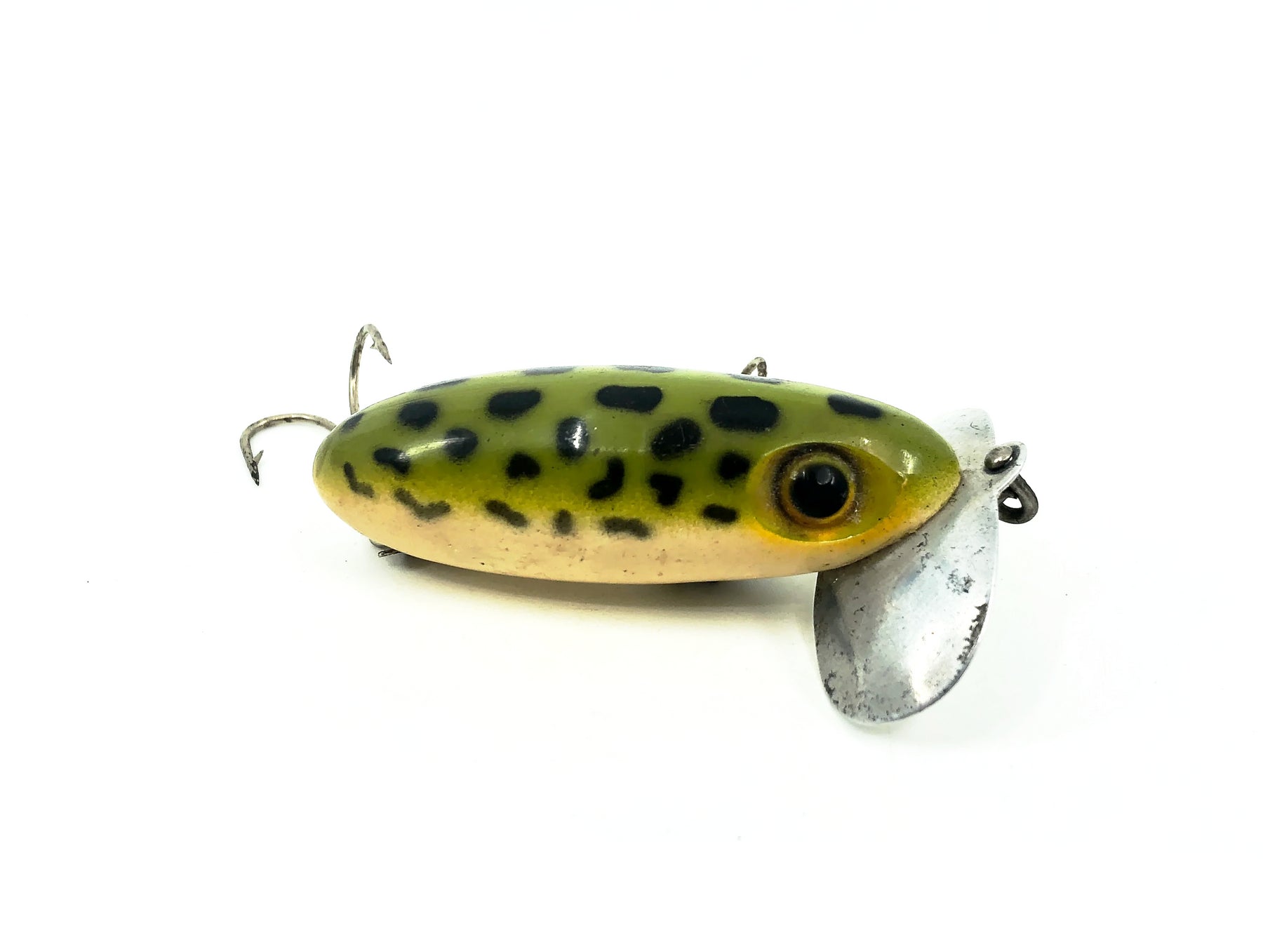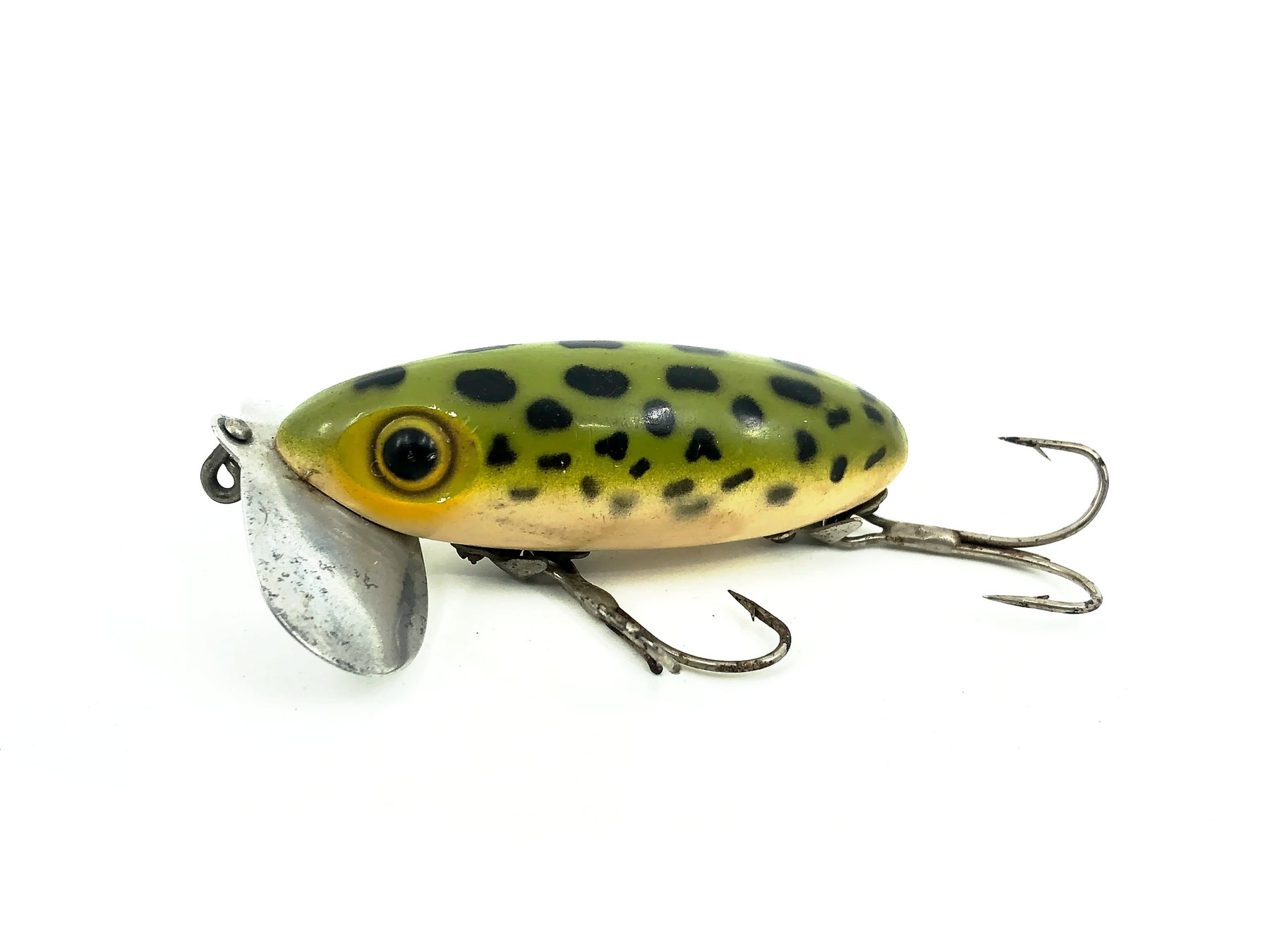 Arbogast Jitterbug 5/8oz, Frog/White Belly Color, Vintage Bugged-Eyed Model. Earlier Jitterbug here. Body is about 2 5/8" long. Used with some minor wear and the hooks have both had a barb removed but overall good condition. Fish or collect, see photos.