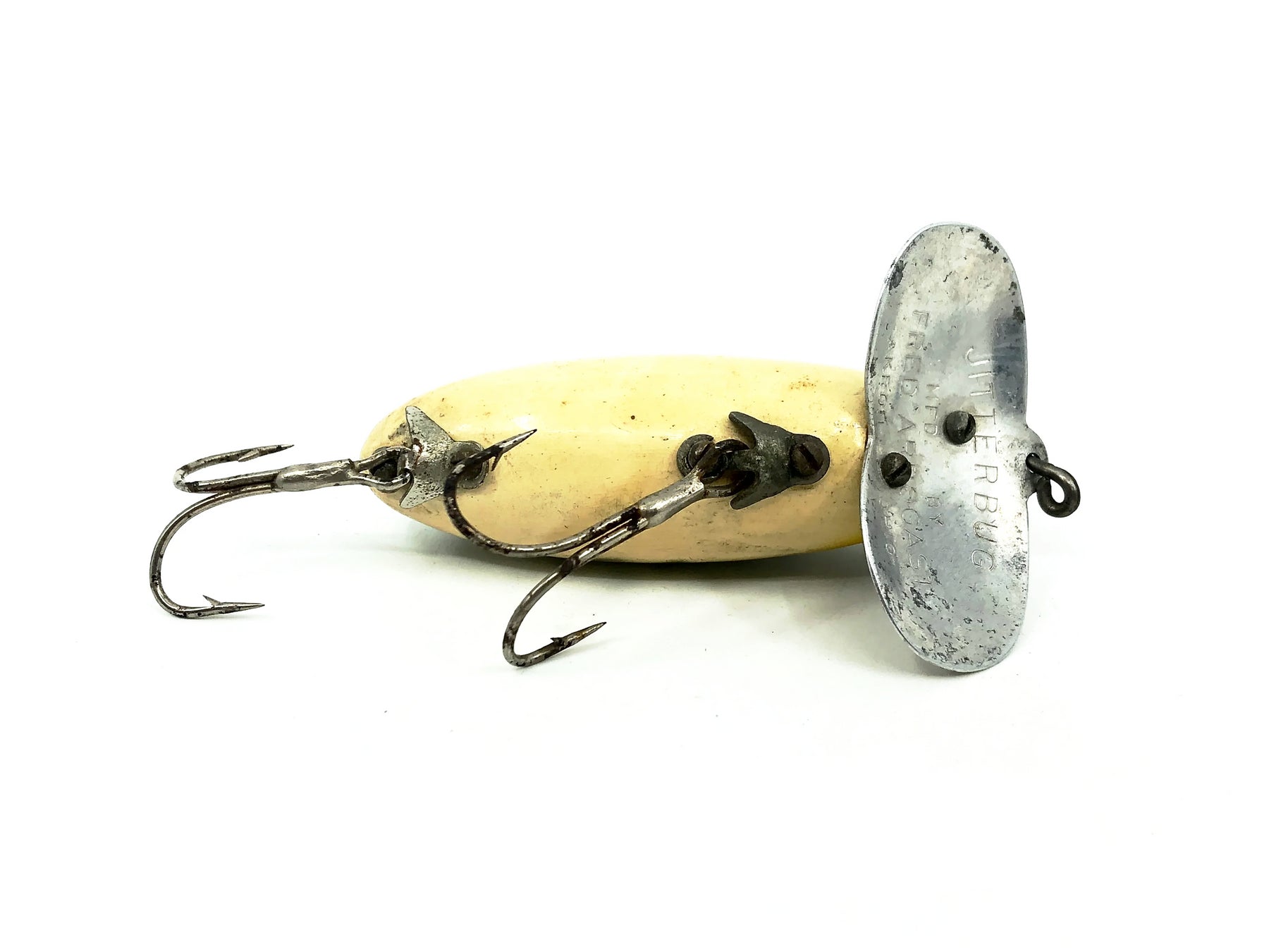 Jitterbug, World's best surface bait! Jitterbugs wobble. . . the double-lobed "lip" creates a loud paddling noise . . . takes bass day or night. Retrieve continuously or by hesitation.