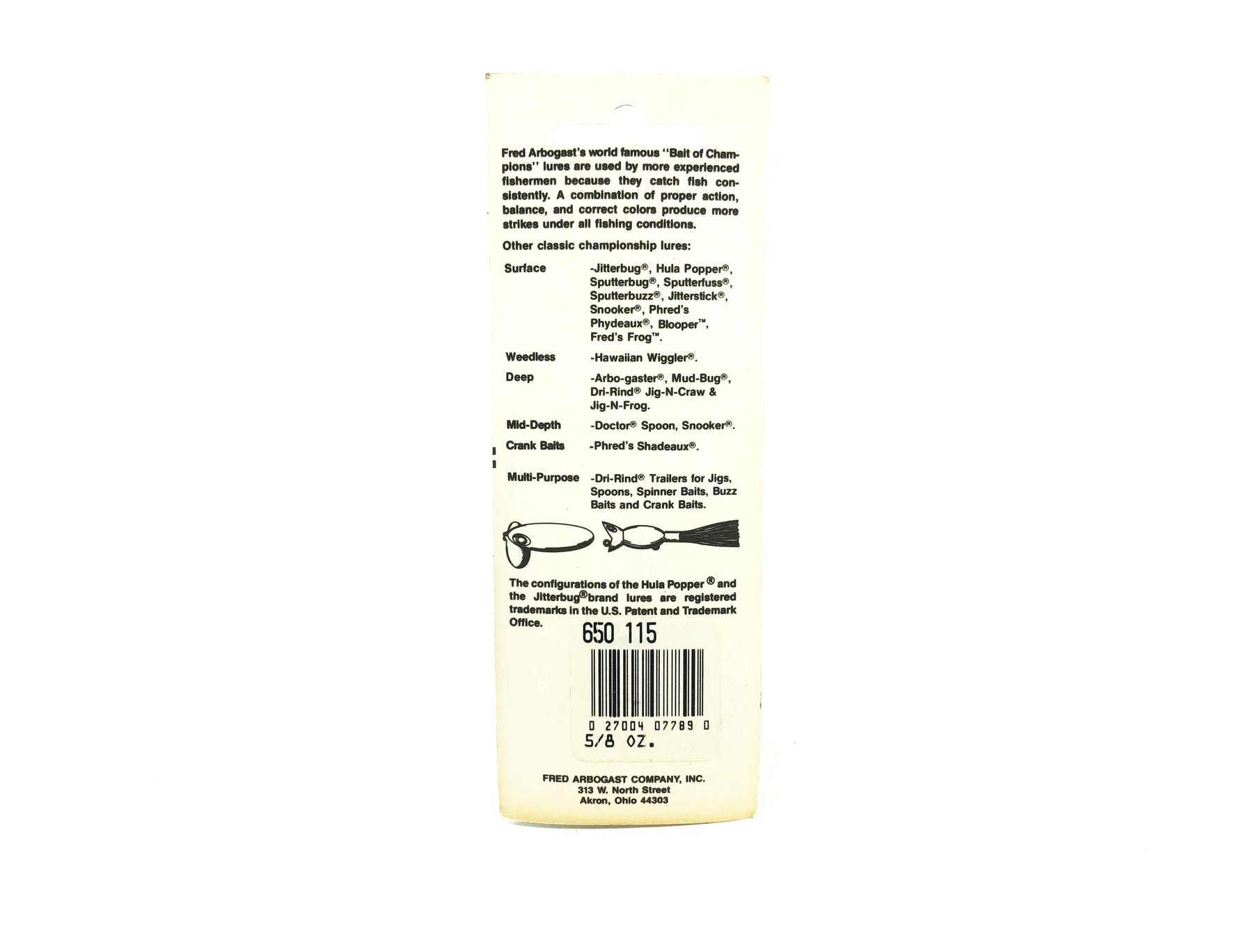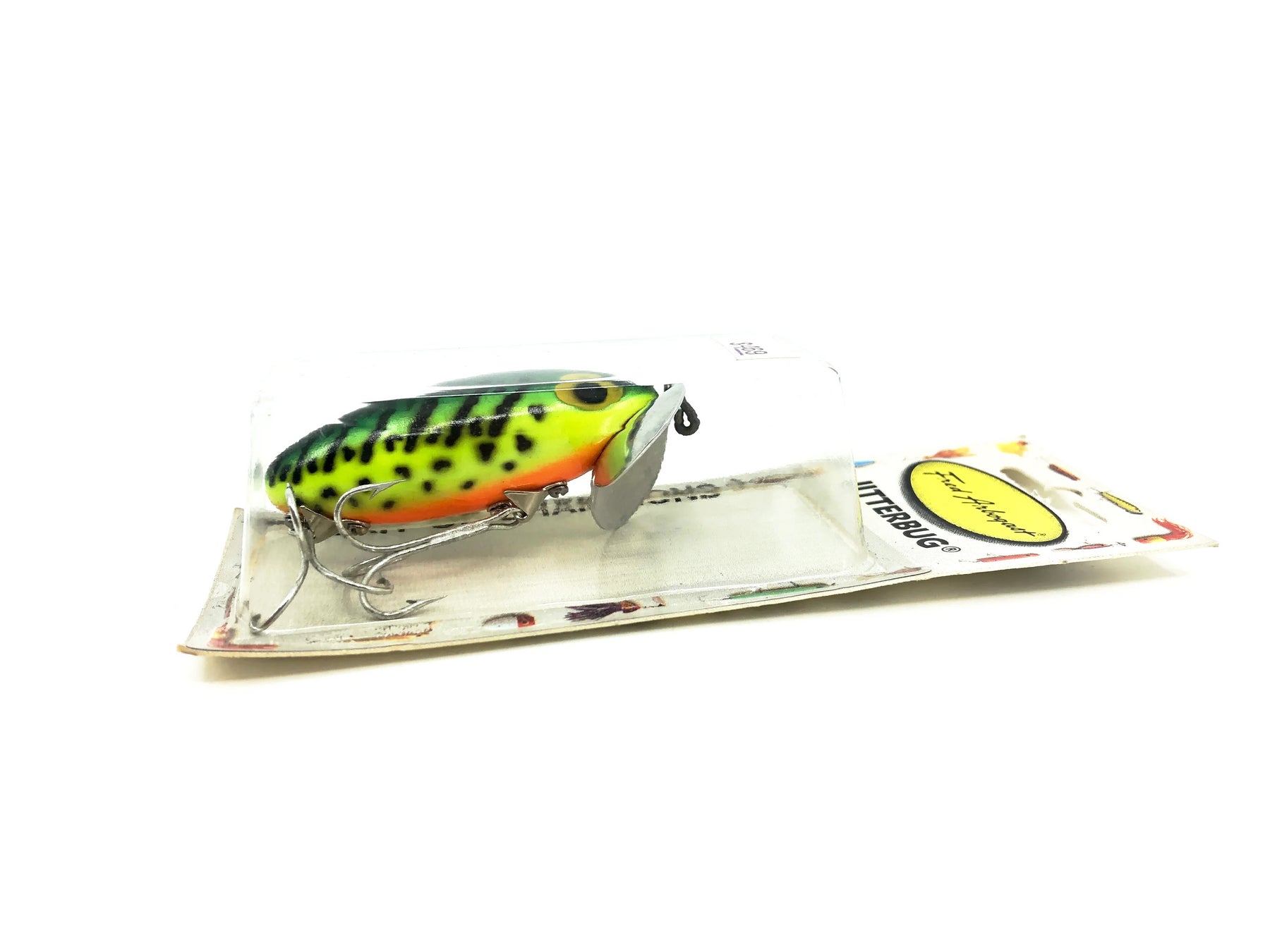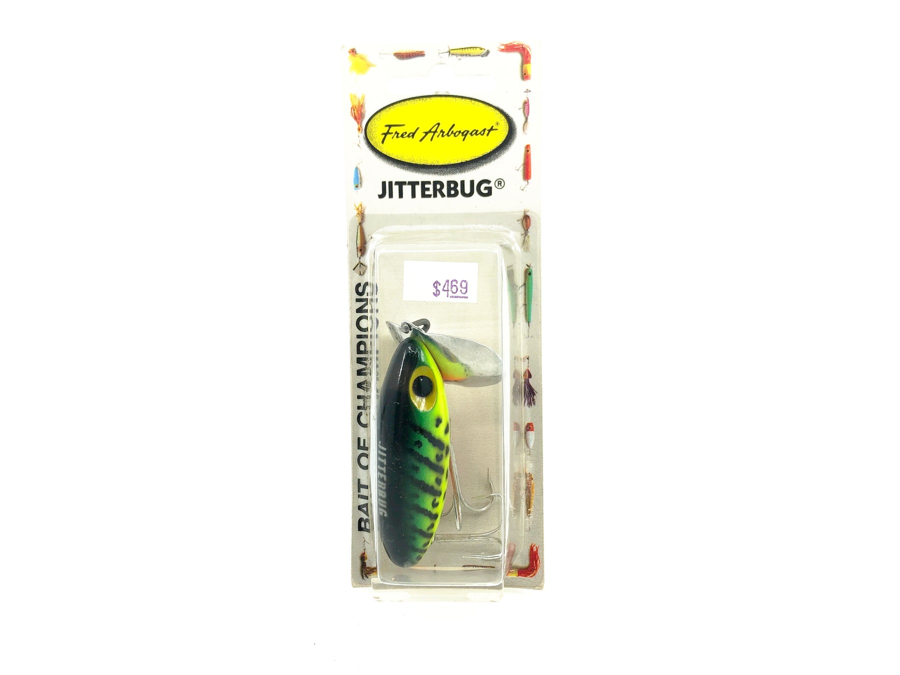Arbogast Jitterbug 5/8oz, #115 Firetiger Color on Card. Body is about 2 5/8" long. Bait is new on card, card is in good condition. Fish or collect this iconic lure, see photos.