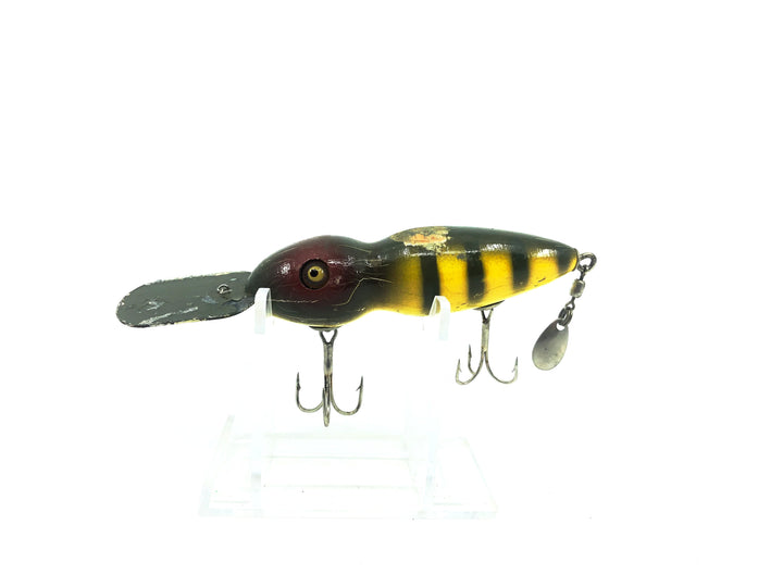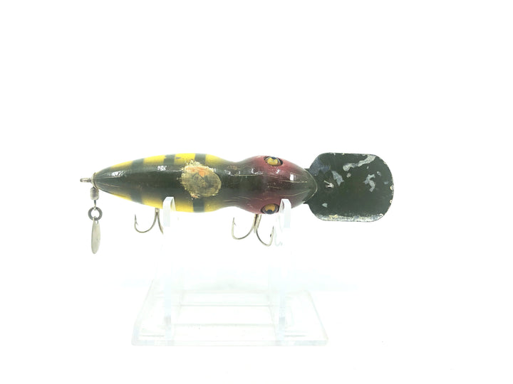 Wooden Martin Lizard Yellow Perch Color, Glass Eyes. About 4 1/4" long including lip. Used and with some wear and marks but still overall ok condition, note the most prominent mark is located on the top. See photos.