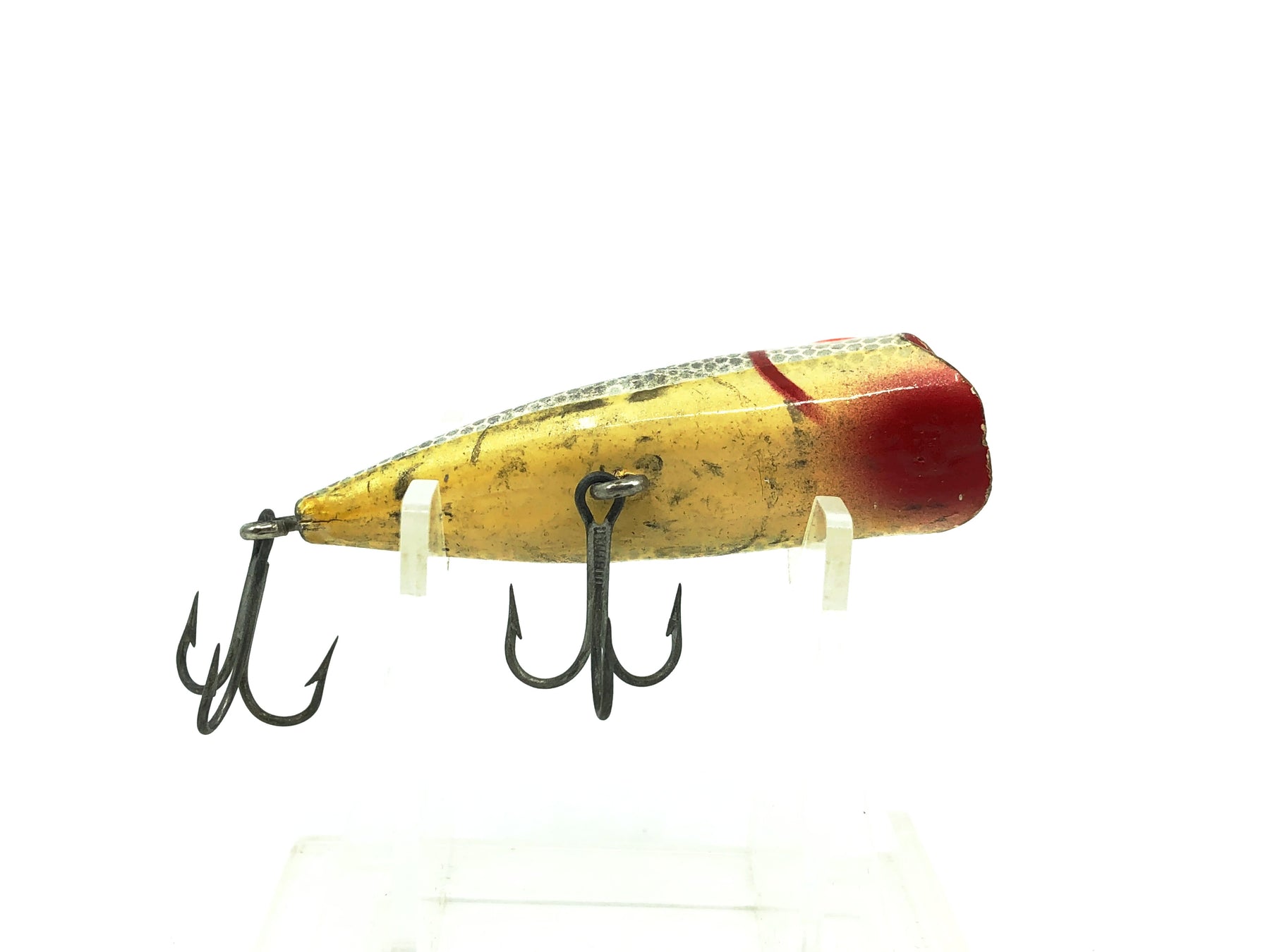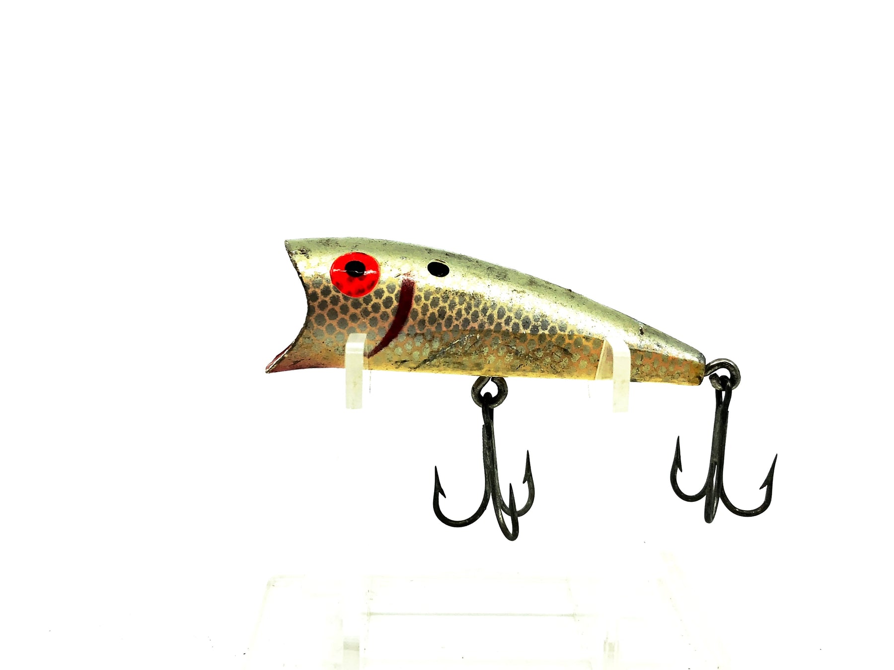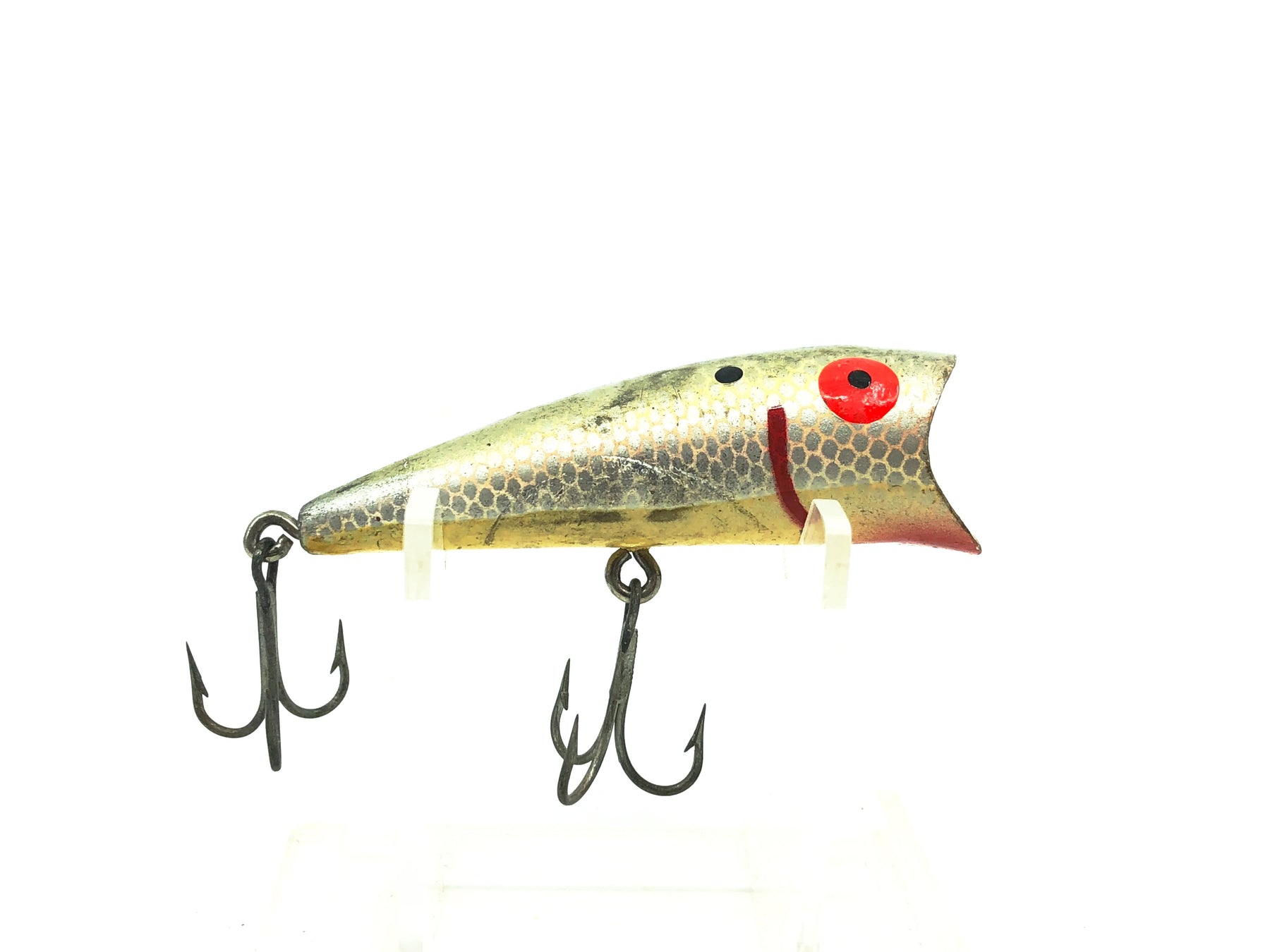 Bomber Popper 2T, #40 Silver Shad Color. About 2 1/2" long. Lure is used with some wear marks, and staining but overall in ok condition. Harder bomber bait to find. Fish or collect. See photos.