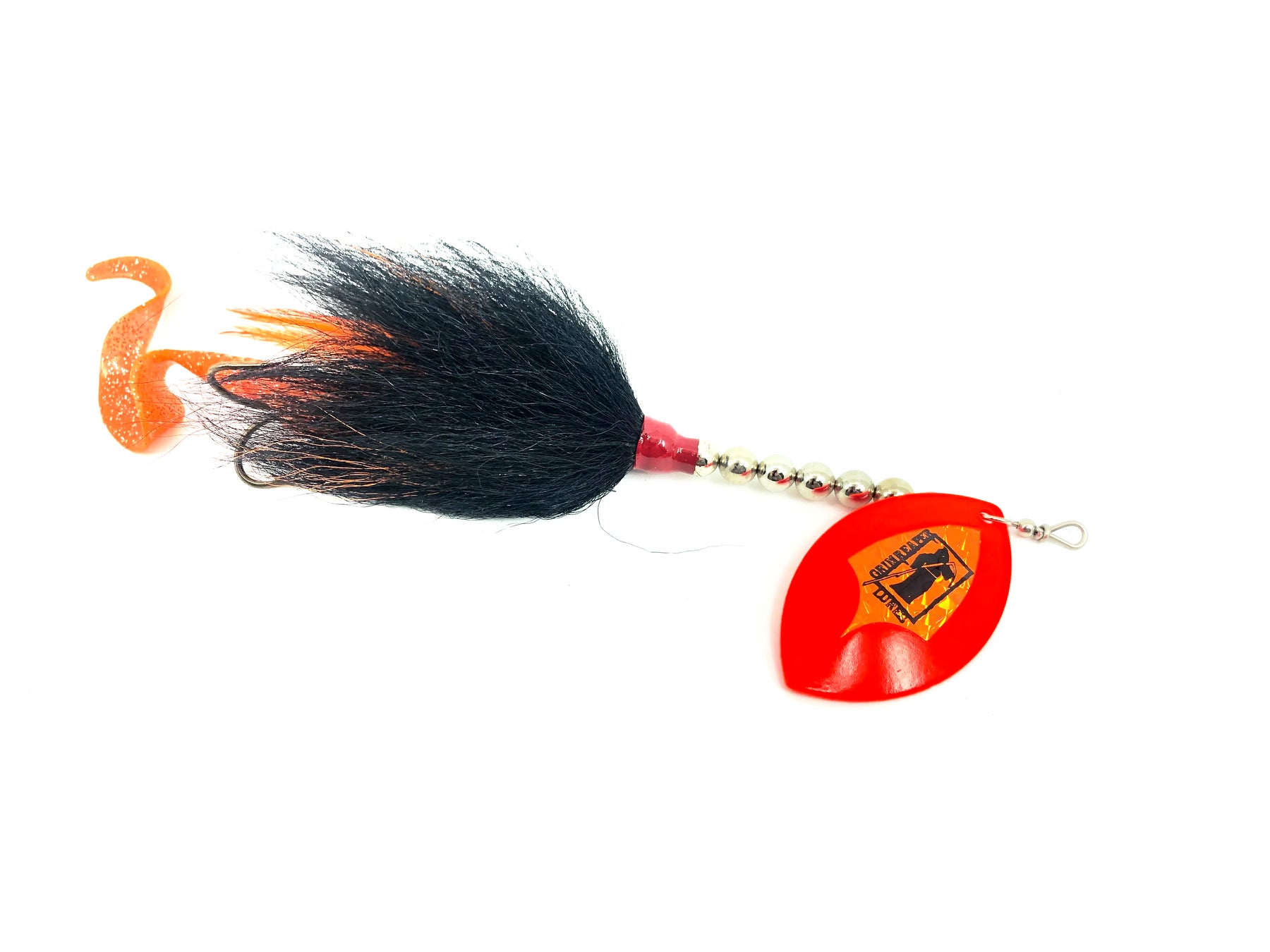 Grim Reaper Model 1100 2 1/4oz Spinner, Orange Blade/Black Tail Color. Lure is about 8" long in total and weighs 2 1/4oz. This bait is used with some minor wear but in overall great condition. See photos.