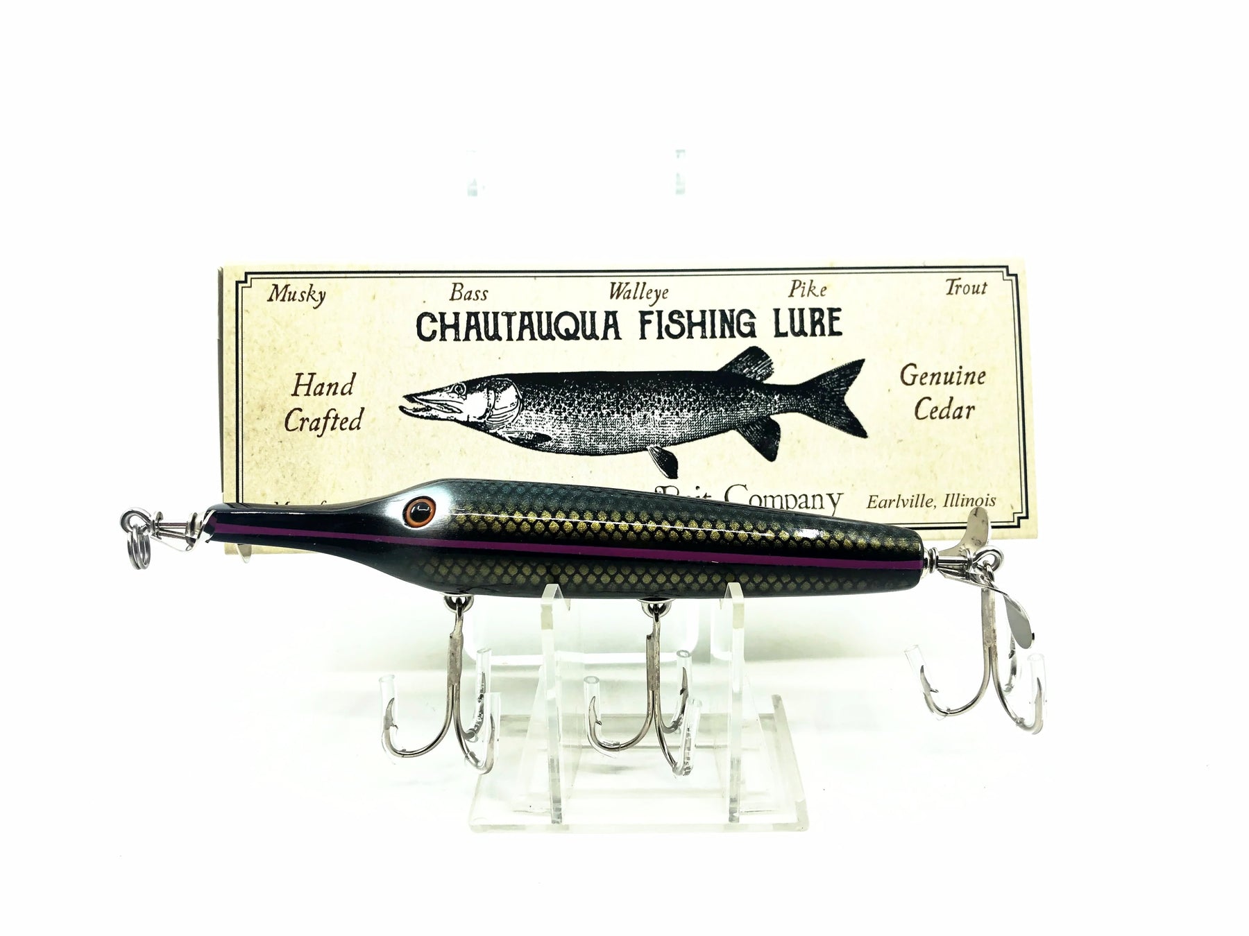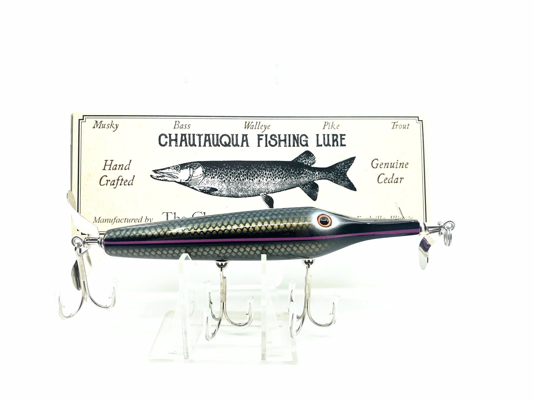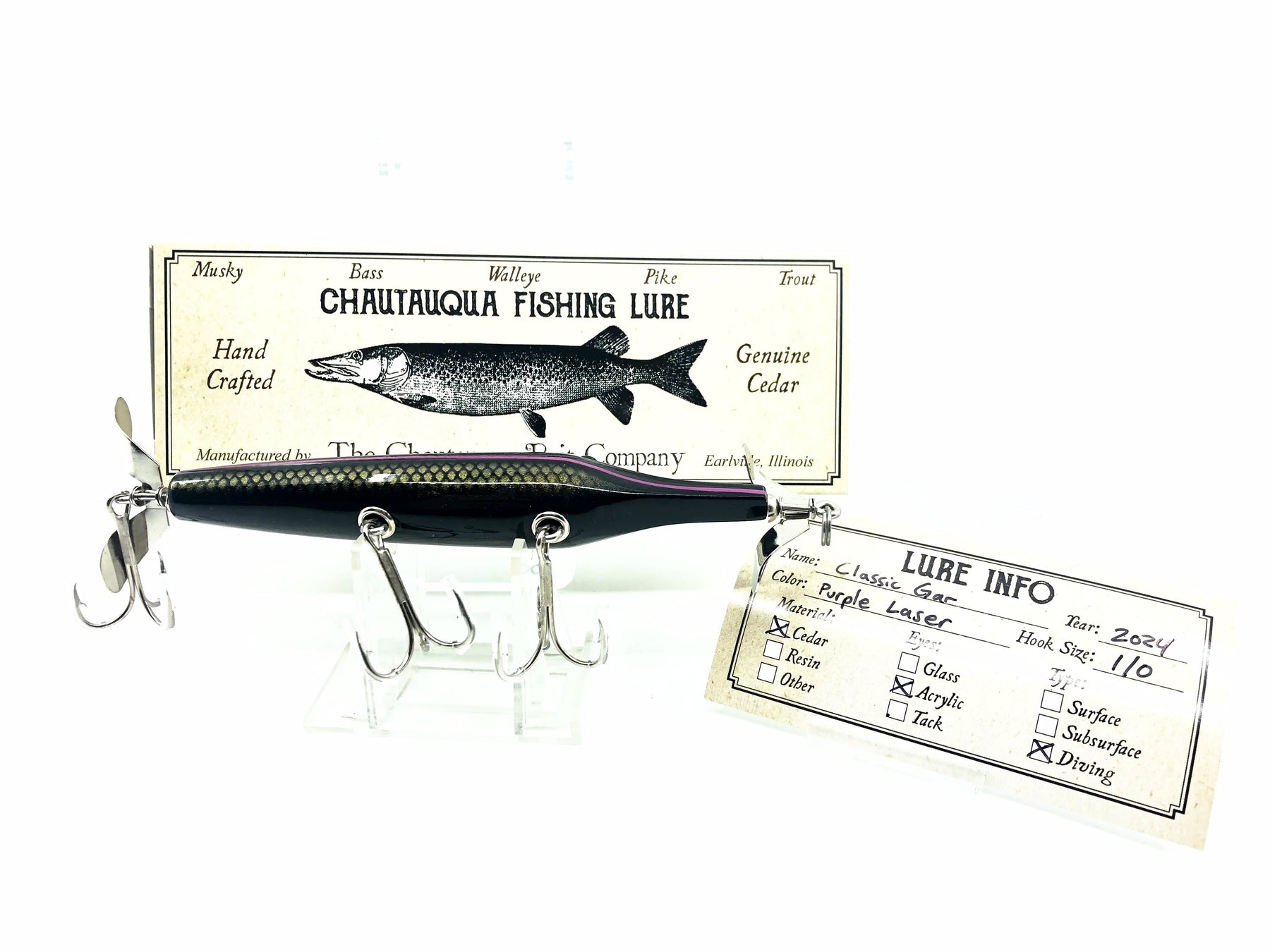 Chautauqua Classic Gar, Purple Laser Color. Body of this lure is about 5 1/2" long.  Hand carved, hand painted, tank tested.  Cedar lure, tack eyes.  Great for fishing or collecting in a display.  Simply a modern work of art in a great fishing lure.  Grab this one while you can.
