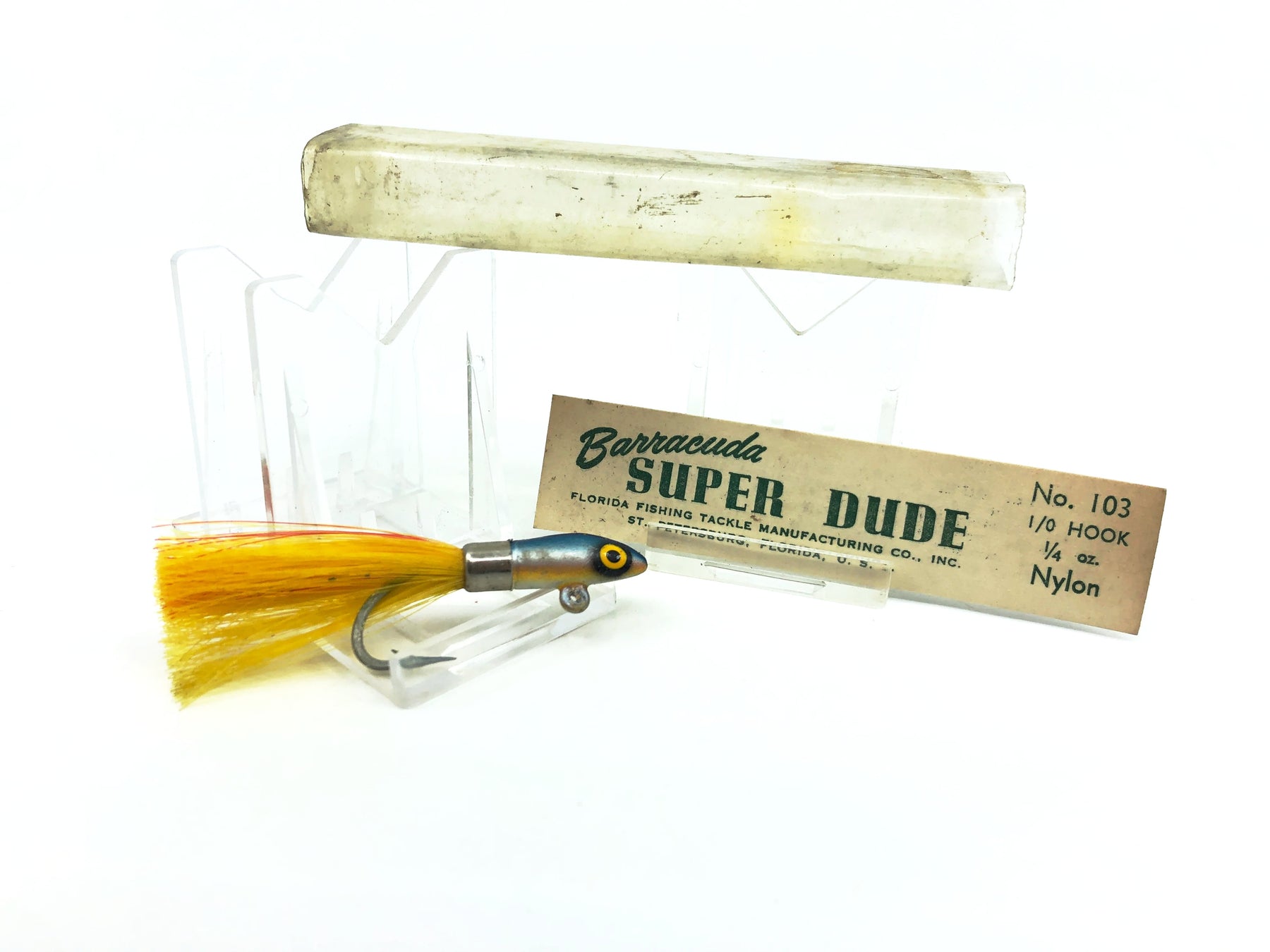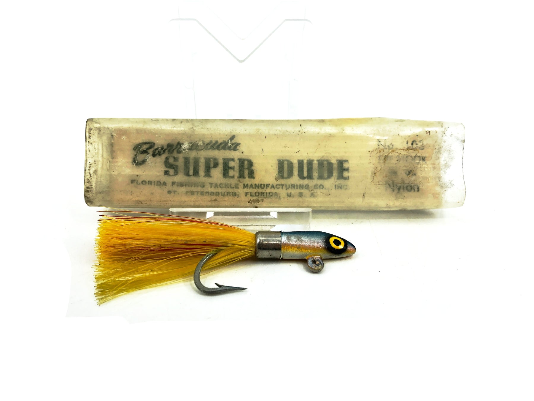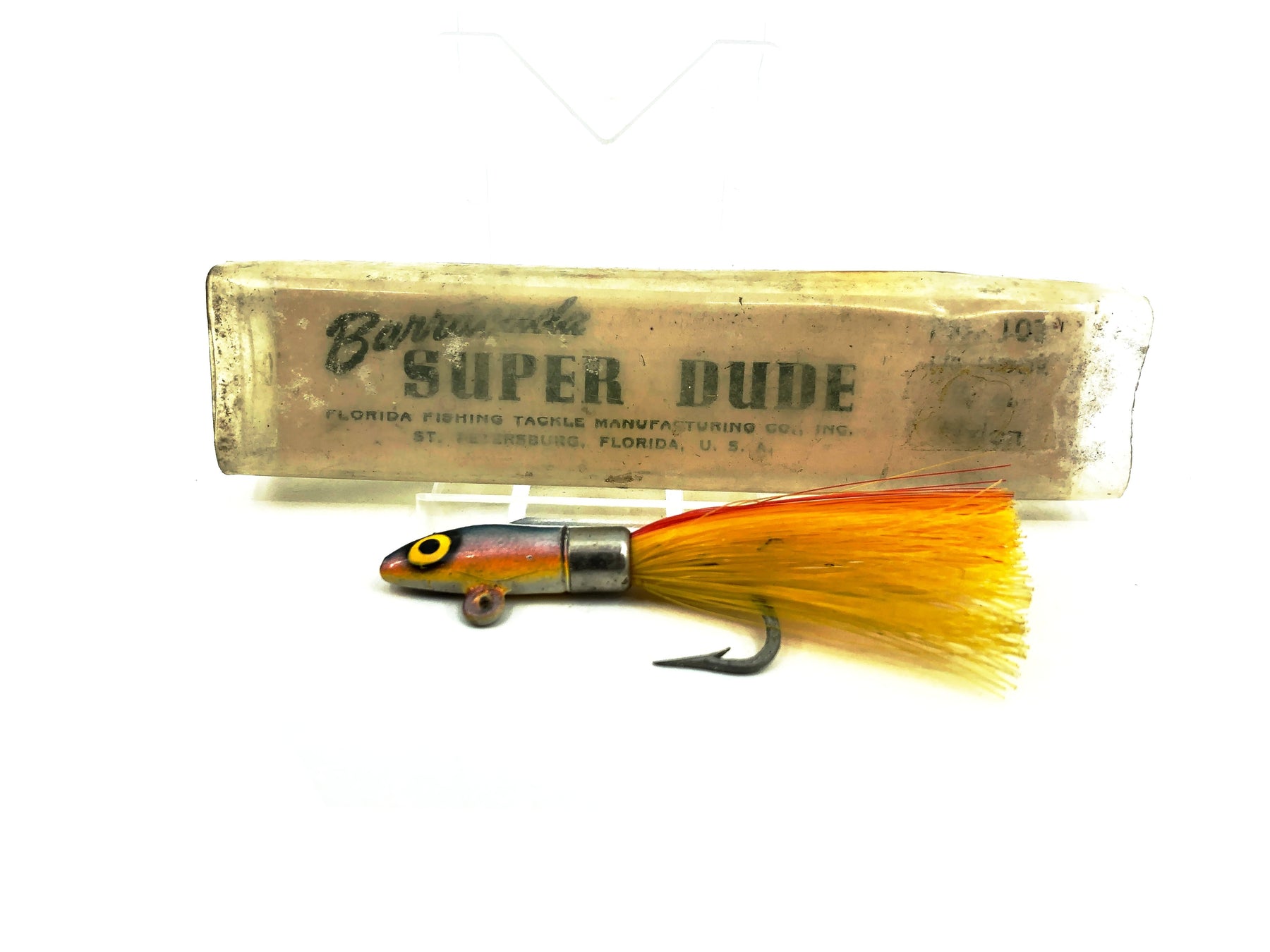 Barracuda Super Dude, Rainbow Color with Tube. About 2 5/8" long. Lure is used with some wear but still overall good condition, see photos. Tube is in ok condition and is missing one end. Classic vintage Florida lure here.