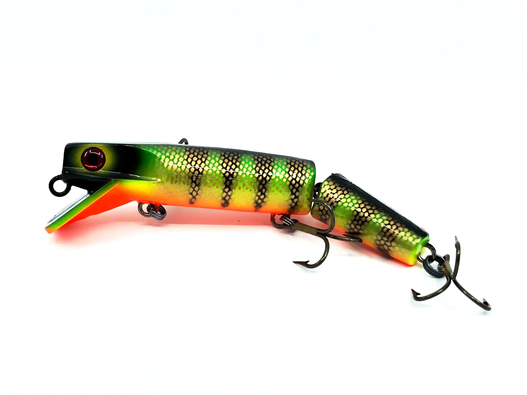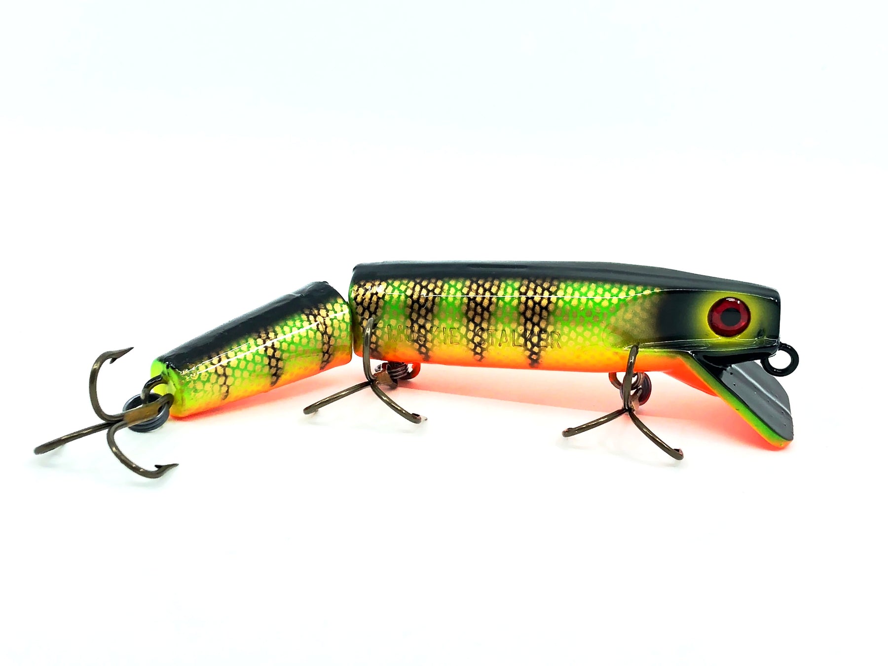Drifter Tackle 6 1/2" Jointed Muskie Stalker, Perch Color. Great lure here, tough to find. Used lure with some wear as shown in photos but in overall good condition. Grab this one while it lasts.