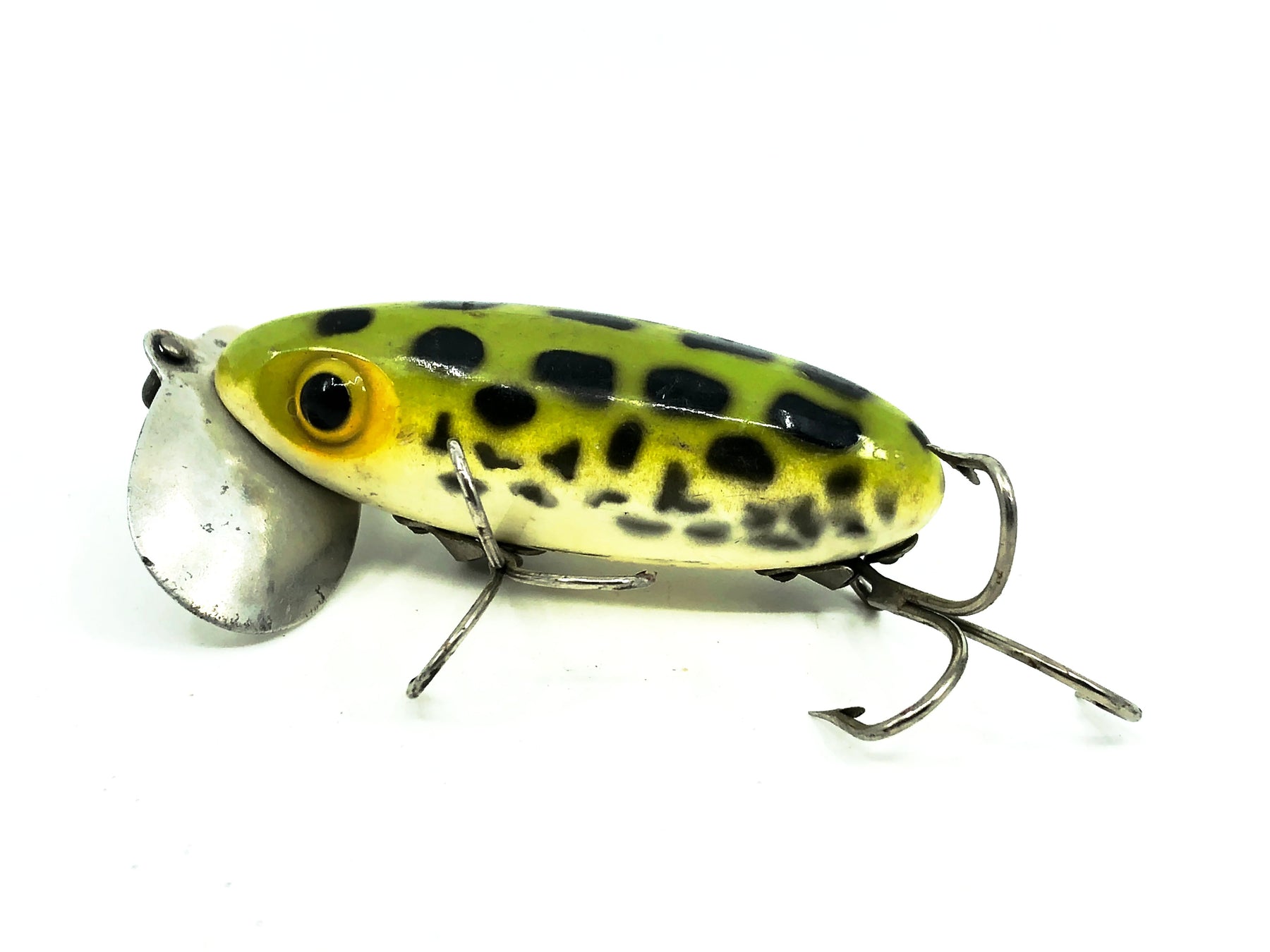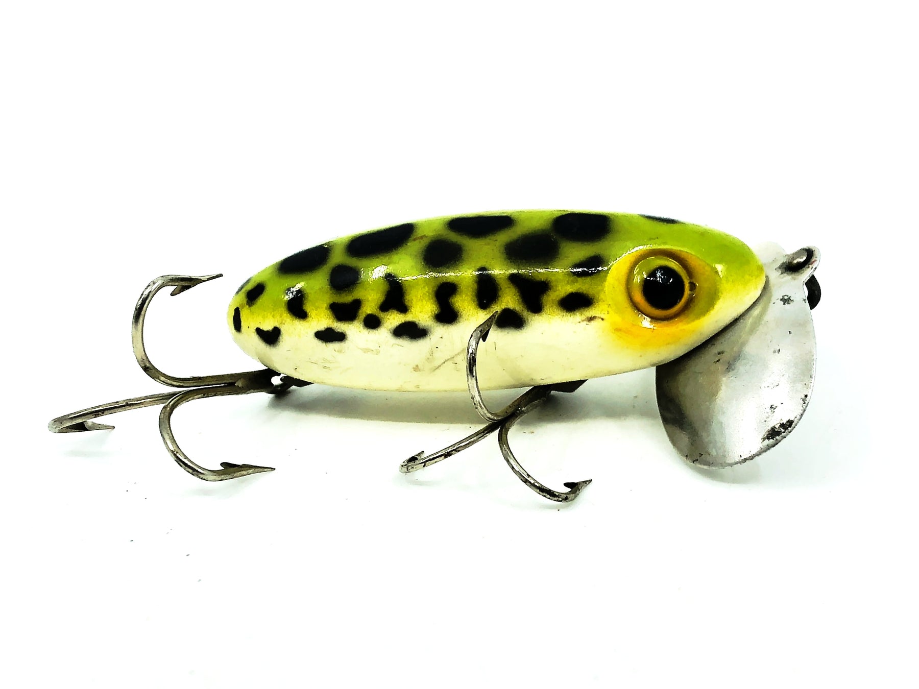 Arbogast Jitterbug 5/8oz, Frog Color, Vintage Bugged-Eyed Model. Body is about 2 5/8" long. Used with some wear and marks but overall good condition. Fish or collect this uncommon color, see photos.