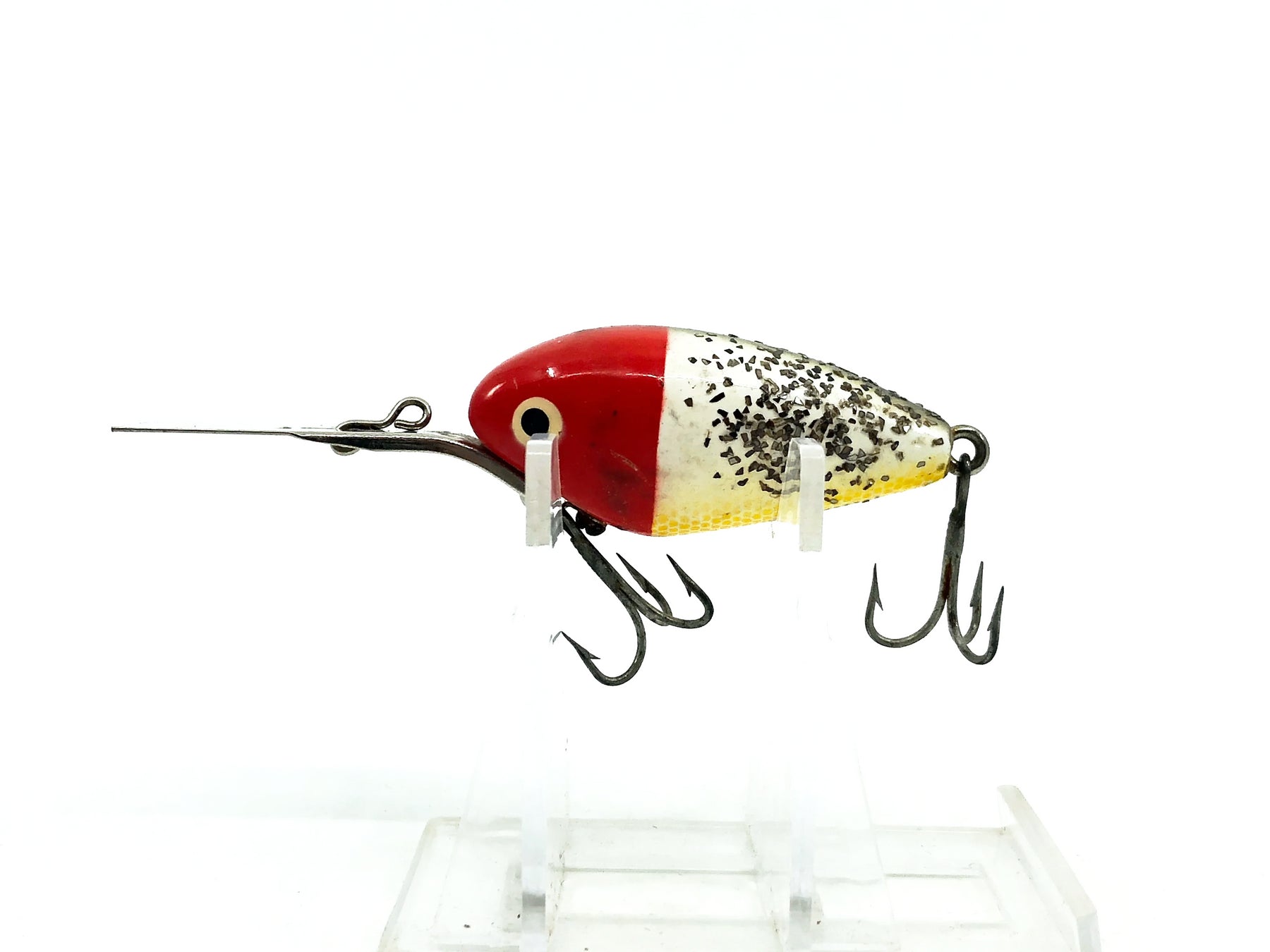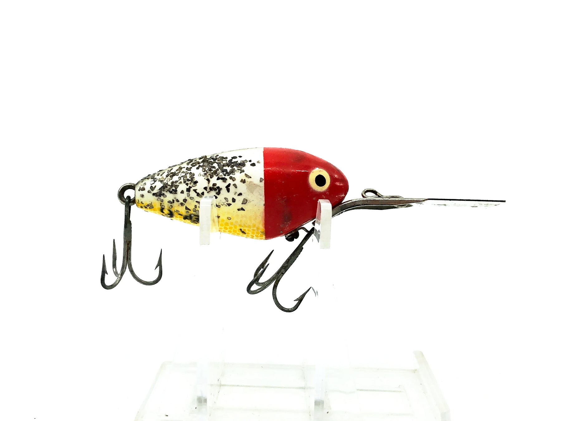 Heddon Deep-6, RHF Red Head/Silver Flitter Color. Harder to find Heddon bait here. Lure is used with some wear but still overall in good condition. Smaller size here of the deep-6 with 1 7/8" long body. Fish or collect.
