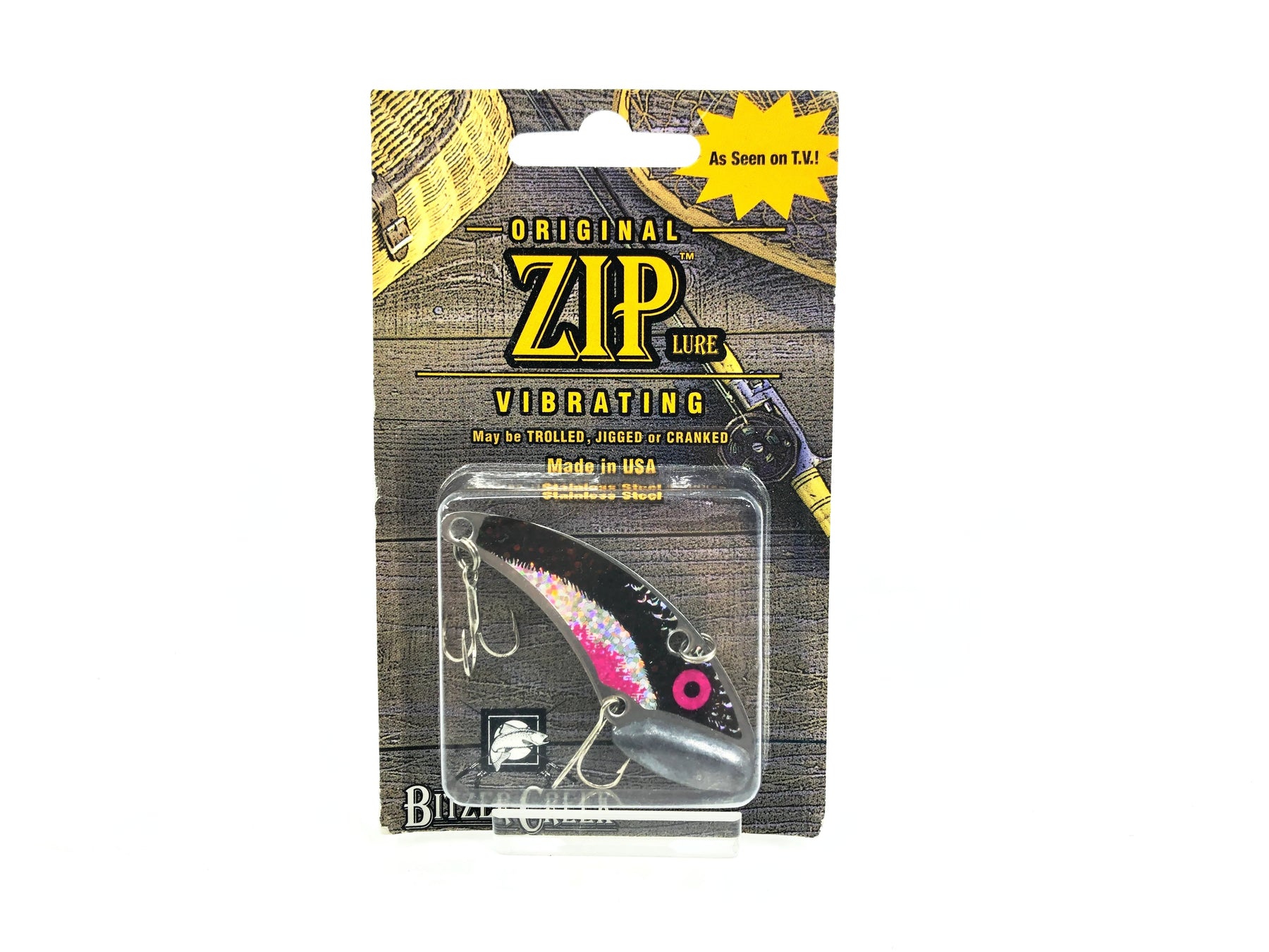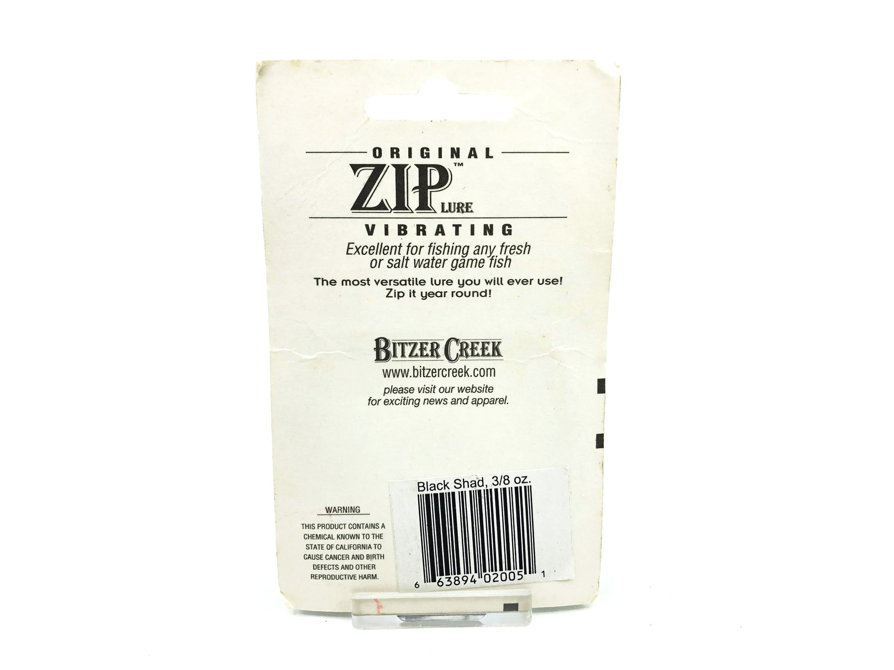 Bitzer Creek Original Zip Lure 3/8oz, Black Shad Color on Card. Great vibrating blade bait. Lure is about 2 3/8" long. New on card and card is in good condition. Great deal here for anyone looking for this discontinued lure. See photos!