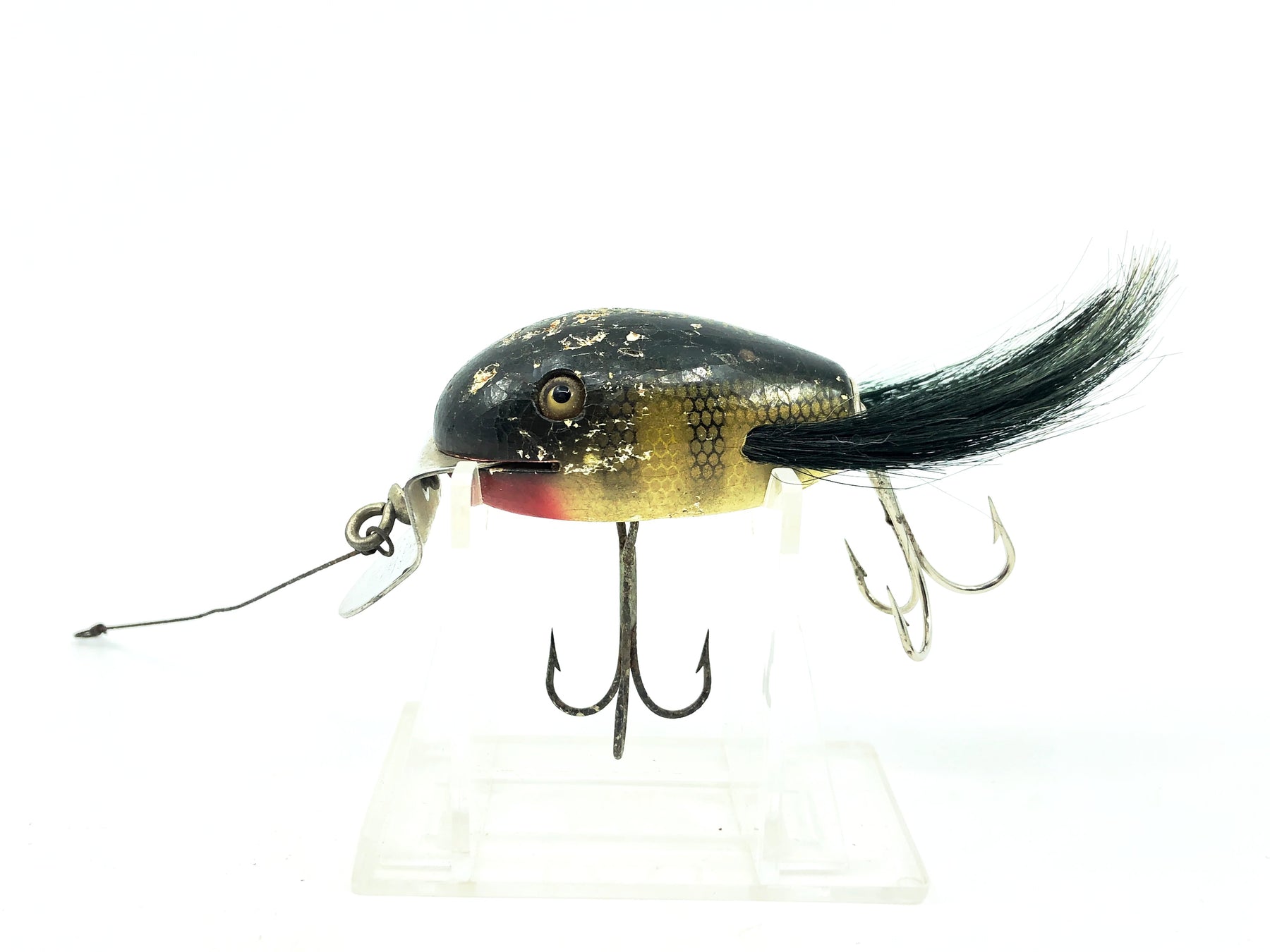 Creek Chub 5100 Dingbat, Perch Color 5101. Made between 1937-1958. Easily one of Creek Chubs most famous and identifiable lures. About 2" long body. This dingbat has some wear and marks on the top but overall ok condition, see photos. Wooden lure, glass eyes. Tough to find. A classic bait!