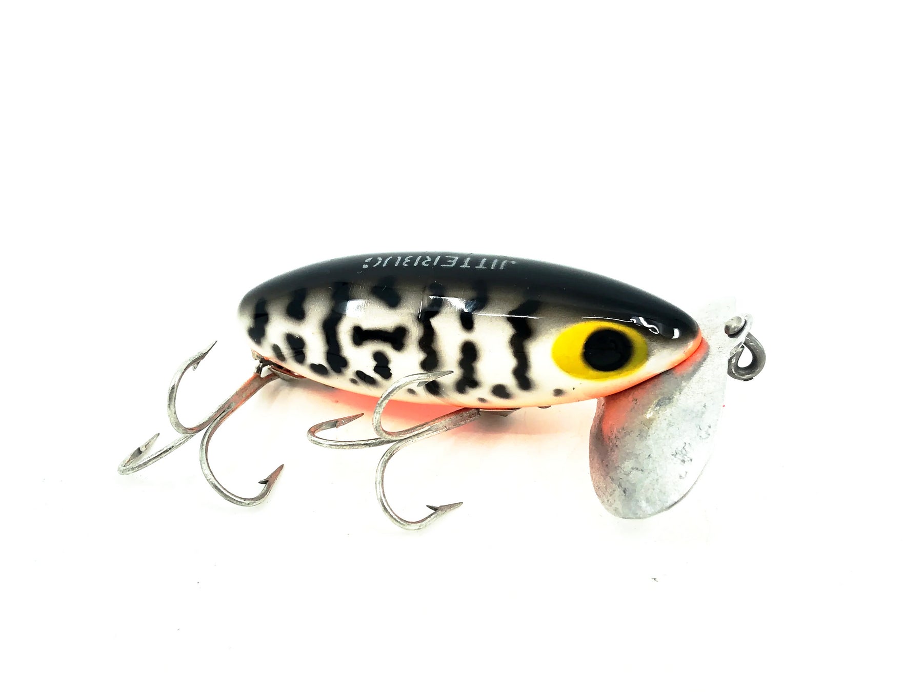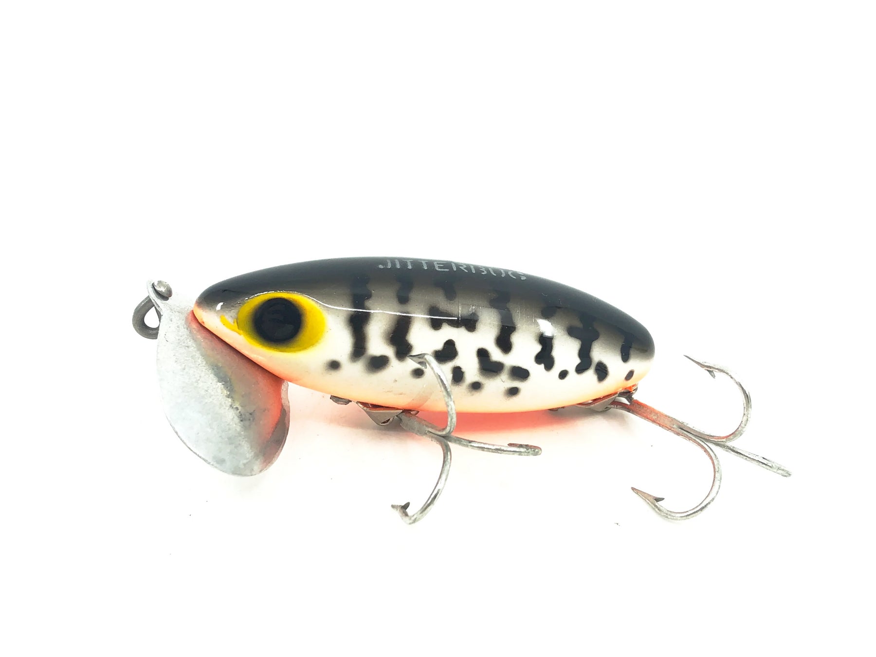 Jitterbug, World's best surface bait! Jitterbugs wobble. . . the double-lobed "lip" creates a loud paddling noise . . . takes bass day or night. Retrieve continuously or by hesitation.