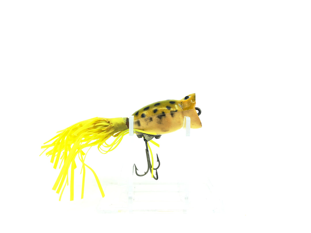 Arbogast Hula Popper Frog Early Plastic. At about 2" long this popper is in good condition aside from some minor wear and waxing. One very notable quality of this lure is the location and condition of the Hula Popper. This lure would be perfect for your display.