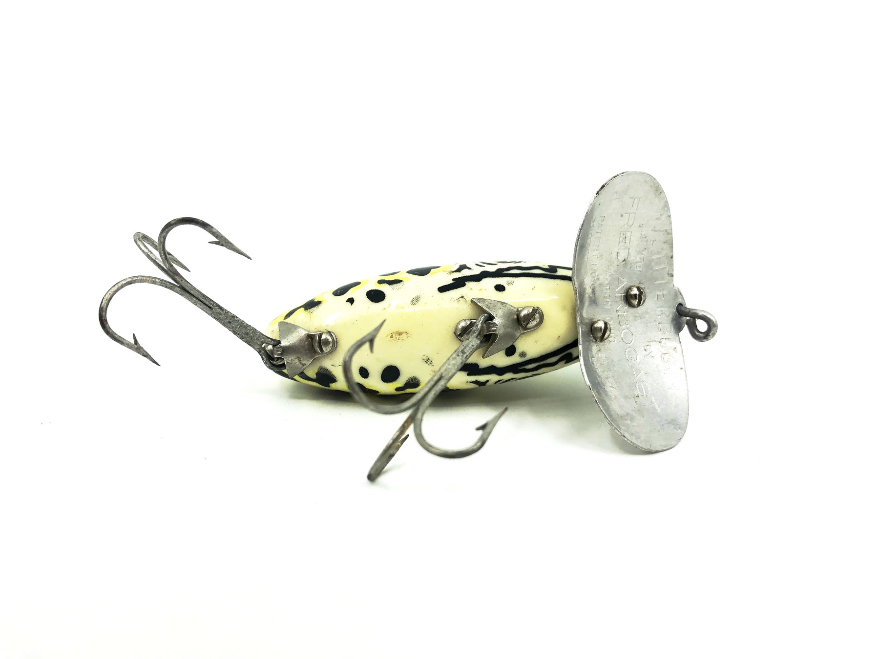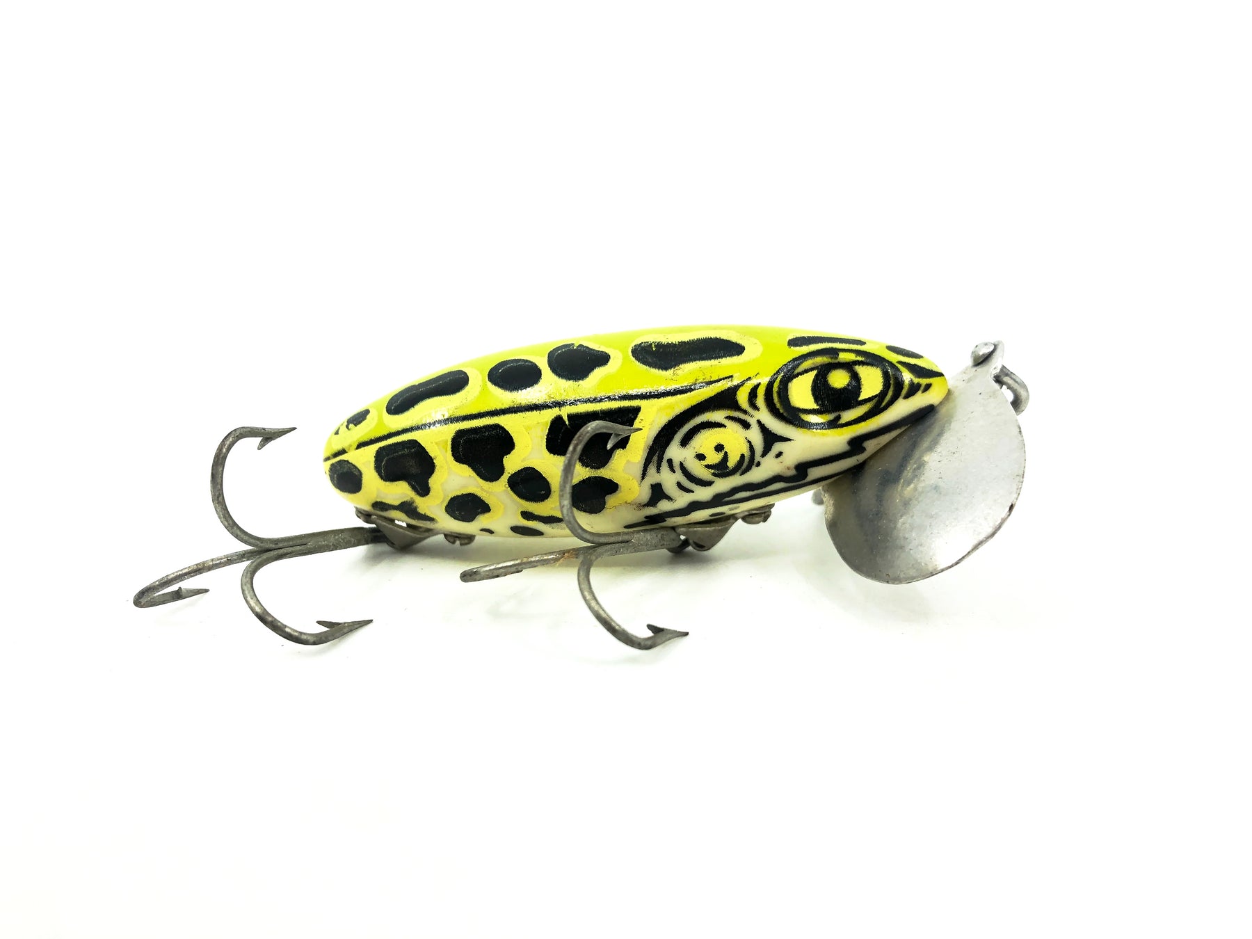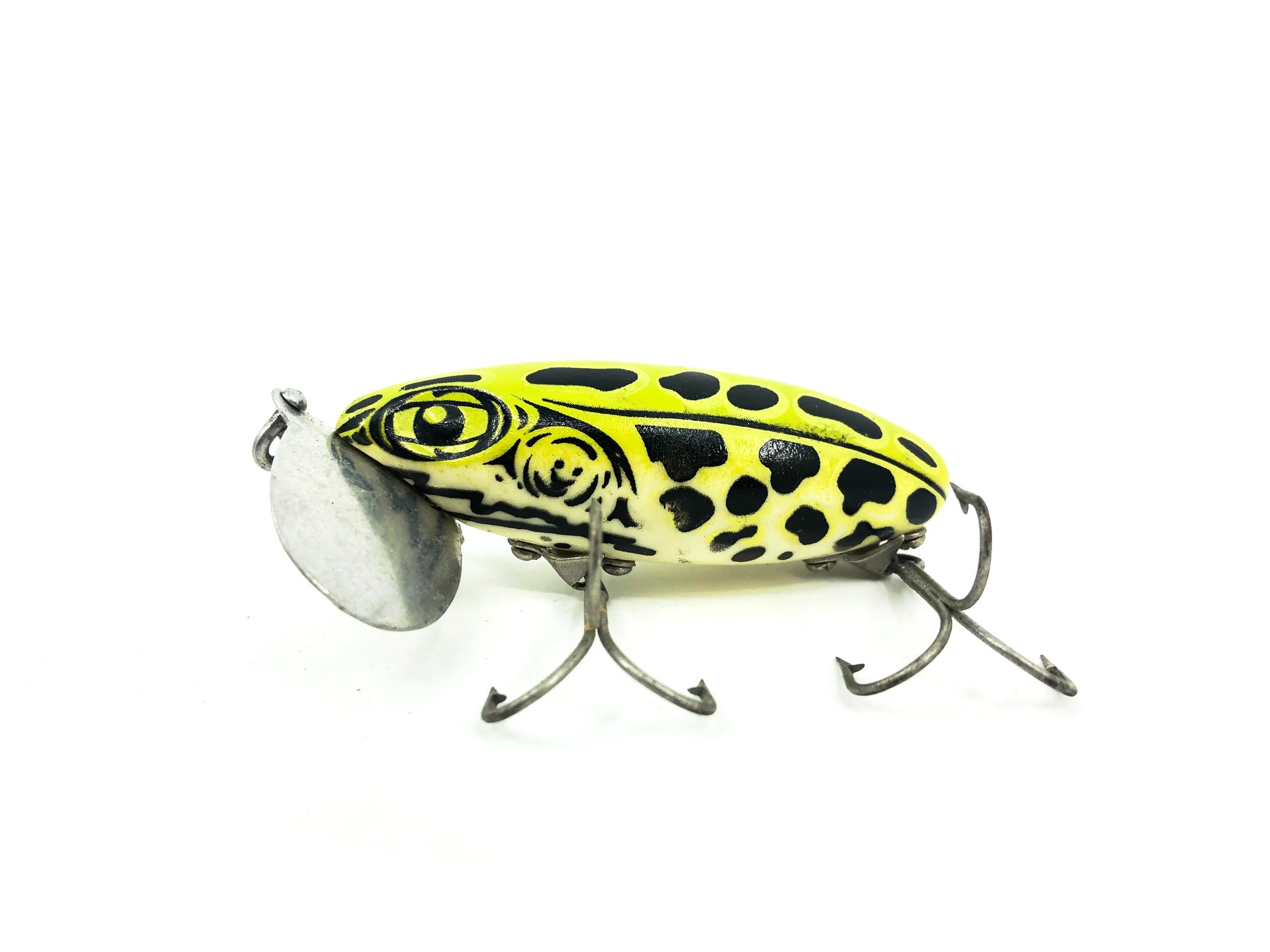 Arbogast Jitterbug 5/8oz, #206 Leopard Frog/White Belly Color, Seein's Believin Model. Body is about 2 5/8" long. Used with some wear and marks but overall good condition. Fish or collect this iconic lure, see photos.