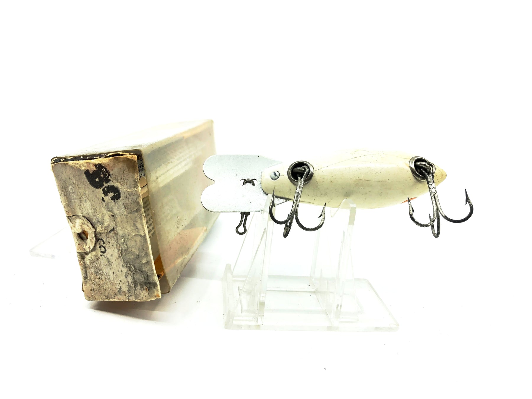 Bomber Wooden 500 Series, #01 White (501). Hard to find matching combo. At about 3 1/2" long this lure is in good condition aside from a few minor blemishes. Box has some wear and one side has significant water damage. One of the all time greatest lures in an iconic color. Fish or collect. See photos.