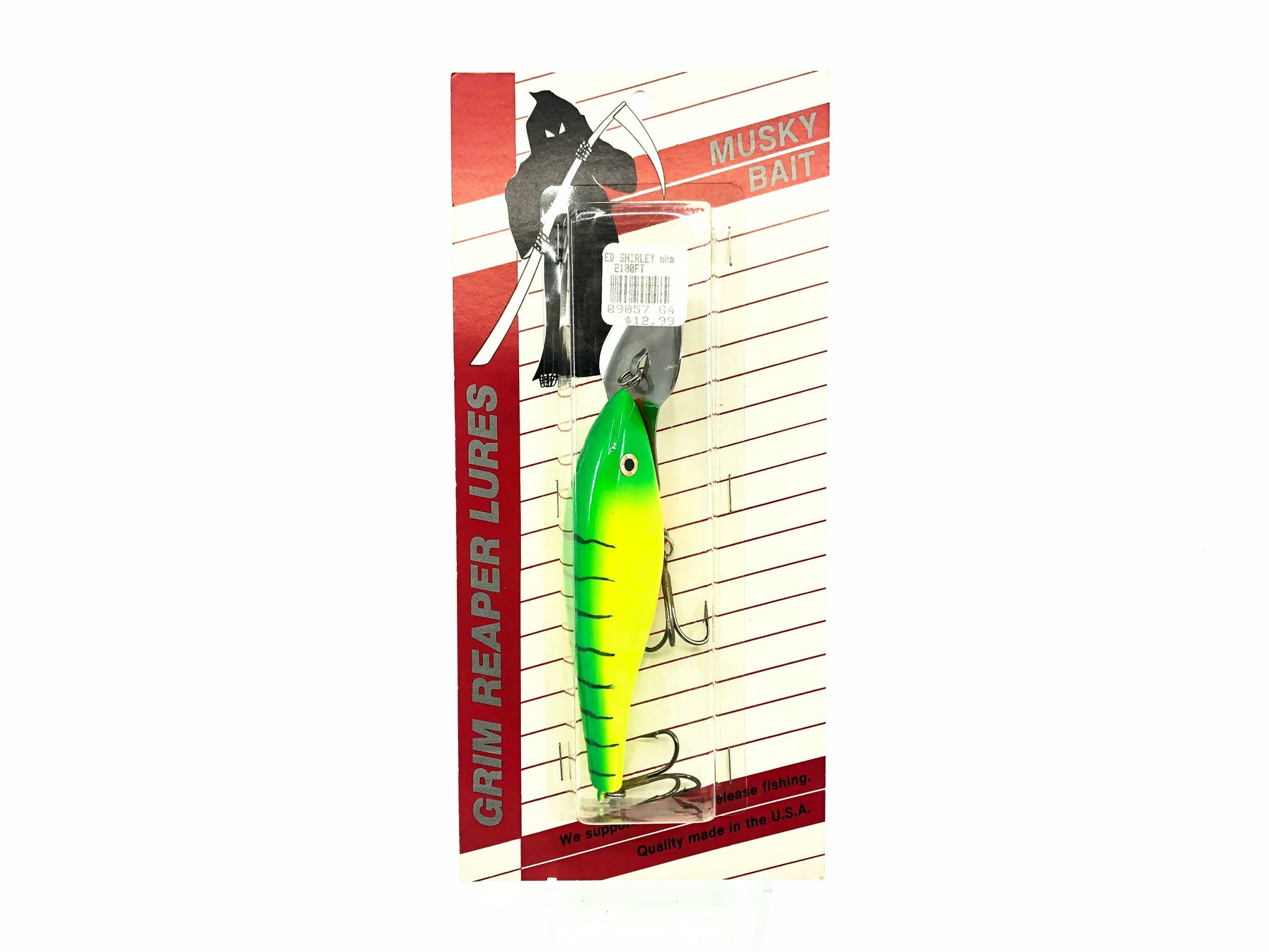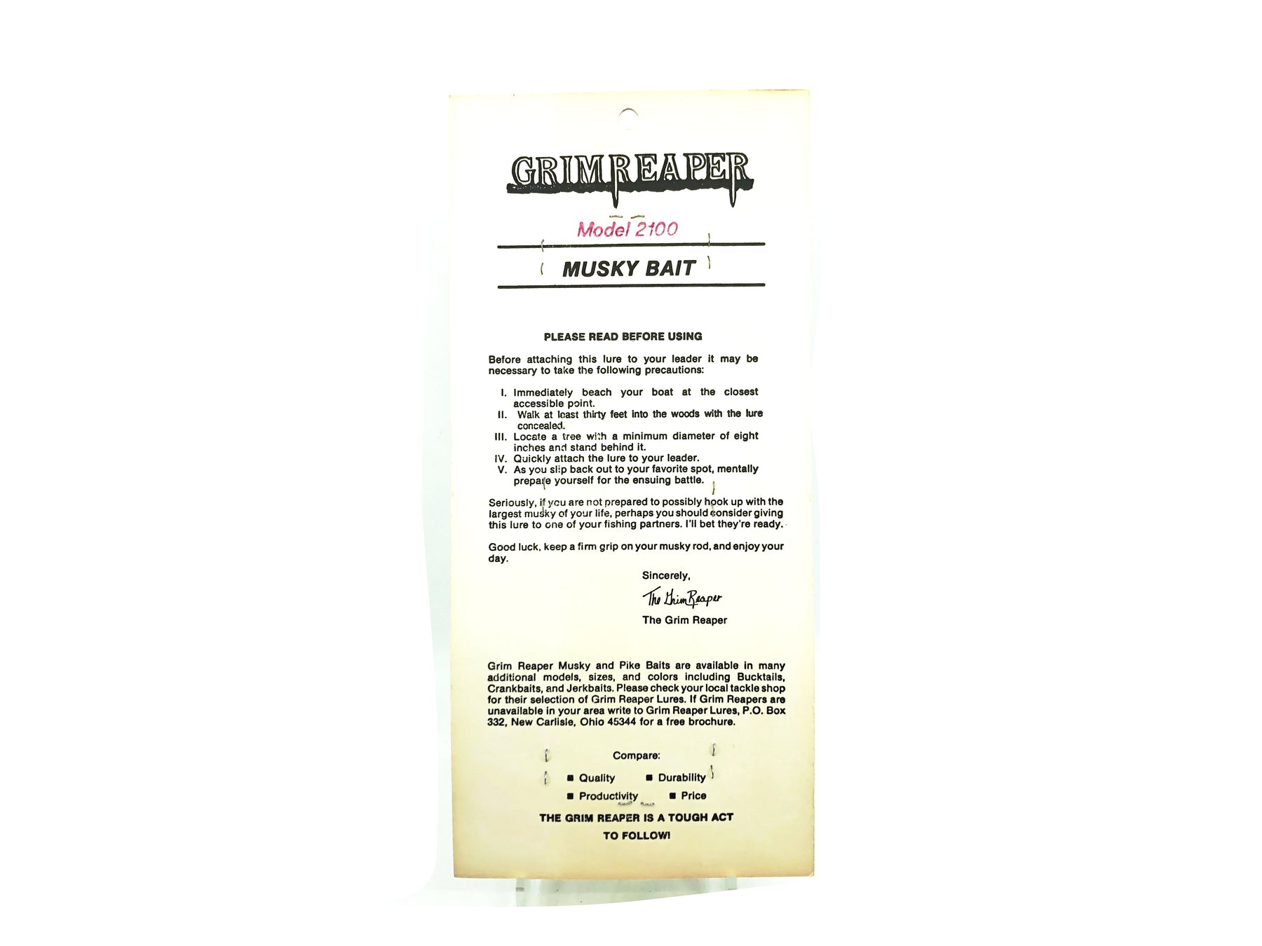 Grim Reaper Musky Model 2100, Firetiger Color on Card. Great vintage wooden Musky bait that hasn't been made in a while. The lure's body is about 5 1/4" long. The card is in great condition and the lure is new on card. Grab this lure while you can, see photos.