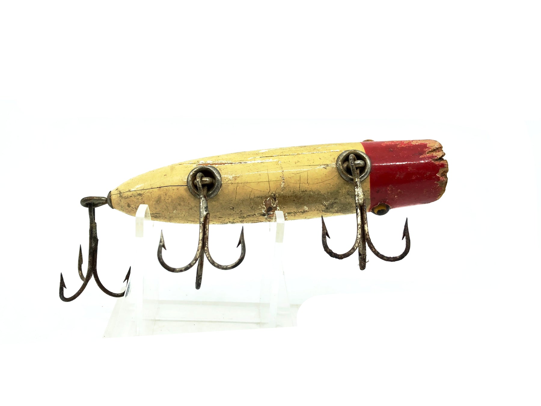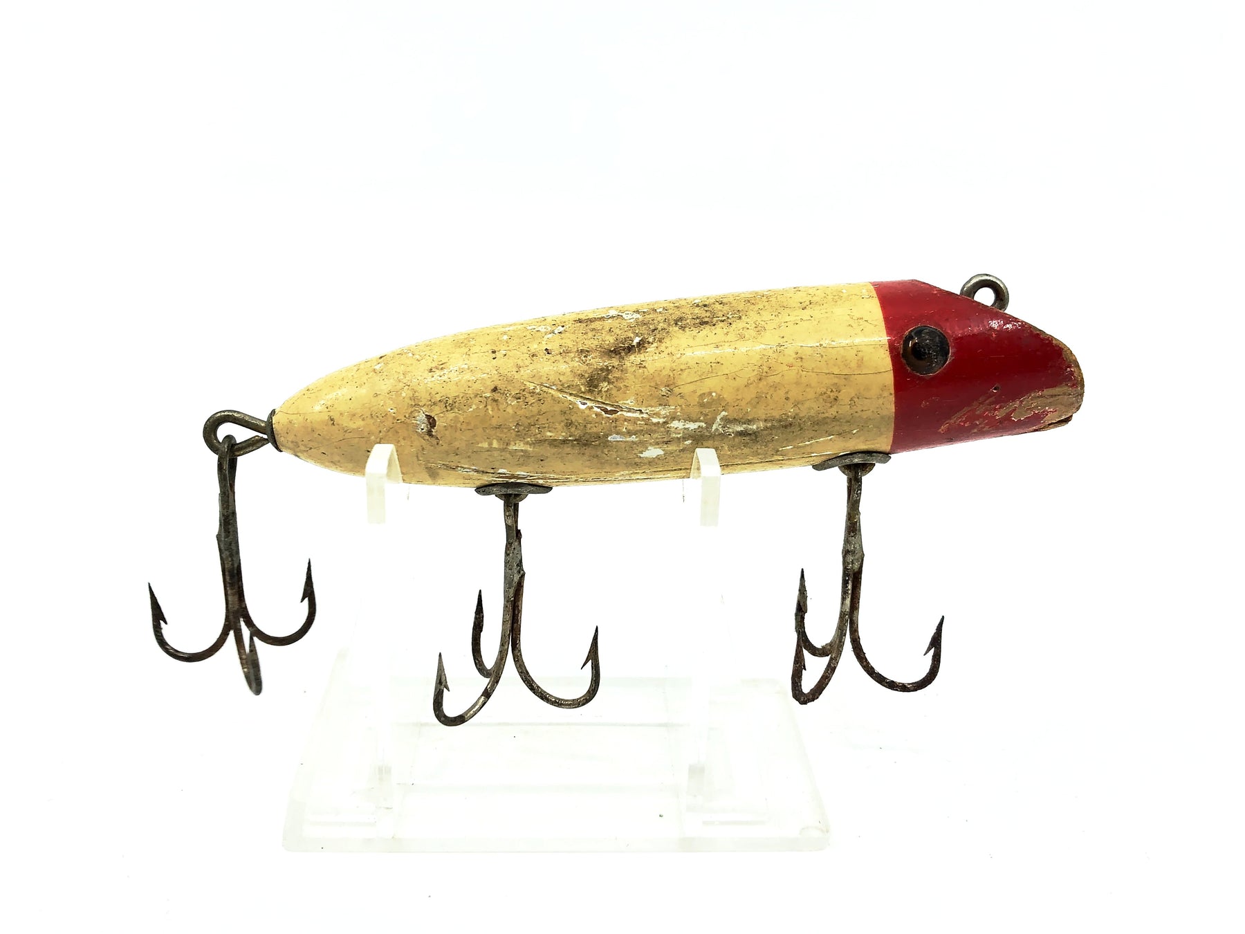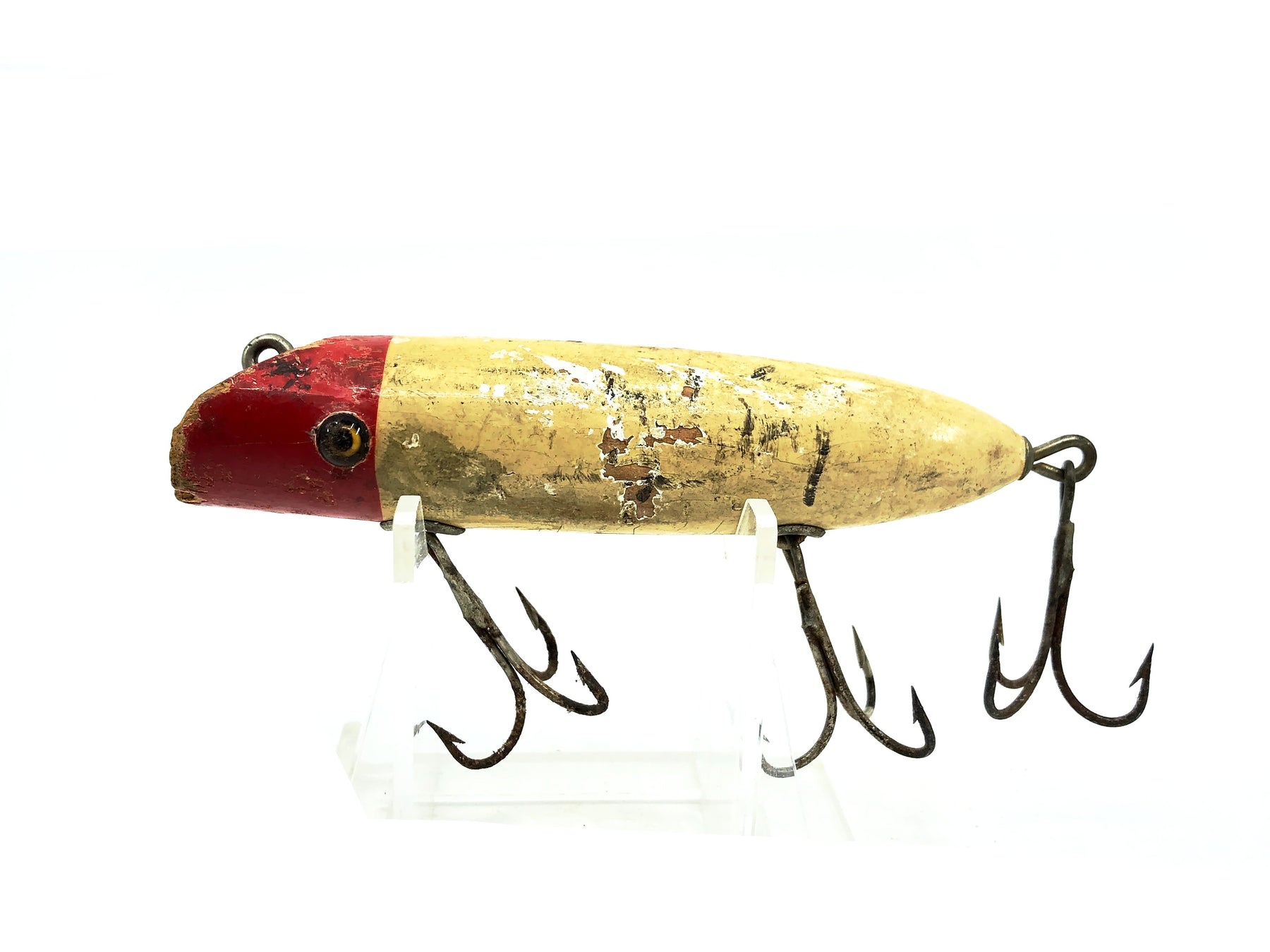 Early South Bend Bass Oreno, Red Head/White Body Color. Vintage wooden lure, with the earliest glass eyes South Bend made. About 3 7/8" long. Used with some wear and marks but overall fair condition, see photos. Fish or collect!