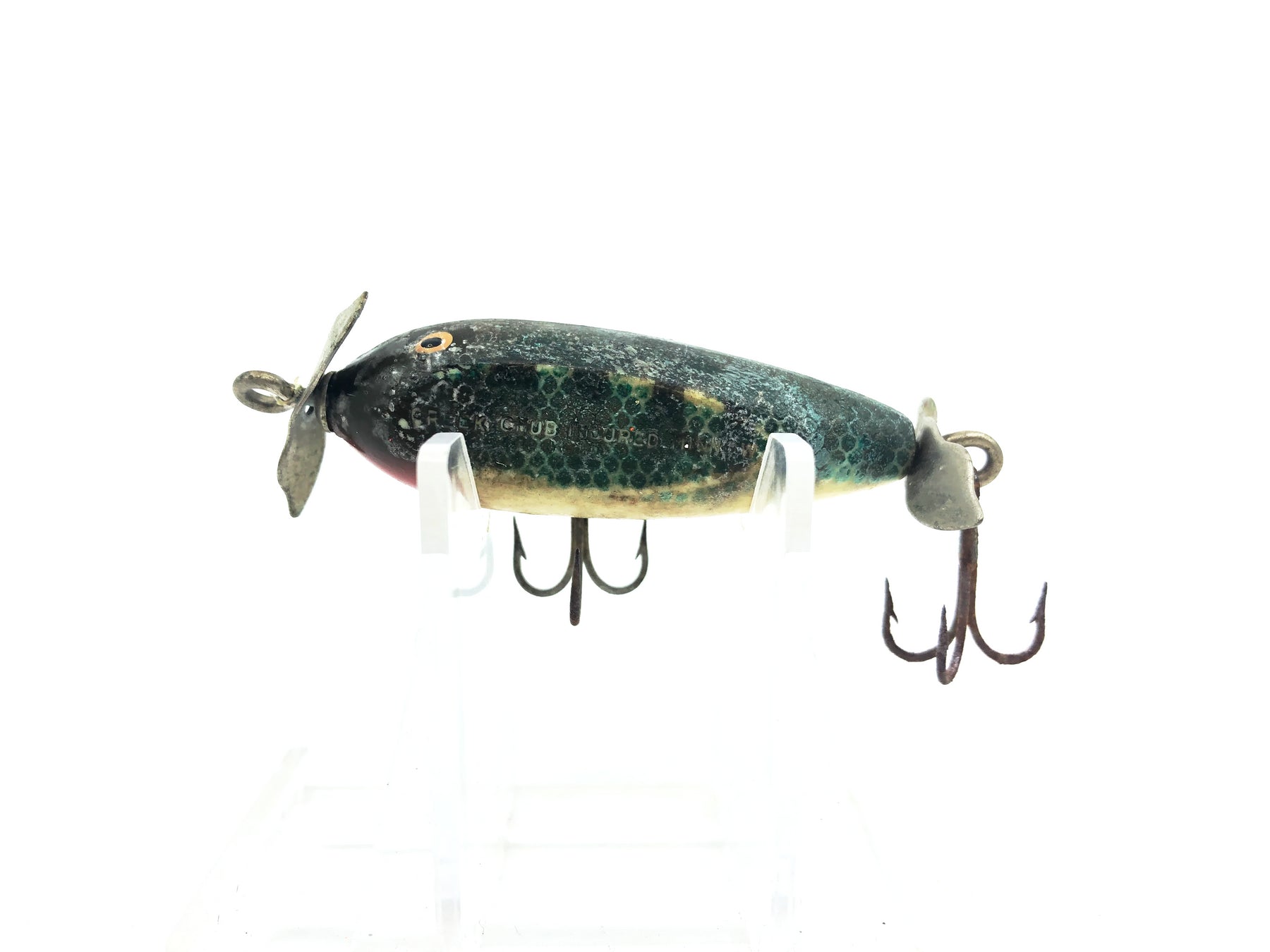 Creek Chub 9500 Spinning Injured Minnow, Frog Color 9519. About 2 1/4" long. Quality plastic lure here. Used with some wear and waxing but overall ok condition, see photos. Great classic bait from the former Creek Chub Bait Company.