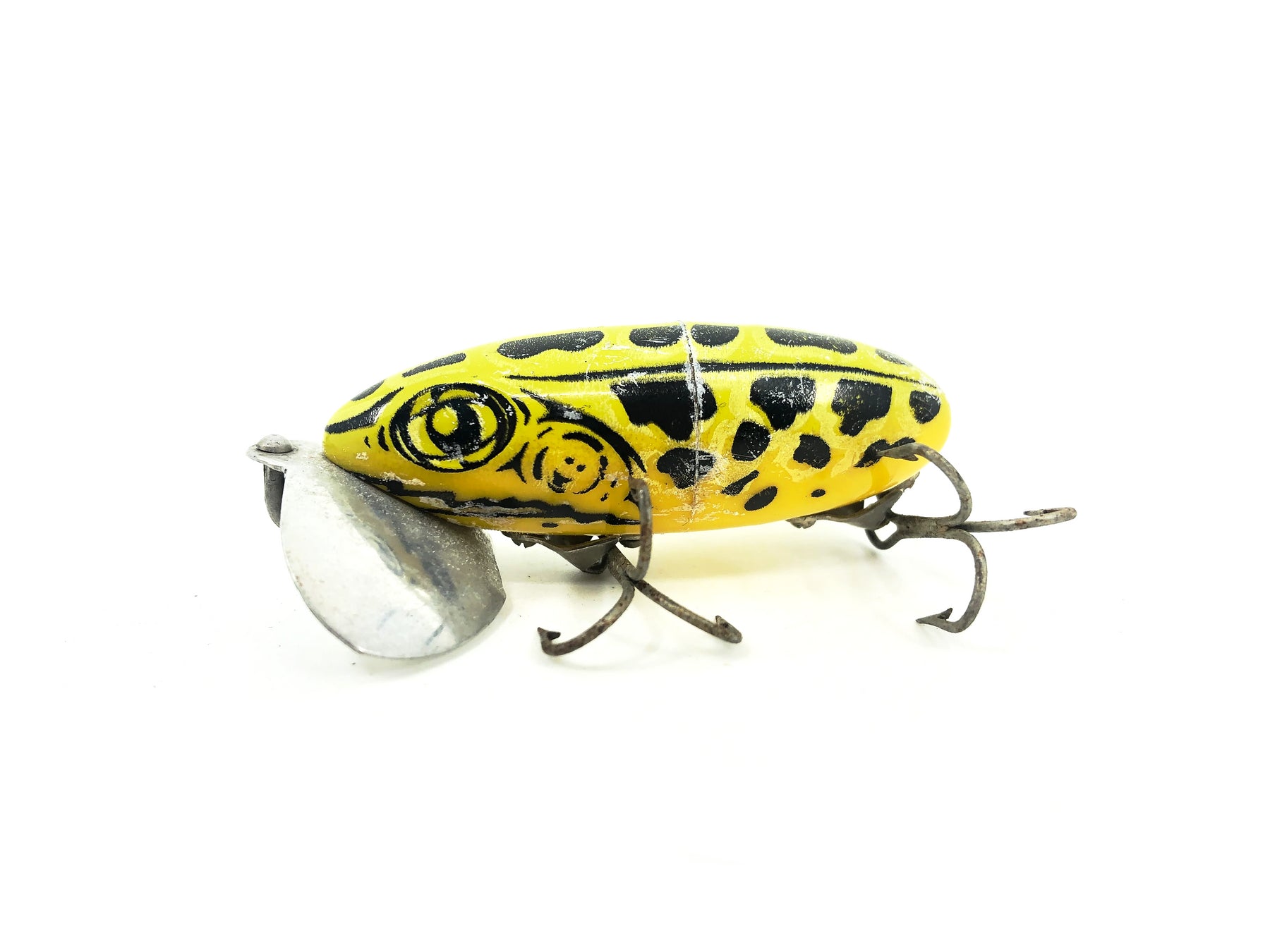 Arbogast Jitterbug 3/8oz, #207 Leopard Frog Color, Seein's Believin Model. Body is about 2 1/4" long. Used with some wear and waxing but in overall good condition. Fish or collect this iconic lure, see photos.