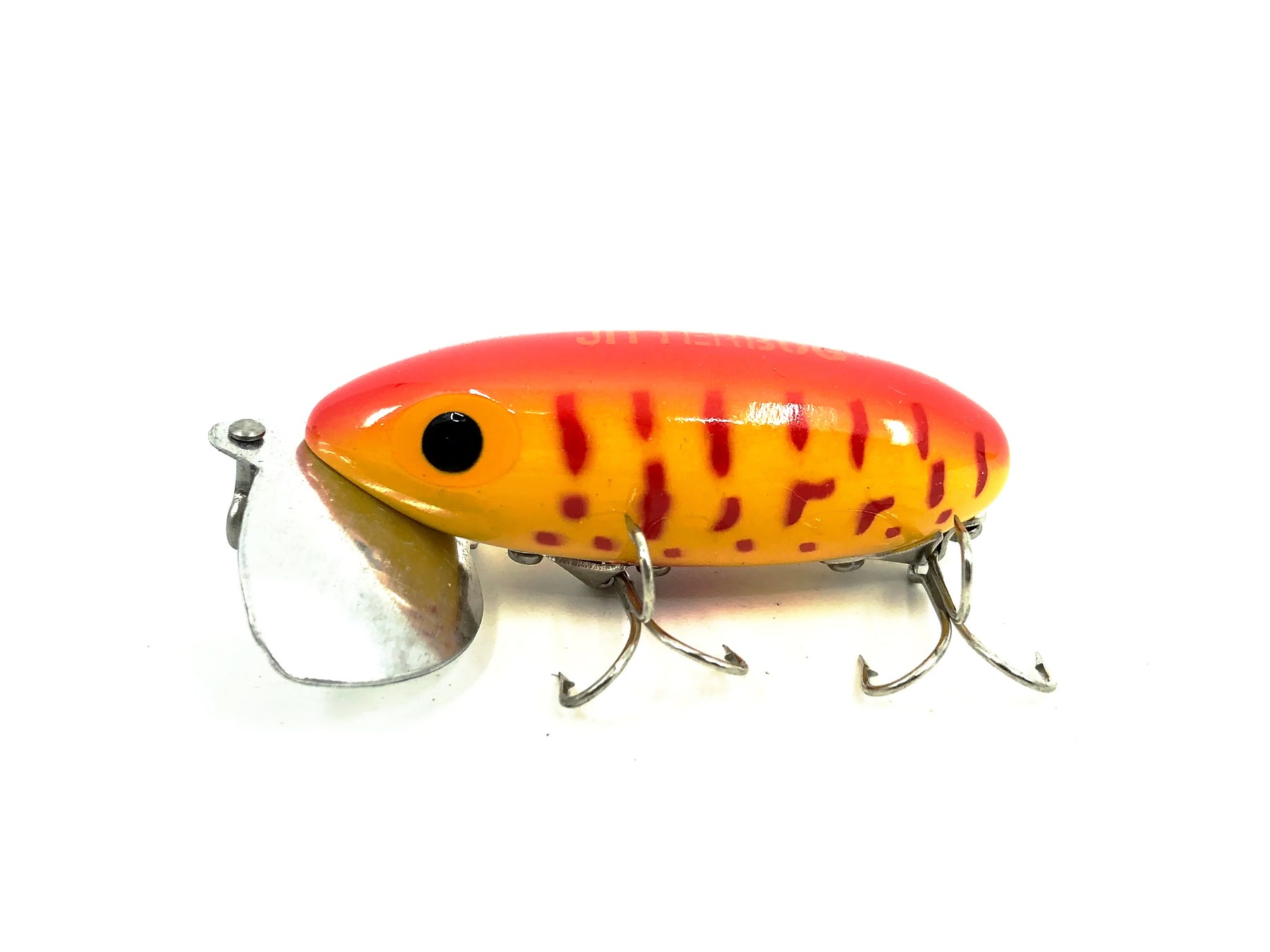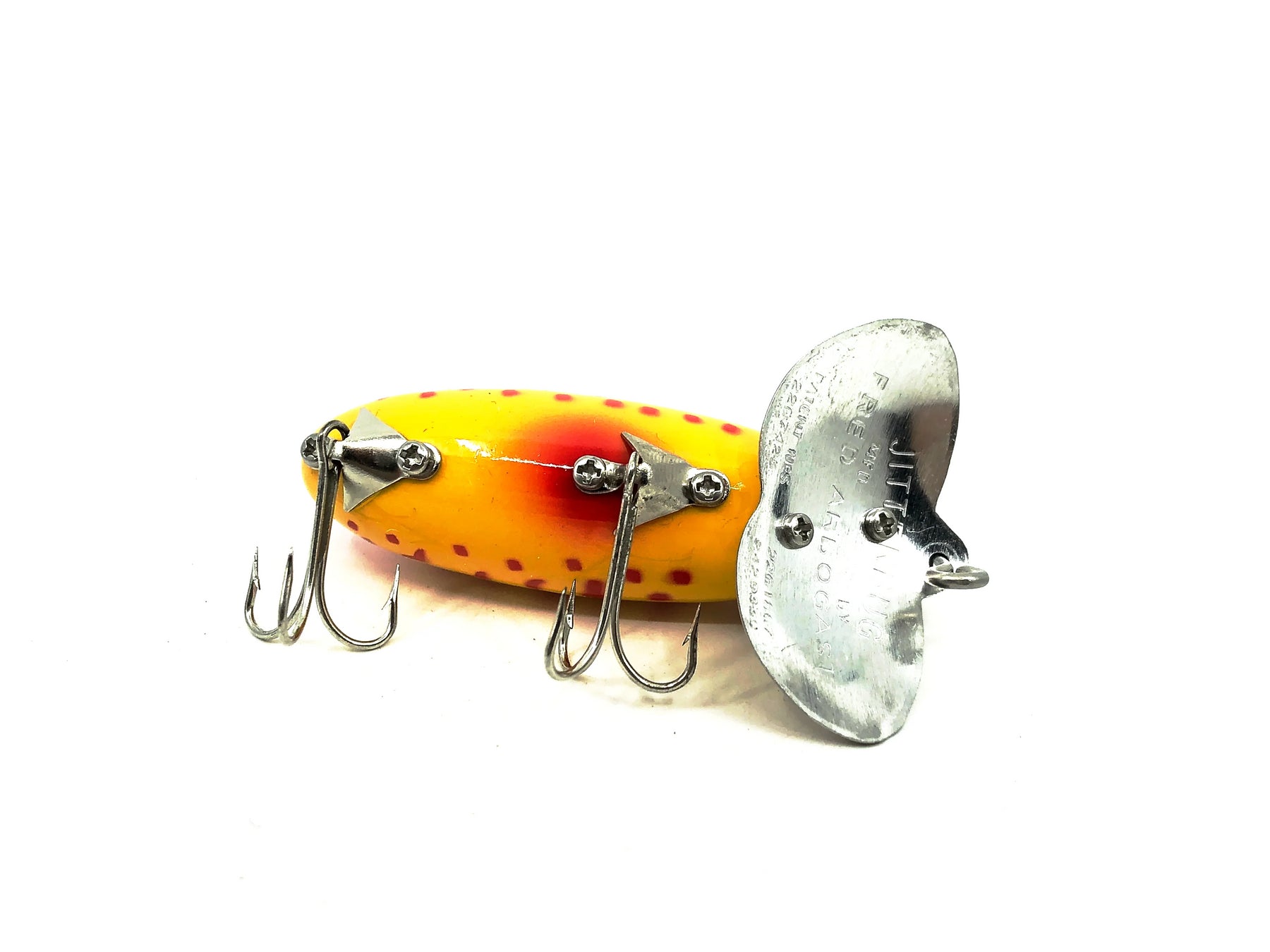 Jitterbug, World's best surface bait! Jitterbugs wobble. . . the double-lobed "lip" creates a loud paddling noise . . . takes bass day or night. Retrieve continuously or by hesitation.