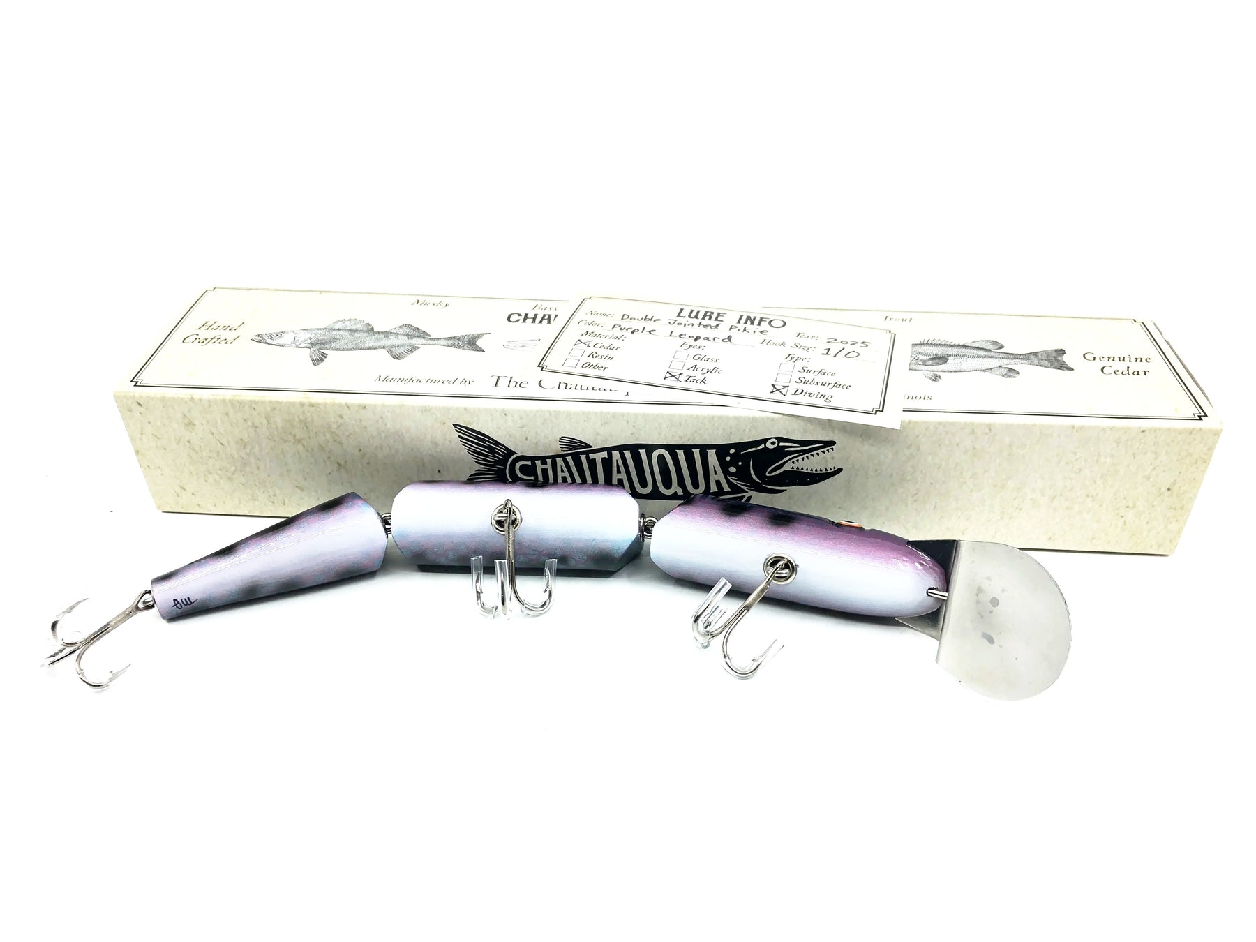 Chautauqua Double Jointed Pikie, Purple Leopard Color.  About 10" long including the diving lip. Quality craftsmanship by the Chautauqua bait company, perfect to fish or collect.  Take a look at the photos and don't hesitate as this one won't last long.