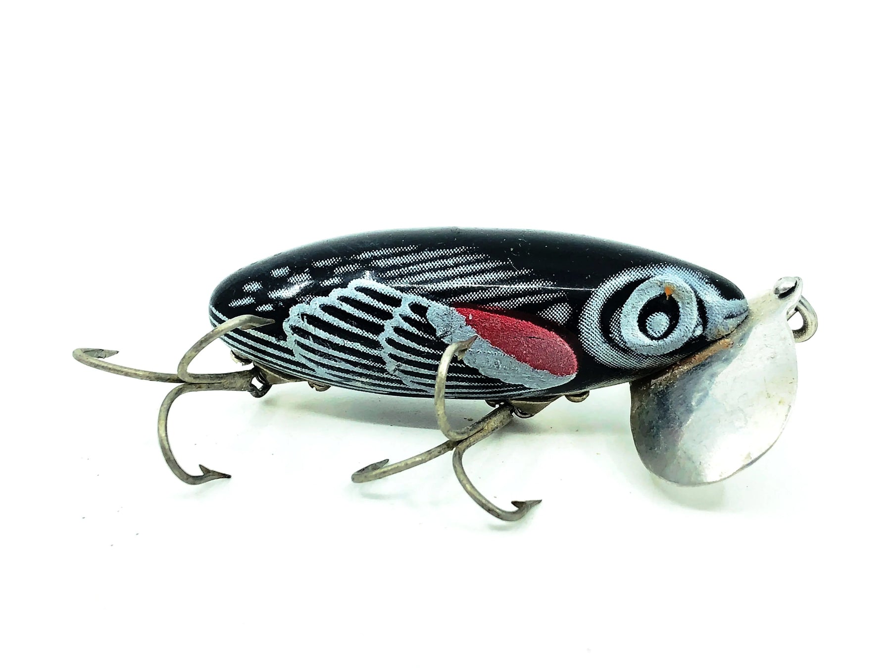 Jitterbug, World's best surface bait! Jitterbugs wobble. . . the double-lobed "lip" creates a loud paddling noise . . . takes bass day or night. Retrieve continuously or by hesitation.