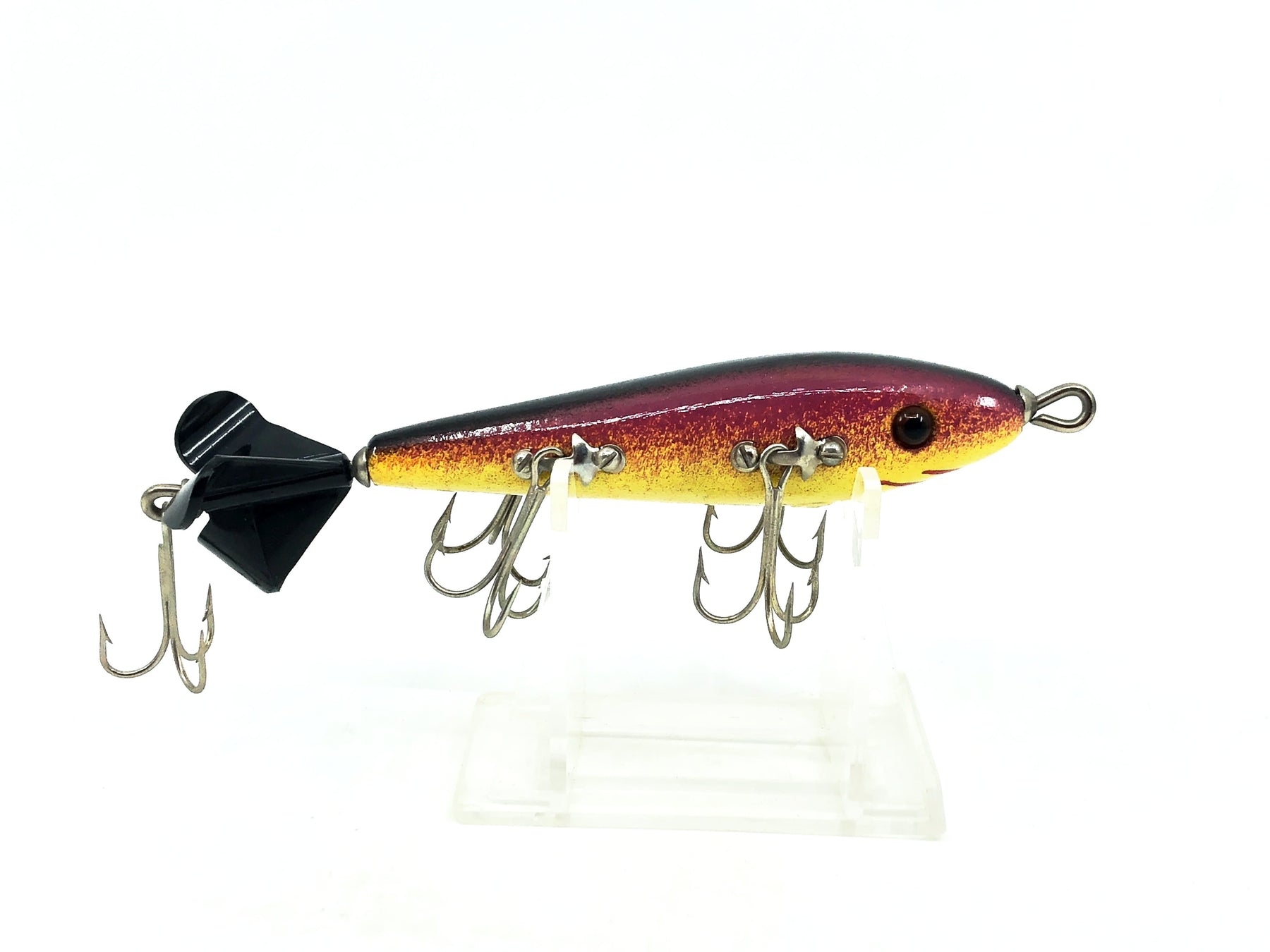 Contemporary Spinning Five Hook Minnow, Purple Crackleback/Yellow Belly Color. Great wooden lure here with glass eyes. This bait from an unknown maker has a 3 1/2" long body. Lure has some very minor wear but in overall great condition. Fish or collect this quality bait.