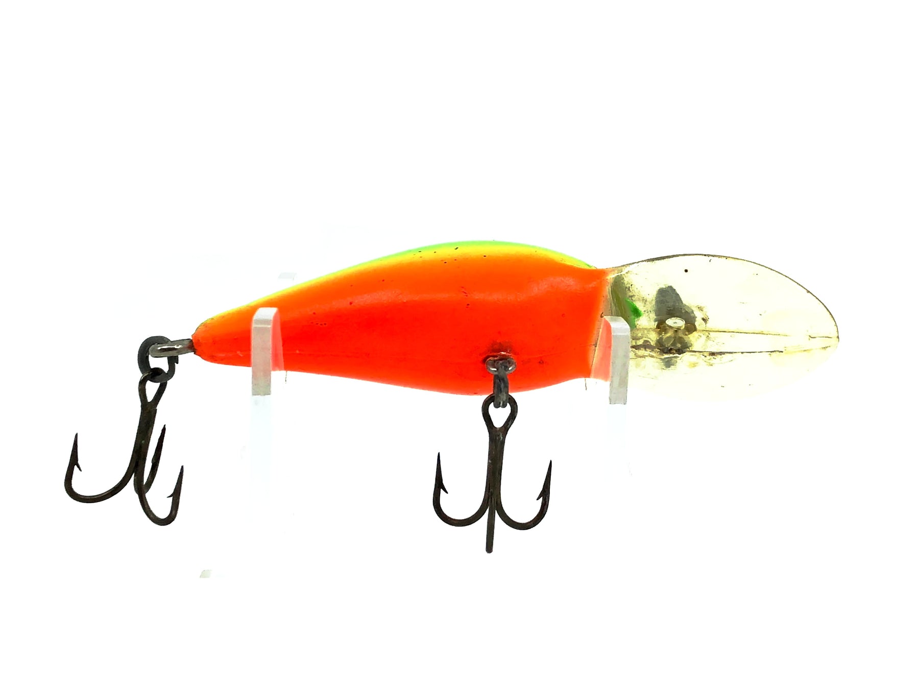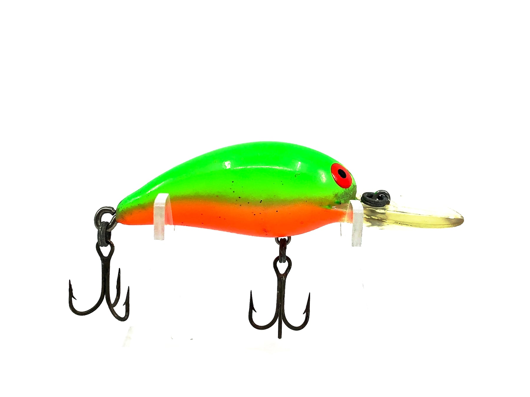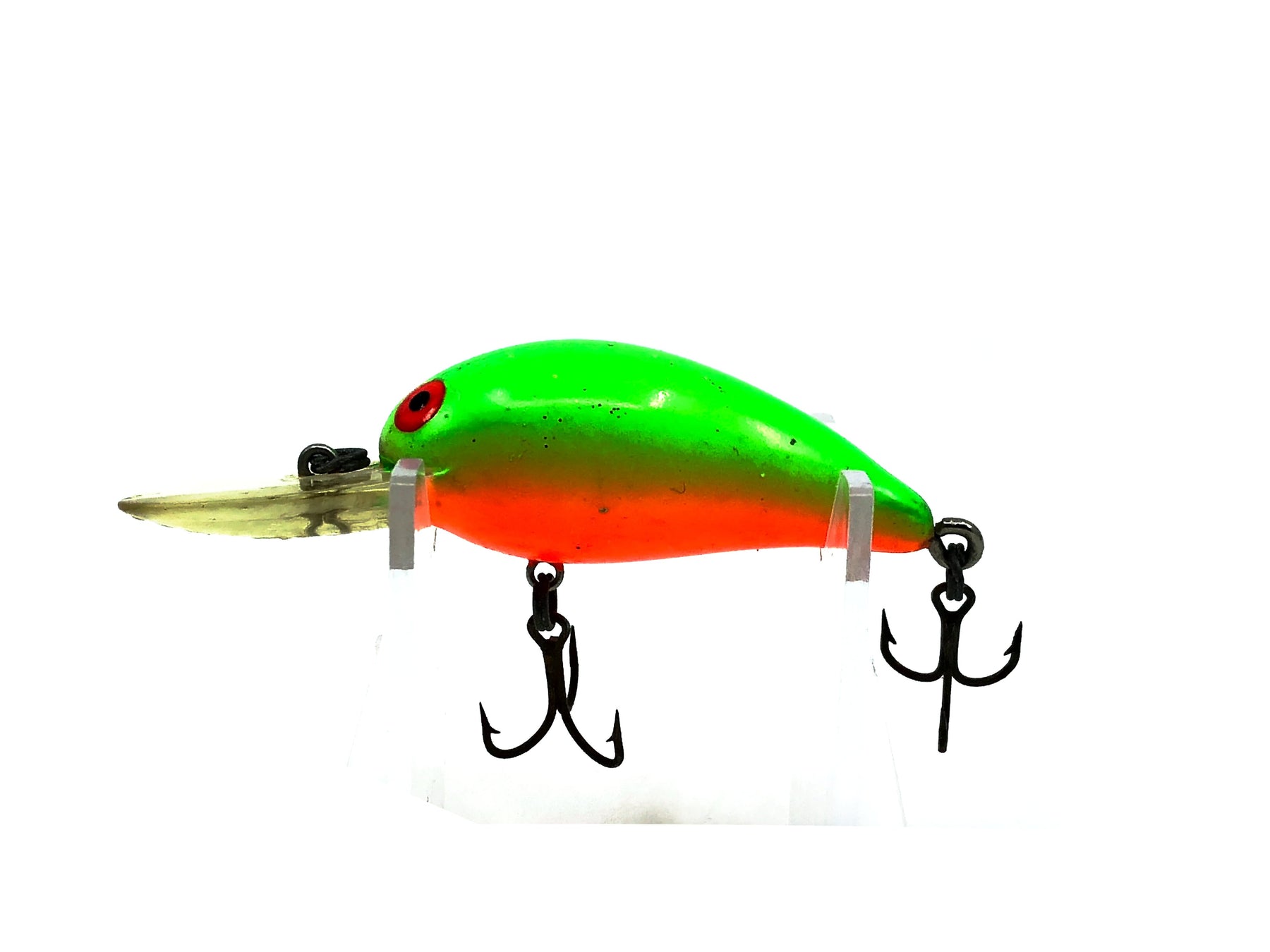 Bomber Model A 6A, Color Clector CC2 Fluorescent Green Over Blaze Orange Color.  About 2 1/8" long excluding lip.  Used with some minor wear but overall good condition, see photos.  Fish or collect!  Great vintage lure!